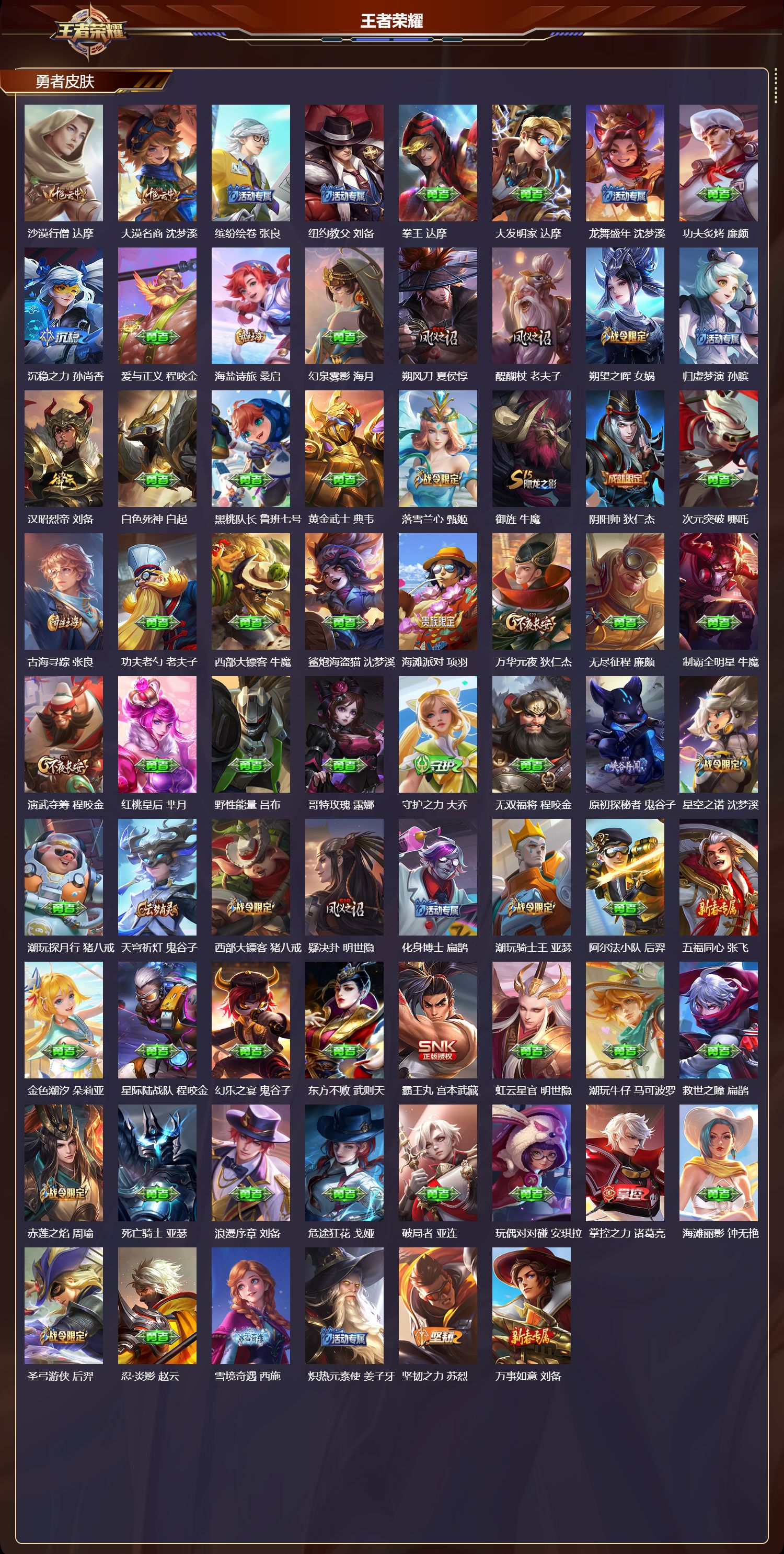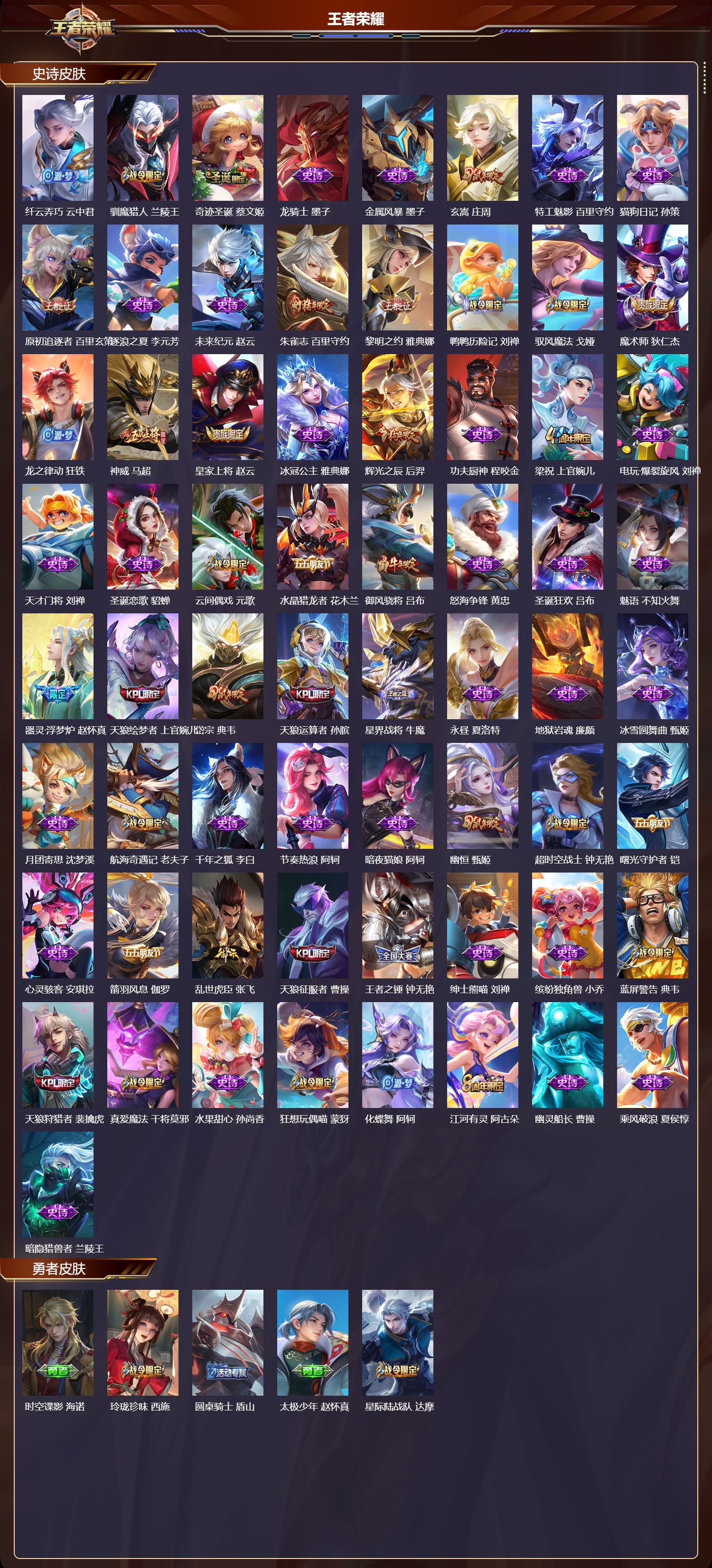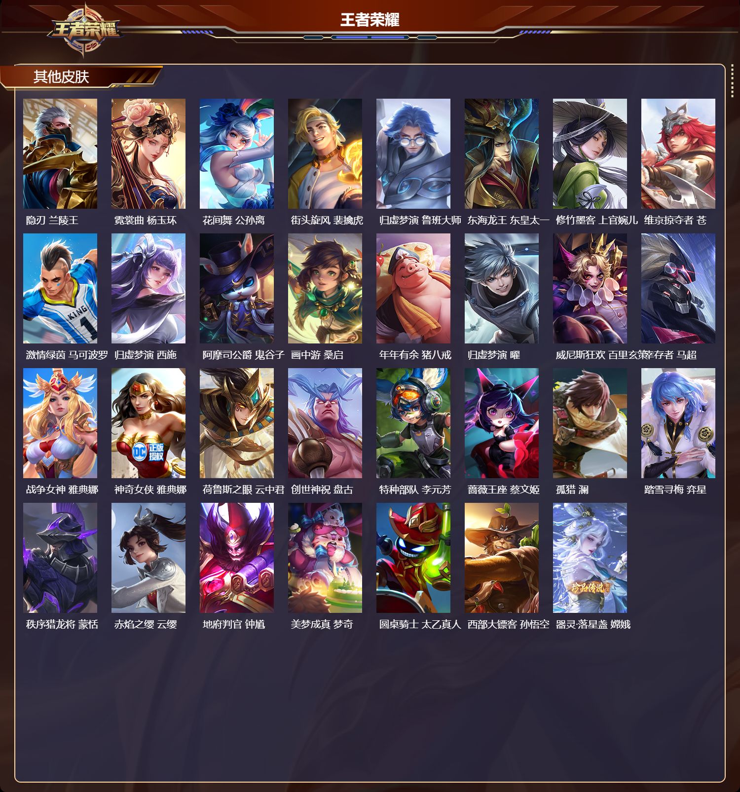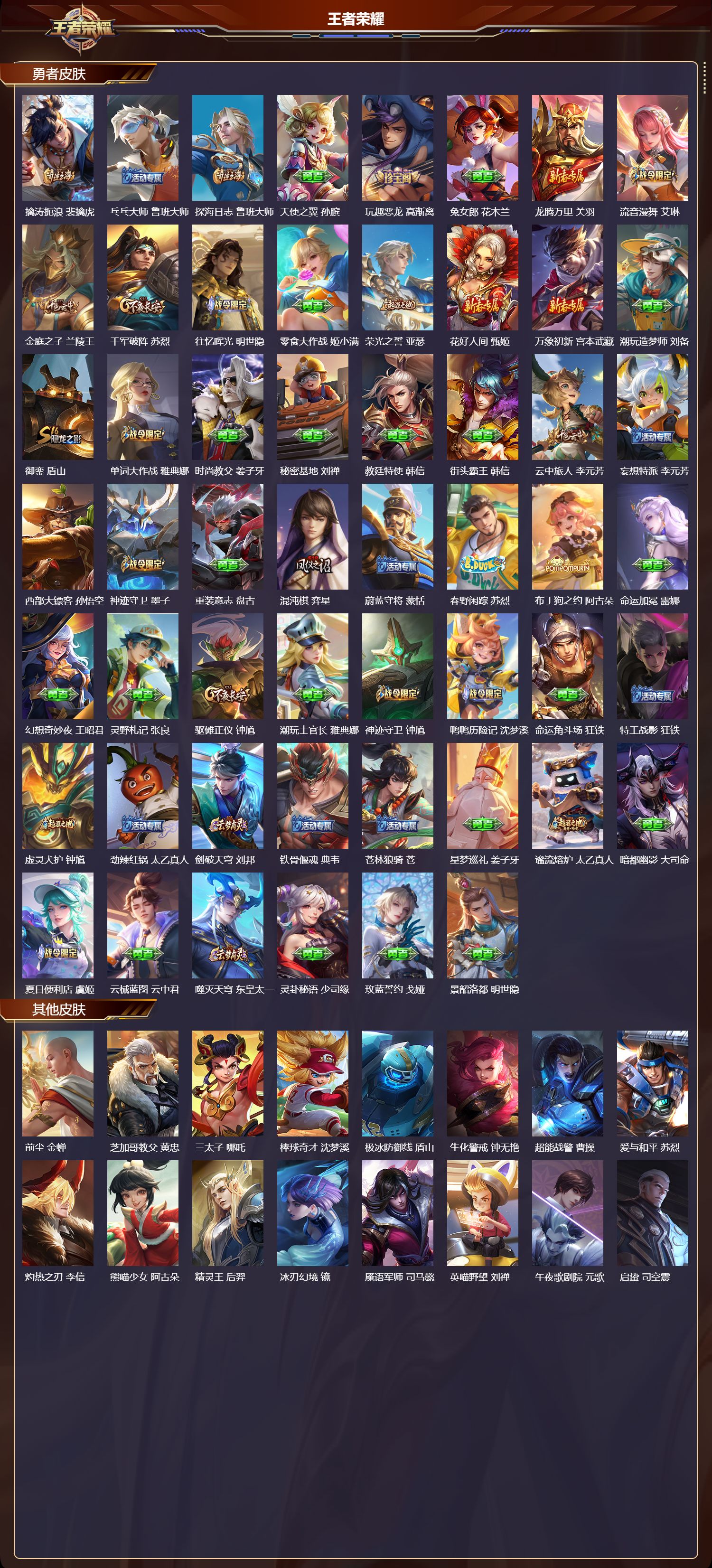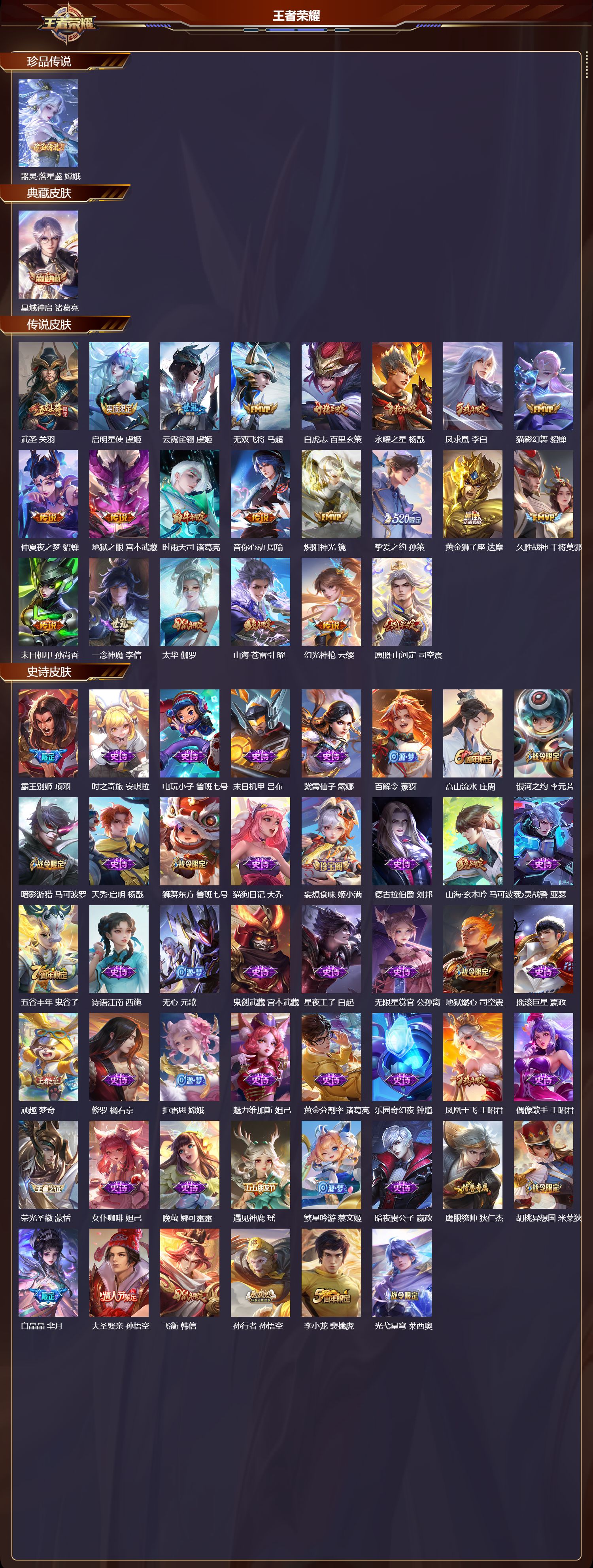 安卓qq/非凡王者/310皮肤/126英雄/1典藏/0珍品无双/0无双/1珍品传说/22传说/111史诗/8稀有英雄【1 珍品传说】器灵·落星盏 嫦娥【1 典藏皮肤】星域神启 诸葛亮【22 传说皮肤】武圣 关羽启明星使 虞姬云霓雀翎 虞姬无双飞将 马超白虎志 百里玄策永曜之星 杨戬凤求凰 李白猫影幻舞 貂蝉仲夏夜之梦 貂蝉地狱之眼 宫本武藏时雨天司 诸葛