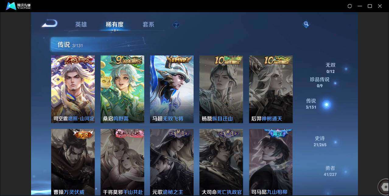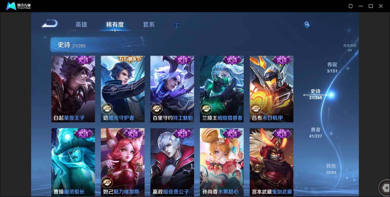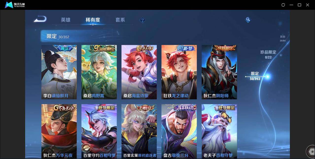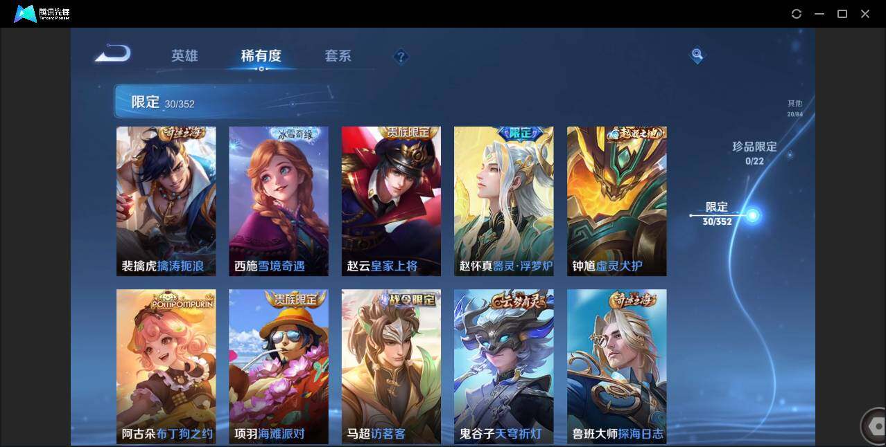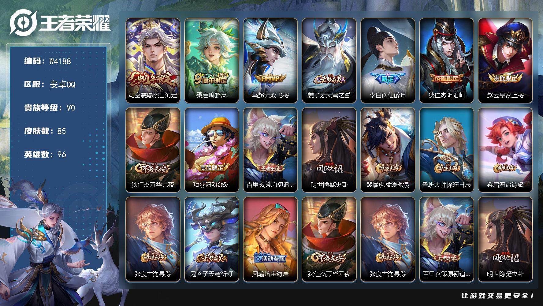 贵族0/皮肤85/传说3/史诗21/英雄96/影全皮/司空震愿照山河定/桑启鸣野蒿/马超无双飞将/姜子牙天穹之誓/李白谪仙醉月/狄仁杰阴阳师/赵云皇家上将/狄仁杰万华元夜/项羽海滩派对/百里玄策原初追逐者/明世隐疑决卦/裴擒虎擒涛扼浪/鲁班大师探海日志/桑启海盐诗旅/张良古海寻踪/鬼谷子天穹祈灯/周瑜熔金海岸/宫本武藏鬼剑武藏/孙尚香水果甜心/嬴政暗夜贵公子/妲己魅力维加斯/曹操幽灵船长/吕布末日机甲/兰陵王暗隐猎兽者/百里守约特工魅影/铠曙光守护者/白起星夜王子/狄仁杰鹰眼统帅/不知火舞魅语/亚连破空之剑/马可波罗星界特工/百里守约百相守梦/孙膑茶境仙/赵怀真器灵浮梦炉/狂铁龙之律动/韩信教廷特使/韩信街头霸王/芈月红桃皇后/孙膑天使之翼/典韦黄金武士/亚瑟死亡骑士/刘备万事如意/后羿阿尔法小队/关羽龙腾万里/孙尚香沉稳之力/露娜瓷语鉴心/蒙恬蔚蓝守将/赵怀真太极少年/李元芳妄想特派/孙悟空神迹守卫/盘古敬我三分/东皇太一噬灭天穹/老夫子百相守梦/干将莫邪雾都夜雨/吕布逐霄战戟/苍苍林狼骑/太乙真人谧流熔炉/典韦铁骨偃魂/马超访茗客/影魅影绮裳/西施雪境奇遇/姜子牙星梦巡礼/明世隐景韶洛都/钟馗虚灵犬护/阿古朵布丁狗之约/鲁班七号福禄兄弟/貂蝉异域舞娘/花木兰剑舞者/老夫子潮流仙人/马可波罗激情绿茵/苍维京掠夺者/大乔伊势巫女/公孙离花间舞/孙策海之征途/盾山极冰防御线/伽罗花见巫女/李信灼热之刃/盘古创世神祝/瑶森/曜归虚梦演/马超幸存者/镜冰刃幻境/澜孤猎/司空震启蛰/暃碧珀绯影