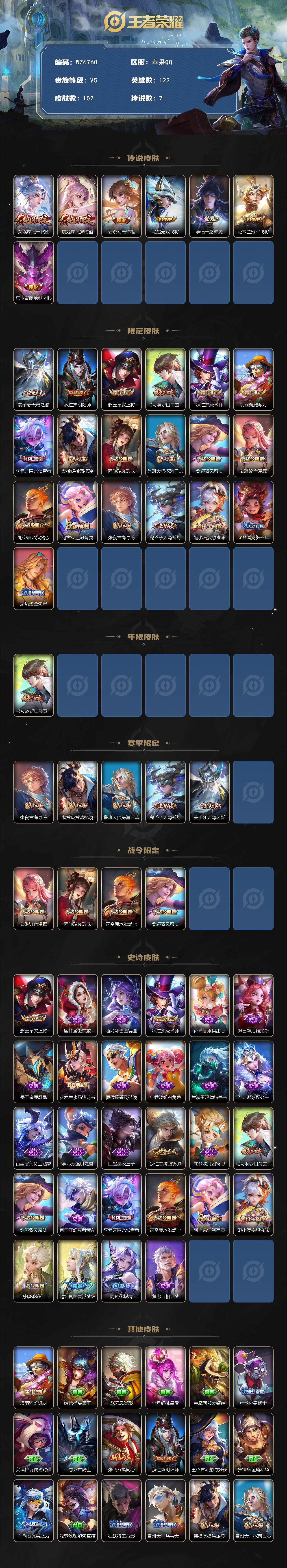 苹果q-v5-尊贵铂金iv段位-123英雄-102皮肤-7传说-28史诗 【传说皮肤】:女娲愿照千秋盛,虞姬愿照岁时盈,云缨幻光神呛,马超无双飞将,李信一念神魔,花木兰冠军飞将,宫本武藏地狱之眼 【限定皮肤】:姜子牙天穹之誓,狄仁杰阴阳师,赵云皇家上将,马可波罗山海玄木吟,狄仁杰魔术师,项羽海滩派对,李元芳匿光侦查者,裴擒虎擒涛扼浪,西施玲珑珍味,鲁班大师探海日志,戈娅驭风魔法,艾琳流音漫舞,司空震地狱燃心,阿古朵江河有灵,张良古海寻踪,鬼谷子天穹祈灯,姬小满妄想食味,沈梦溪龙舞盛年,周瑜熔金海岸 【年限皮肤】:马可波罗山海玄木吟 【赛季限定】:张良古海寻踪,裴擒虎擒涛扼浪,鲁班大师探海日志,鬼谷子天穹祈灯,姜子牙天穹之誓 【战令限定】:艾琳流音漫舞,西施玲珑珍味,司空震地狱燃心,戈娅驭风魔法 【史诗皮肤】:赵云皇家上将,貂蝉圣诞恋歌,甄姬冰雪圆舞曲,狄仁杰魔术师,孙尚香水果甜心,妲己魅力维加斯,墨子金属风暴,花木兰水晶猎龙者,夏侯惇乘风破浪,小乔缤纷独角兽,兰陵王暗隐猎兽者,雅典娜冰冠公主,百里守约特工魅影,李元芳逐浪之夏,白起星夜王子,狄仁杰鹰眼统帅,沈梦溪月团寄思,马可波罗山海玄木吟,戈娅驭风魔法,百里守约真我赫兹,李元芳匿光侦查者,司空震地狱燃心,阿古朵江河有灵,姬小满妄想食味,孙膑茶境仙,赵怀真器灵浮梦炉,阿轲化蝶舞,黄忠百相守梦 【其他皮肤】:项羽海滩派对,韩信街头霸王,赵云忍炎影,芈月红桃皇后,牛魔西部大镖客,扁鹊化身博士,安琪拉玩偶对对碰,亚瑟死亡骑士,张飞五福同心,狄仁杰阴阳师,王昭君幻想奇妙夜,狂铁命运角斗场,孙尚香沉稳之力,沈梦溪鲨炮海盗猫,狂铁特工战影,鲁班大师乓乓大师,裴擒虎擒涛扼浪,鲁班大师探海日志,西施玲珑珍味,李元芳妄想特派,艾琳流音漫舞,张良古海寻踪,钟无艳聚星闪耀,亚连破局者,鬼谷子天穹祈灯,沈梦溪龙舞盛年,大司命暗都幽影,姜子牙天穹之誓,周瑜熔金海岸,苍苍林狼骑,太乙真人谧流熔炉,典韦铁骨偃魂,马超访茗客,西施雪境奇遇,达摩爆裂喵拳,少司缘灵卦秘语,明世隐景韶洛都,戈娅玫蓝誓约,刘备浪漫序章,钟馗虚灵犬护,苏烈春野闲踪,张良灵野札记,阿古朵布丁狗之约,露娜命运加冕,姬小满小满鸭,庄周锦麟游梦,莱西奥踏浪烽翎,艾琳鹤鸣心笺,鲁班七号福禄兄弟,露娜绯红之刃,王昭君精灵公主,孙悟空西部大镖客,夏侯惇战争骑士,太乙真人圆桌骑士,东皇太一东海龙王,干将莫邪第七人偶,百里守约绝影神呛,弈星踏雪寻梅,司马懿魇语军师,沈梦溪棒球奇才,李信灼热之刃,嫦娥露花倒影,瑶森,马超幸存者,蒙恬秩序猎龙将,司空震启蛰,云缨赤焰之缨 【内测皮肤】:狂铁特工战影 【营地id】:1828378394 【小国标】:小国标沈梦溪 【金标】:金标太乙真人,金标甄姬