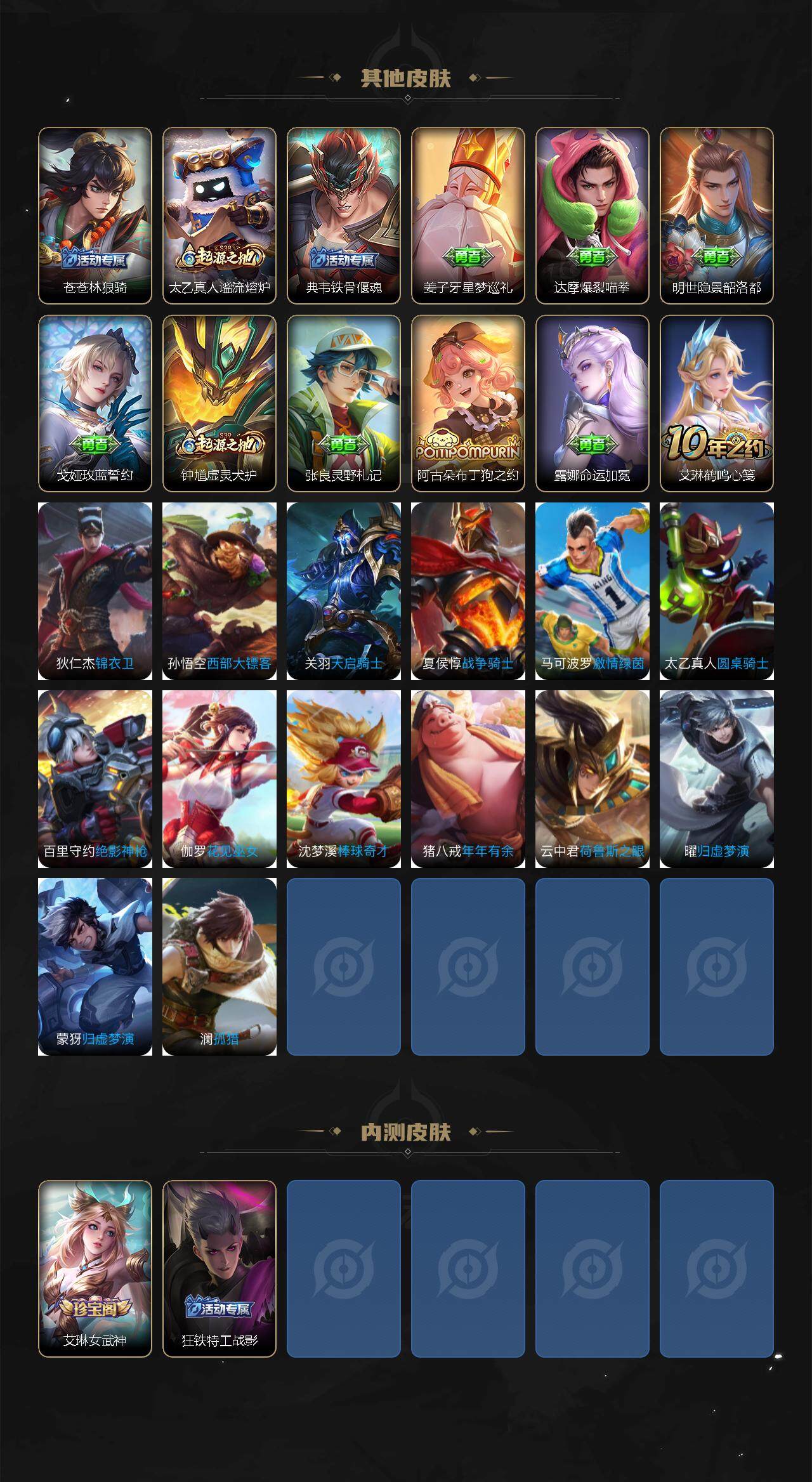 苹果q-v1-荣耀黄金ii段位-113英雄-94皮肤-1珍品传说-6传说-25史诗 【珍品传说】:马可波罗怪盗基德 【传说皮肤】:澜愿照九州拓,桑启鸣野蒿,露娜霜月吟,达摩黄金狮子座,后羿黄金射手座,孙尚香末日机甲 【限定皮肤】:姜子牙天穹之誓,狄仁杰阴阳师,赵云皇家上将,狄仁杰魔术师,项羽海滩派对,裴擒虎李小龙,艾琳女武神,张良古海寻踪,鬼谷子天穹祈灯,伽罗琥珀纪元,沈梦溪龙舞盛年,刘邦剑破天穹,程咬金群星魔术团,周瑜熔金海岸 【赛季限定】:张良古海寻踪,鬼谷子天穹祈灯,刘邦剑破天穹,姜子牙天穹之誓 【史诗皮肤】:露娜紫霞仙子,赵云皇家上将,貂蝉圣诞恋歌,甄姬冰雪圆舞曲,狄仁杰魔术师,宫本武藏鬼剑武藏,孙尚香水果甜心,妲己魅力维加斯,妲己女仆咖啡,墨子金属风暴,花木兰水晶猎龙者,小乔缤纷独角兽,兰陵王暗隐猎兽者,亚瑟心灵战警,刘禅天才门将,李元芳逐浪之夏,阿轲节奏热浪,孙策猫狗日记,伽罗箭羽风息,裴擒虎李小龙,伽罗琥珀纪元,马可波罗星界特工,艾琳陌上桑,赵怀真器灵浮梦炉,阿轲化蝶舞 【其他皮肤】:项羽海滩派对,韩信街头霸王,赵云白执事,芈月红桃皇后,艾琳女武神,武则天东方不败,宫本武藏未来纪元,孙膑天使之翼,亚瑟死亡骑士,达摩拳王,张飞五福同心,狄仁杰阴阳师,刘备纽约教父,孙尚香沉稳之力,李白敏锐之力,吕布野性能量,沈梦溪鲨炮海盗猫,狂铁特工战影,鲁班大师乓乓大师,蒙恬蔚蓝守将,猪八戒潮玩探月行,张良古海寻踪,鬼谷子天穹祈灯,海诺时空谍影,嫦娥漠中幻影,沈梦溪龙舞盛年,钟无艳春野之旅,刘邦剑破天穹,盘古经纬探寻者,程咬金群星魔术团,貂蝉长夏之忆,姜子牙天穹之誓,周瑜熔金海岸,盘古敬我三分,东皇太一噬灭天穹,吕布逐霄战戟,苍苍林狼骑,太乙真人谧流熔炉,典韦铁骨偃魂,姜子牙星梦巡礼,达摩爆裂喵拳,明世隐景韶洛都,戈娅玫蓝誓约,钟馗虚灵犬护,张良灵野札记,阿古朵布丁狗之约,露娜命运加冕,艾琳鹤鸣心笺,狄仁杰锦衣卫,孙悟空西部大镖客,关羽天启骑士,夏侯惇战争骑士,马可波罗激情绿茵,太乙真人圆桌骑士,百里守约绝影神呛,伽罗花见巫女,沈梦溪棒球奇才,猪八戒年年有余,云中君荷鲁斯之眼,曜归虚梦演,蒙犽归虚梦演,澜孤猎 【内测皮肤】:艾琳女武神,狂铁特工战影 【营地id】:1767936066