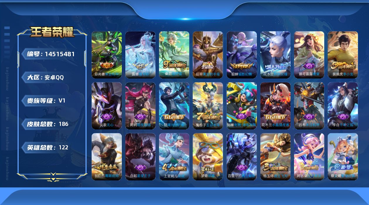 [14515481]【店主推荐捡漏号!可直接换绑】安卓q-v6-荣耀黄金i段位-122英雄-186皮肤-5传说-39史诗 【传说皮肤】:桑启鸣野蒿,露娜霜月吟,貂蝉猫影幻舞,后羿黄金射手座,孙尚香末日机甲 【限定皮肤】:大乔绒语心约,姜子牙天穹之誓,狄仁杰阴阳师,赵云皇家上将,庄周高山流水,元歌无心,夏侯惇朔风刀,典韦穷奇,狄仁杰魔术师,狄仁杰万华元夜,项羽海滩派对,老夫子醍醐杖,兰陵王金庭之子,花木兰默契交锋,牛魔御旌,李元芳云中旅人,杨玉环遇见飞天,蔡文姬繁星吟游,鬼谷子原初探秘者,鬼谷子五谷丰年,弈星混沌棋,梦奇顽趣,沈梦溪大漠名商,明世隐疑决卦,裴擒虎李小龙,裴擒虎擒涛扼浪,狂铁御狮,米莱狄御霄,盾山御銮,上官婉儿梁祝,鲁班大师探海日志,桑启海盐诗旅,艾琳女武神,阿古朵江河有灵,张良古海寻踪,蒙犽百解令,蒙恬荣光圣徽,鬼谷子天穹祈灯,沈梦溪龙舞盛年,刘邦剑破天穹,程咬金群星魔术团,关羽决胜骁骑,周瑜熔金海岸 【赛季限定】:夏侯惇朔风刀,典韦穷奇,狄仁杰万华元夜,老夫子醍醐杖,兰陵王金庭之子,张良古海寻踪,牛魔御旌,李元芳云中旅人,鬼谷子原初探秘者,弈星混沌棋,梦奇顽趣,沈梦溪大漠名商,明世隐疑决卦,裴擒虎擒涛扼浪,狂铁御狮,米莱狄御霄,盾山御銮,鲁班大师探海日志,桑启海盐诗旅,鬼谷子天穹祈灯,蒙恬荣光圣徽,刘邦剑破天穹,姜子牙天穹之誓 【史诗皮肤】:阿轲暗夜猫娘,赵云皇家上将,赵云未来纪元,狄仁杰魔术师,廉颇地狱岩魂,宫本武藏鬼剑武藏,孙尚香水果甜心,嬴政摇滚巨星,妲己魅力维加斯,李白千年之狐,吕布末日机甲,张飞乱世虎臣,花木兰水晶猎龙者,刘邦德古拉伯爵,小乔缤纷独角兽,兰陵王暗隐猎兽者,雅典娜冰冠公主,百里守约特工魅影,铠曙光守护者,李元芳逐浪之夏,白起星夜王子,杨玉环遇见飞天,伽罗箭羽风息,狄仁杰鹰眼统帅,上官婉儿梁祝,蔡文姬繁星吟游,娜可露露晚萤,裴擒虎李小龙,花木兰默契交锋,庄周高山流水,鬼谷子五谷丰年,元歌无心,梦奇顽趣,刘禅电玩爆裂旋风,阿古朵江河有灵,蒙犽百解令,蒙恬荣光圣徽,关羽决胜骁骑,牛魔星界战将 【其他皮肤】:项羽海滩派对,韩信教廷特使,韩信街头霸王,阿轲爱心护理,赵云白执事,芈月红桃皇后,艾琳女武神,白起白色死神,扁鹊化身博士,宫本武藏未来纪元,孙膑天使之翼,妲己少女阿狸,典韦黄金武士,亚瑟死亡骑士,达摩拳王,花木兰兔女郎,张飞五福同心,甄姬花好人间,