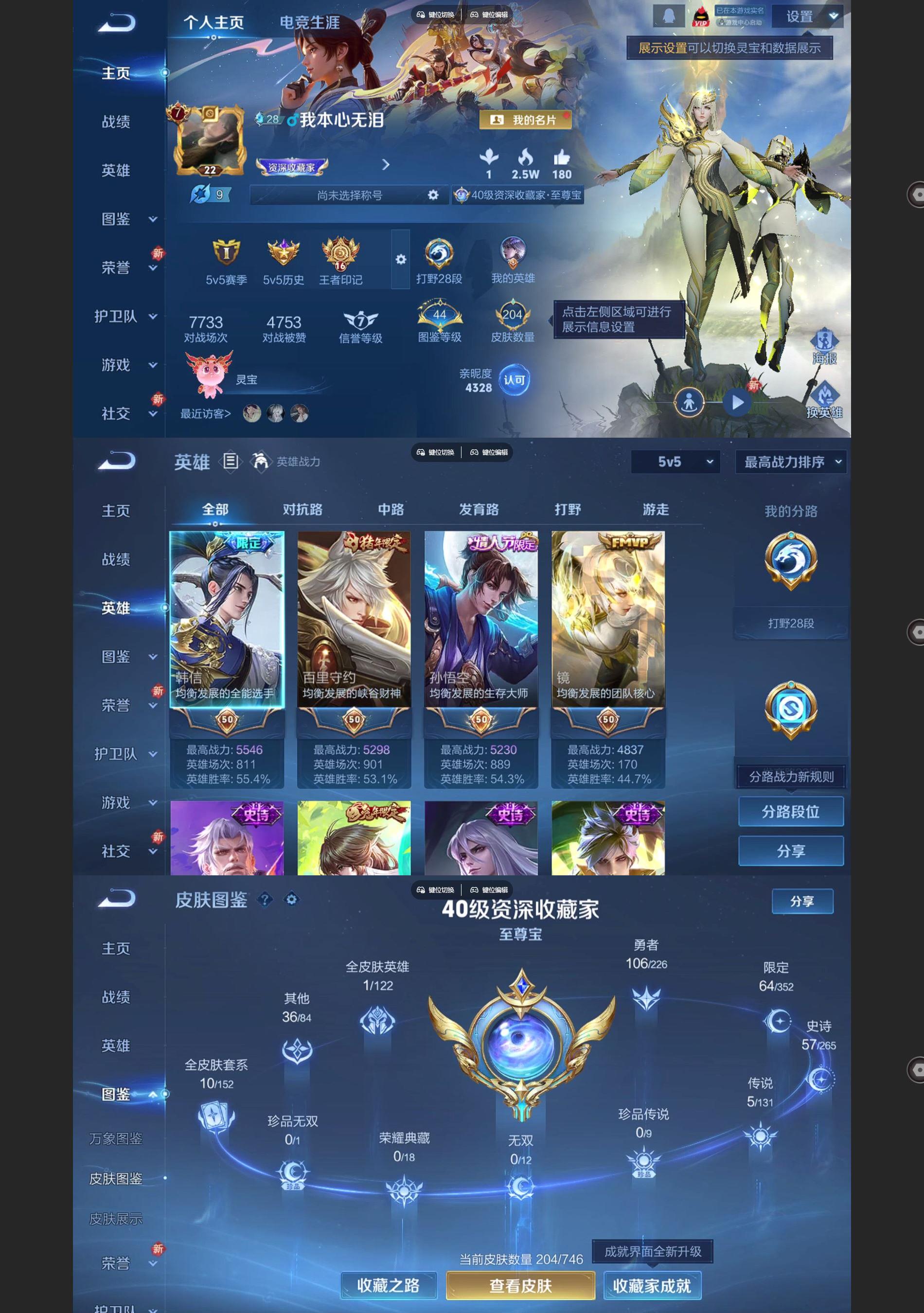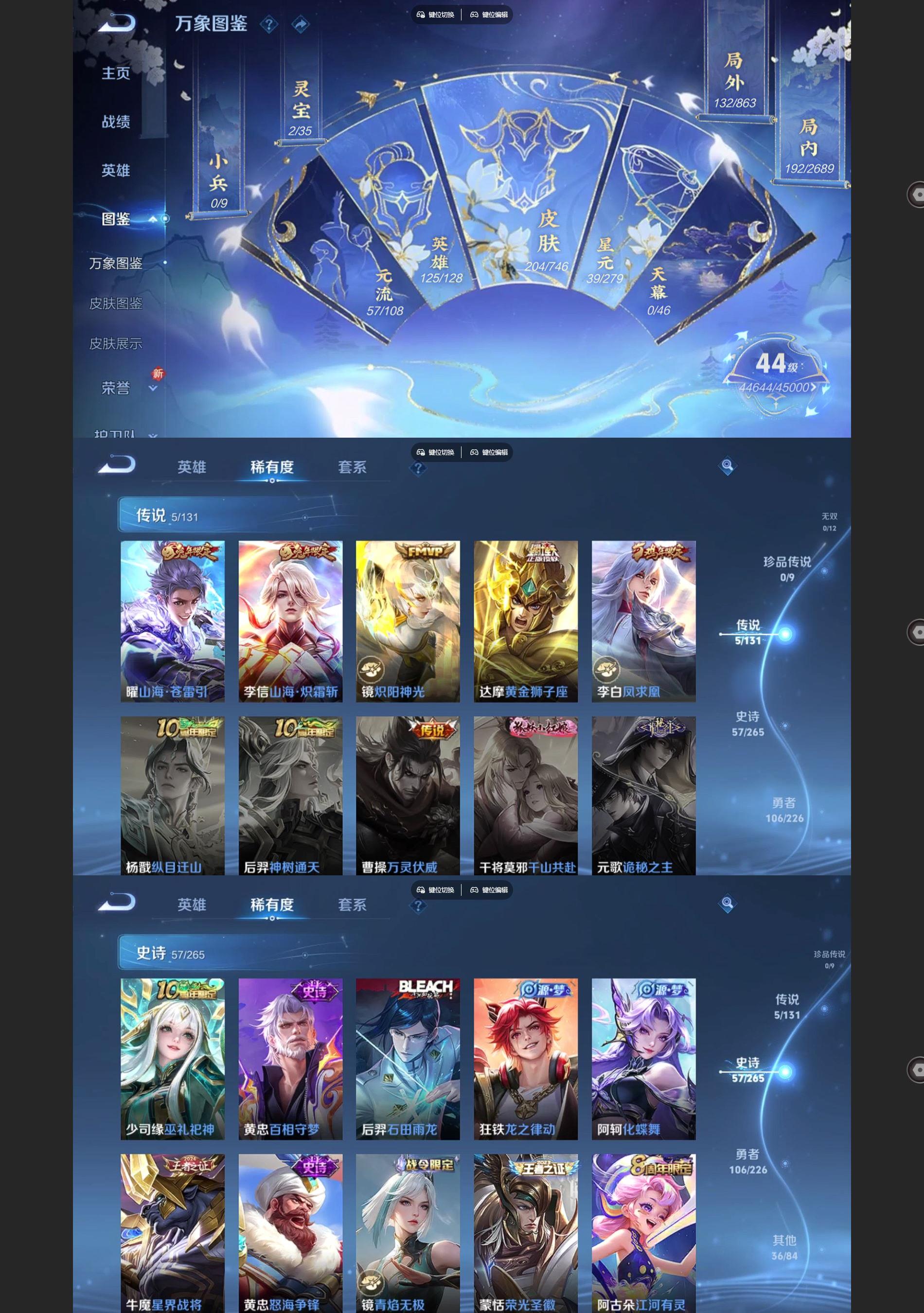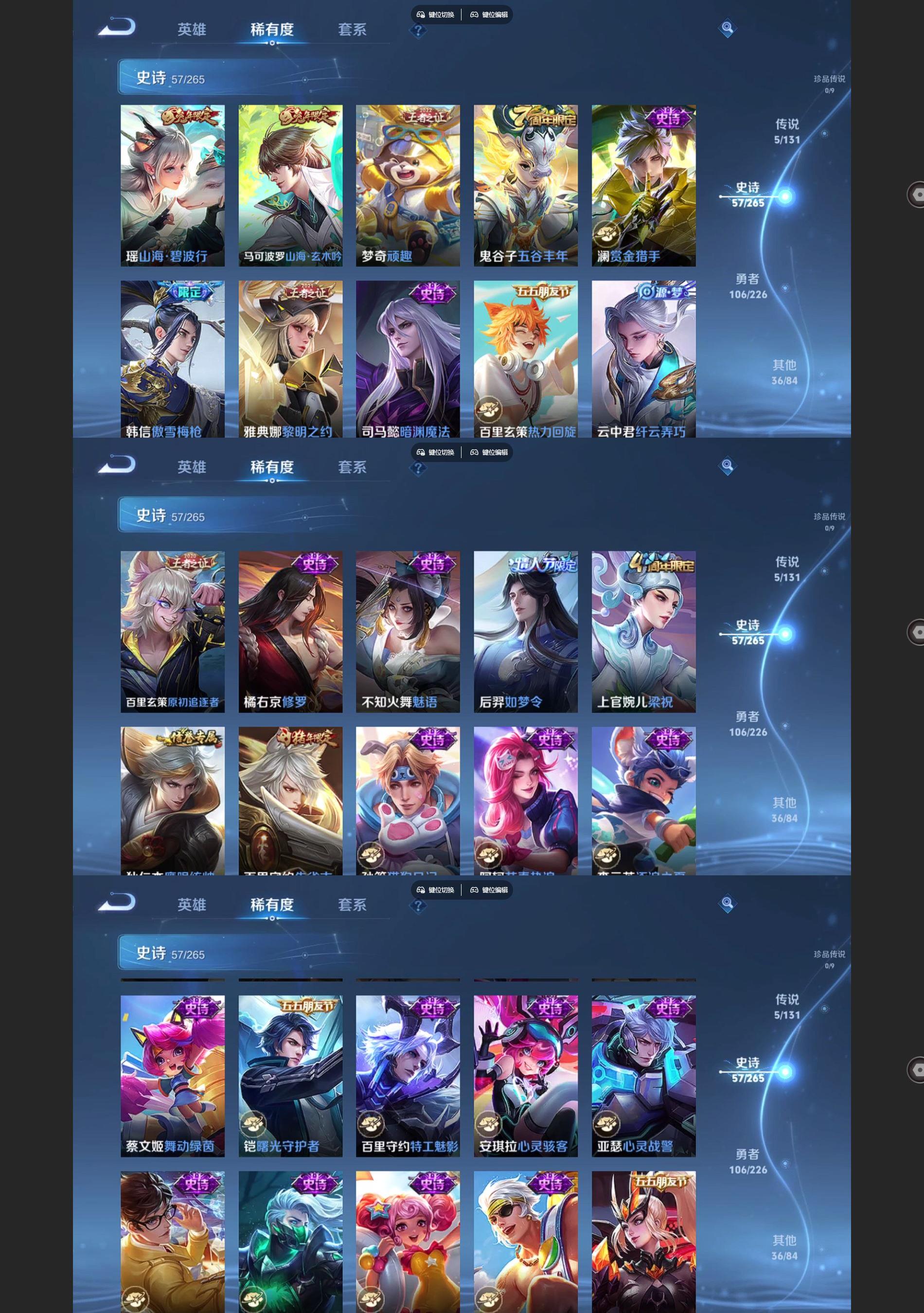 2273226-v7-204皮肤5传说57史诗64限定-6725紫星币 226幸运值 【传说】 凤求凰 山海苍雷引 山海炽霜斩 炽阳神光 黄金狮子座 【热门】巫礼祀神 至尊宝 朱雀志 山海碧波行 山海玄木吟 后羿如梦令 傲雪梅呛 原初追逐者 黎明之约 梁祝 暗夜猫娘 黄忠百相守梦 原初探秘者 水晶猎龙者 暗隐猎兽者 猫狗日记男 金属风暴 地狱岩魂 热力回旋 特工魅影 曙光守护者 特工战影