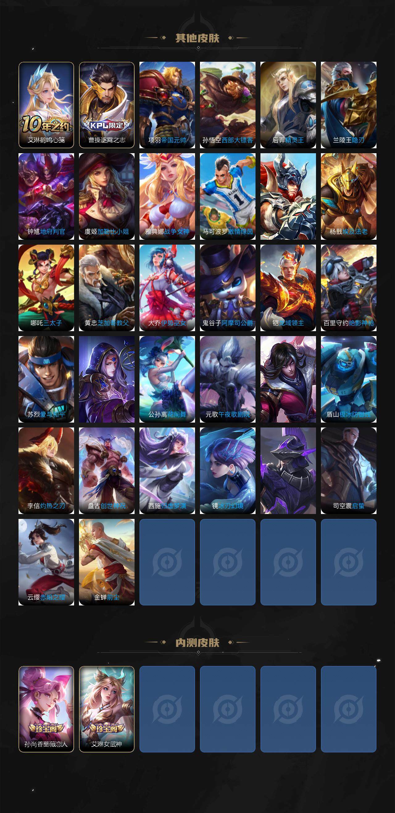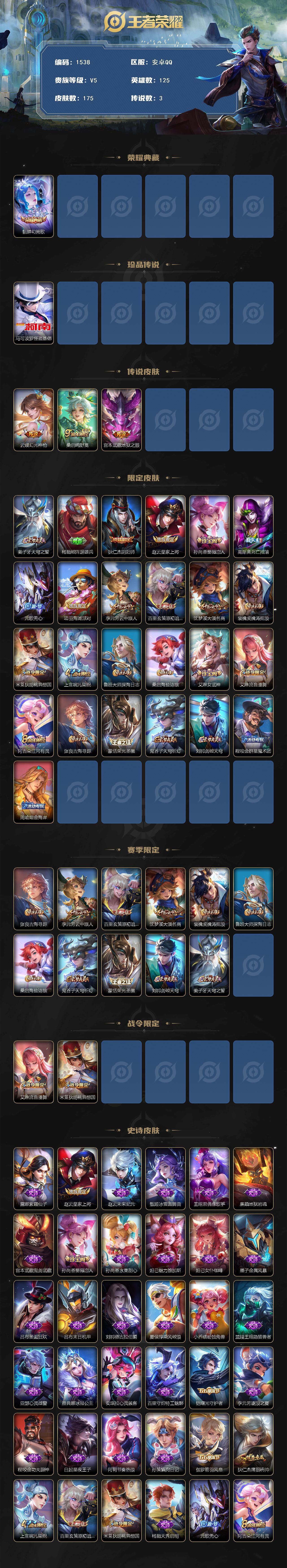 125英雄-175皮肤-贵族5/皮肤175/典藏1/传说3/史诗48/英雄125/空空儿全皮/幻阙歌 貂蝉/怪盗基德 马可波罗/幻光神呛 云缨/鸣野蒿 桑启/地狱之眼 宫本武藏/天穹之誓 姜子牙/破阵·退雄兵 杨戬/阴阳师 狄仁杰/皇家上将 赵云/蔷薇恋人 孙尚香/死亡摇滚 高渐离/无心 元歌/海滩派对 项羽/云中旅人 李元芳/原初追逐者 百里玄策/大漠名商 沈梦溪/擒涛扼浪 裴擒虎/胡桃异想国 米莱狄/梁祝 上官婉
