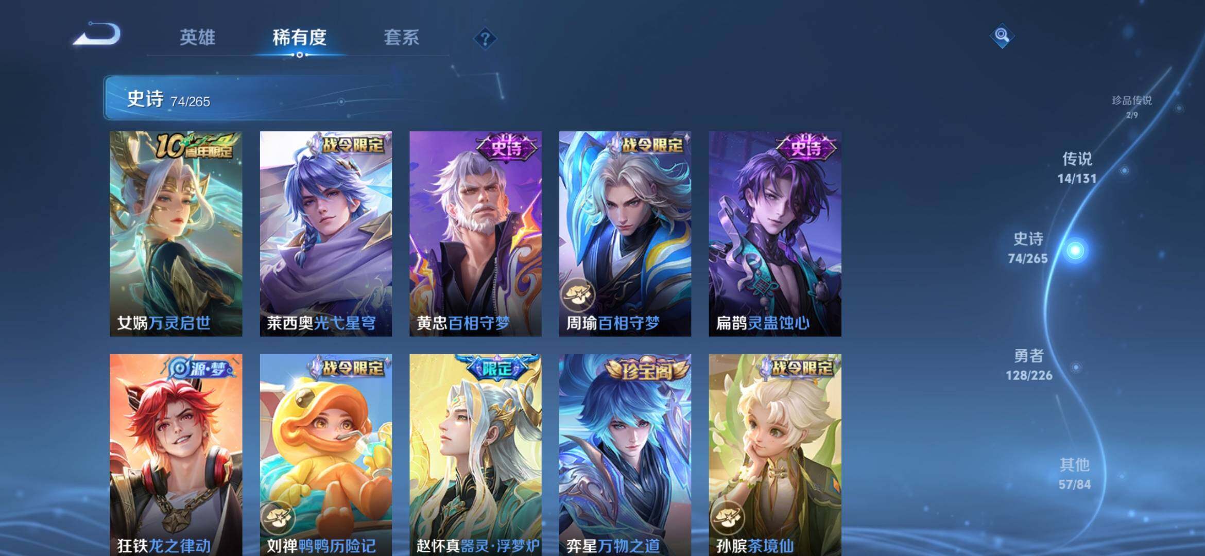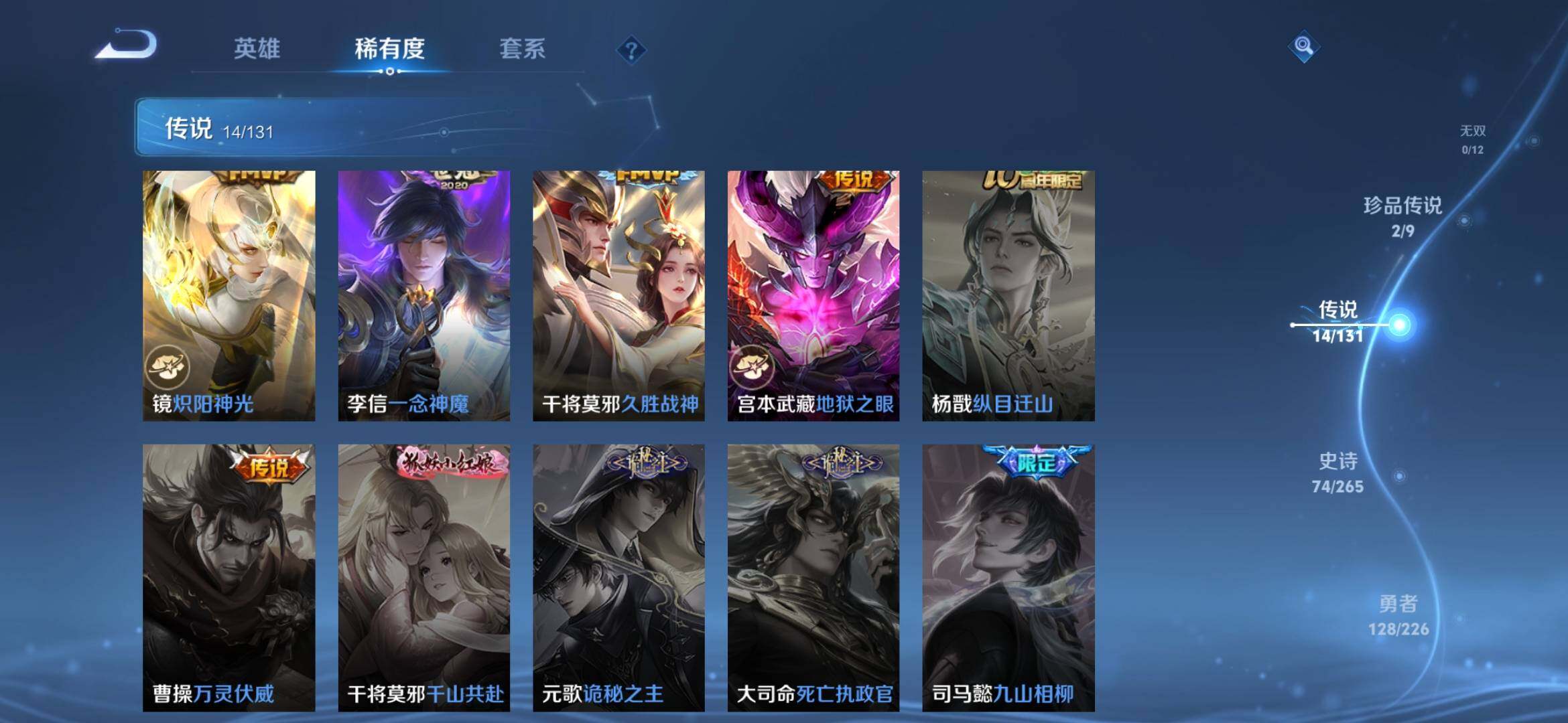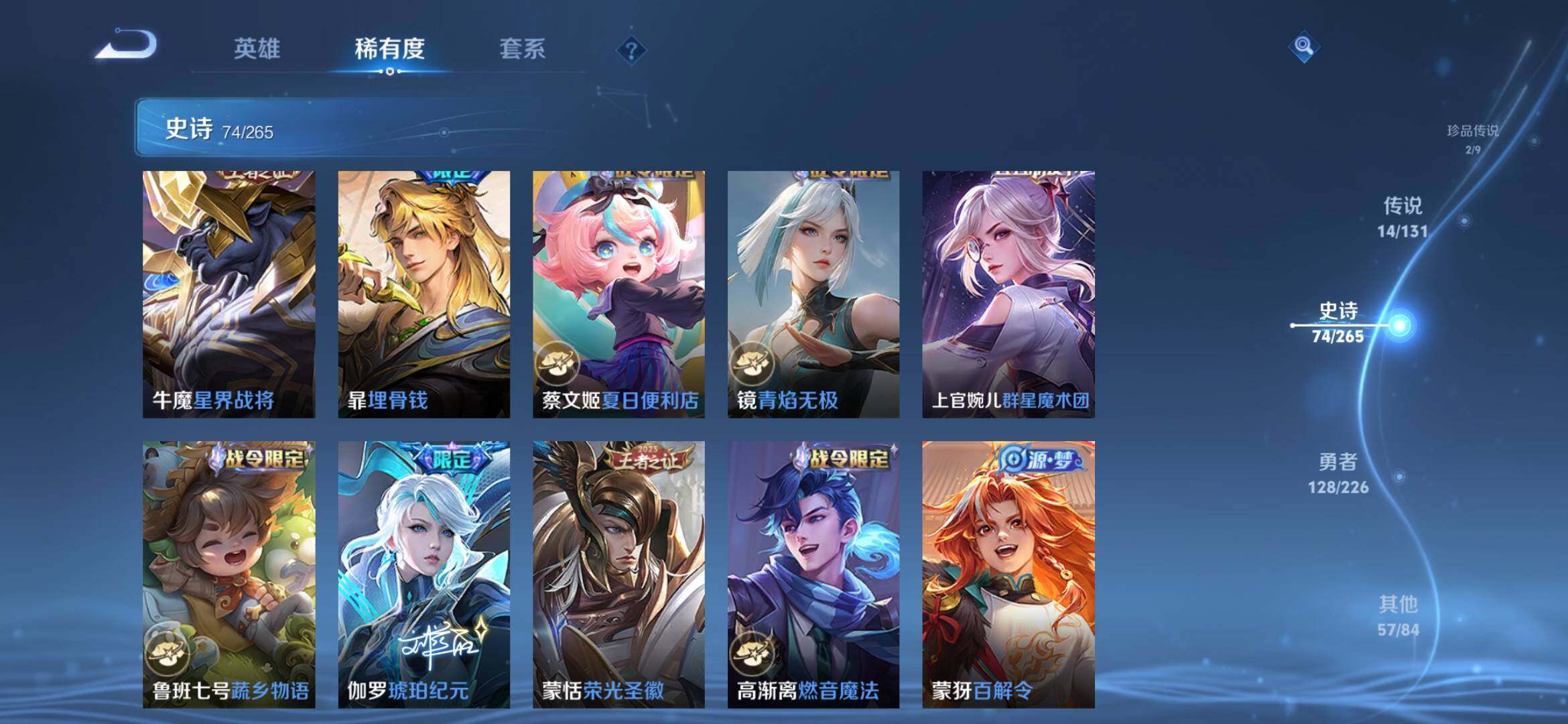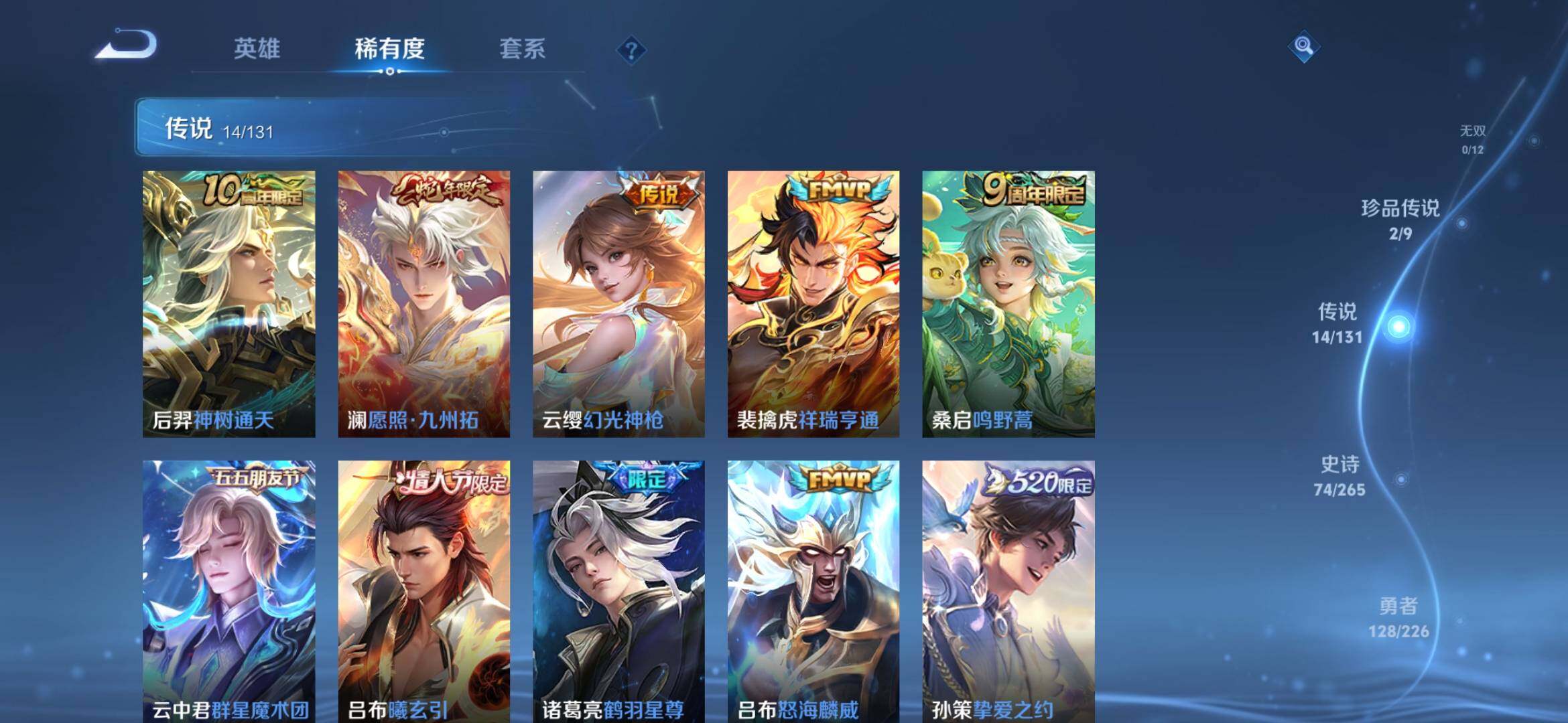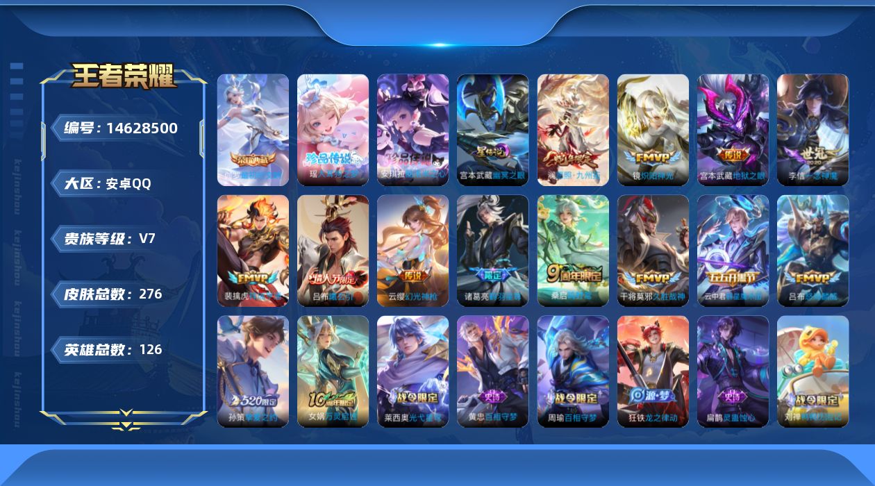 [14628500]安卓q-v7-最强王者段位-126英雄-276皮肤-1典藏-0珍品无双-0无双-2珍品传说-14传说-74史诗 【英雄全皮】:孙权全皮,蒙恬全皮,赵怀真全皮,戈娅全皮 【荣耀典藏】:伽罗最初的交响 【珍品传说】:瑶大耳狗之梦,安琪拉酷洛米之心 【传说皮肤】:后羿神树通天,澜愿照九州拓,云缨幻光神呛,裴擒虎祥瑞亨通,桑启鸣野蒿,云中君群星魔术团,吕布曦玄引,诸葛亮鹤羽星尊,吕布怒海麟威,孙策挚爱之约,镜炽阳神光,李信一念神魔,干将莫邪久胜战神,宫本武藏地狱之眼 【限定皮肤】:暃埋骨钱,蔡文姬夏日便利店,虞姬夏日便利店,姜子牙天穹之誓,杨戬破阵退雄兵,狄仁杰阴阳师,赵云皇家上将,赵云引擎之心,墨子神迹守卫,庄周高山流水,高渐离玩趣恶龙,扁鹊奇幻香踪,吕布猎兽之王,吕布御风骁将,马可波罗暗影游猎,狄仁杰魔术师,达摩星际陆战队,达摩沙漠行僧,项羽海滩派对,老夫子航海奇遇记,程咬金演武夺筹,露娜一生所爱,兰陵王金庭之子,花木兰默契交锋,孙悟空至尊宝,后羿圣弓游侠,李元芳云中旅人,钟馗驱傩正仪,杨玉环遇见飞天,杨戬潮玩骑兵,女娲朔望之晖,鬼谷子五谷丰年,诸葛亮鹤羽星尊,铠青龙志,百里守约朱雀志,沈梦溪大漠名商,裴擒虎擒涛扼浪,米莱狄胡桃异想国,云中君纤云弄巧,孙策挚爱之约,猪八戒猪悟能,嫦娥拒霜思,西施玲珑珍味,鲁班大师探海日志,桑启海盐诗旅,戈娅驭风魔法,艾琳流音漫舞,赵怀真鹤归松栖,司空震地狱燃心,阿古朵江河有灵,张良古海寻踪,蒙犽百解令,蒙恬荣光圣徽,高渐离燃音魔法,妲己灵卜魔法,鬼谷子天穹祈灯,伽罗琥珀纪元,吕布曦玄引,沈梦溪龙舞盛年,鲁班七号蔬乡物语,李元芳蔬乡物语,刘邦剑破天穹,上官婉儿群星魔术团,程咬金群星魔术团,云中君群星魔术团,镜青焰无极,项羽苍威无极,周瑜熔金海岸 【年限皮肤】:百里守约朱雀志,铠青龙志,吕布御风骁将 【赛季限定】:达摩沙漠行僧,程咬金演武夺筹,兰陵王金庭之子,张良古海寻踪,李元芳云中旅人,钟馗驱傩正仪,沈梦溪大漠名商,裴擒虎擒涛扼浪,鲁班大师探海日志,桑启海盐诗旅,鬼谷子天穹祈灯,蒙恬荣光圣徽,刘邦剑破天穹,姜子牙天穹之誓 【战令限定】:墨子神迹守卫,蔡文姬夏日便利店,虞姬夏日便利店,扁鹊奇幻香踪,吕布猎兽之王,马可波罗暗影游猎,达摩星际陆战队,老夫子航海奇遇记,艾琳流音漫舞,后羿圣弓游侠,杨戬潮玩骑兵,女娲朔望之晖,米莱狄胡桃异想国,西