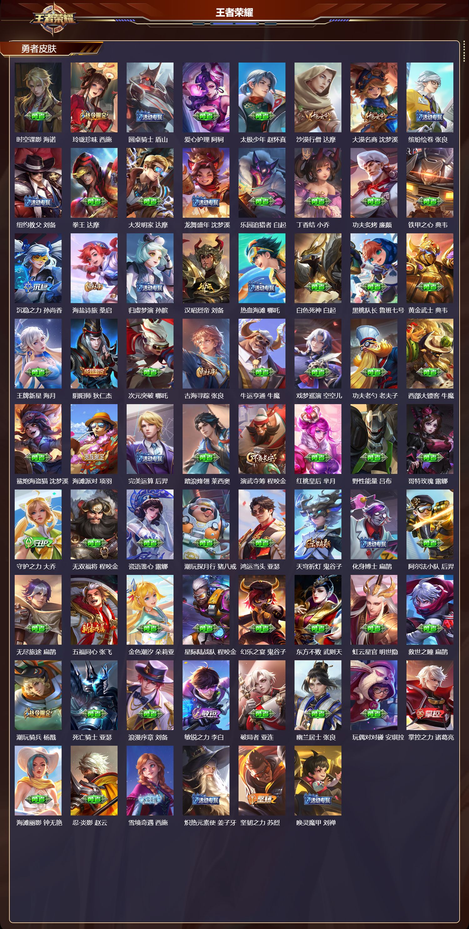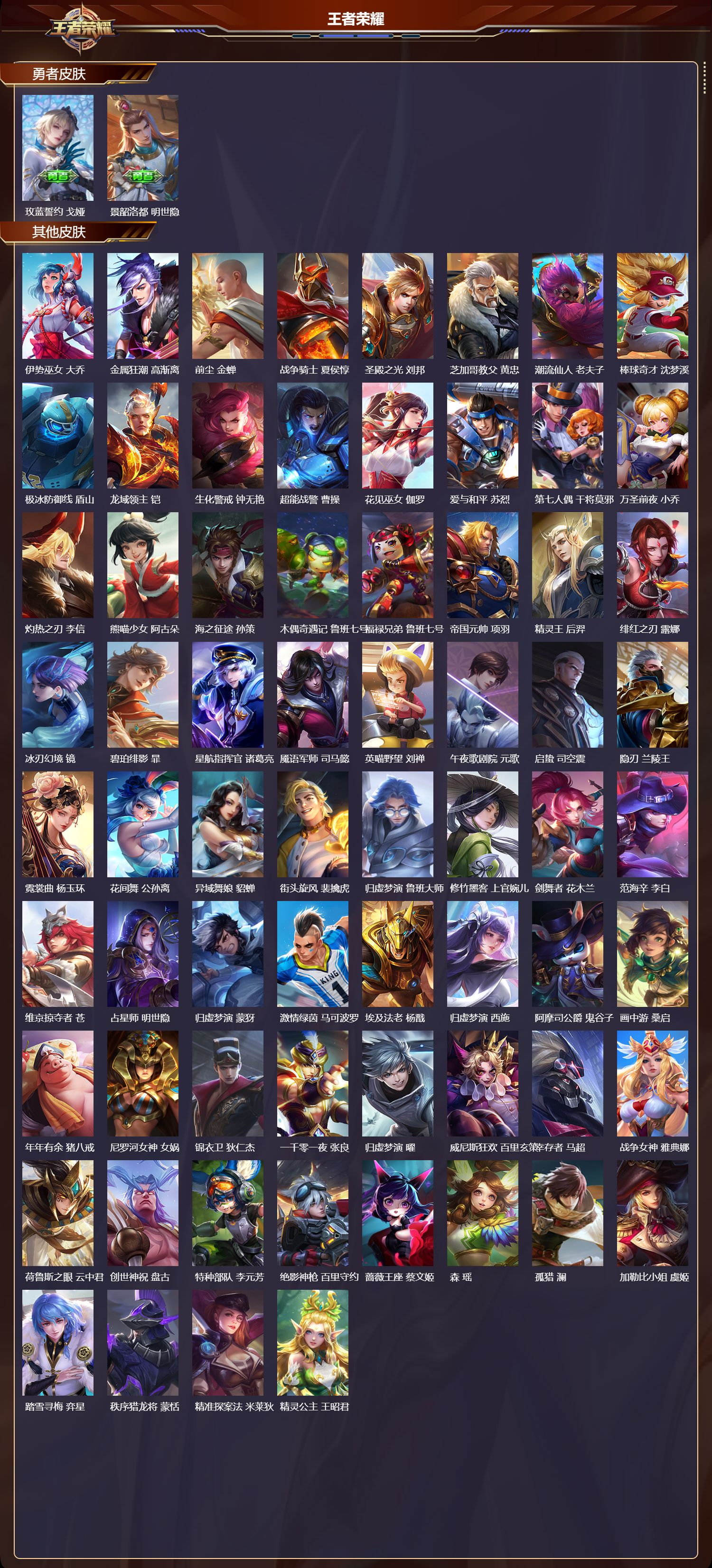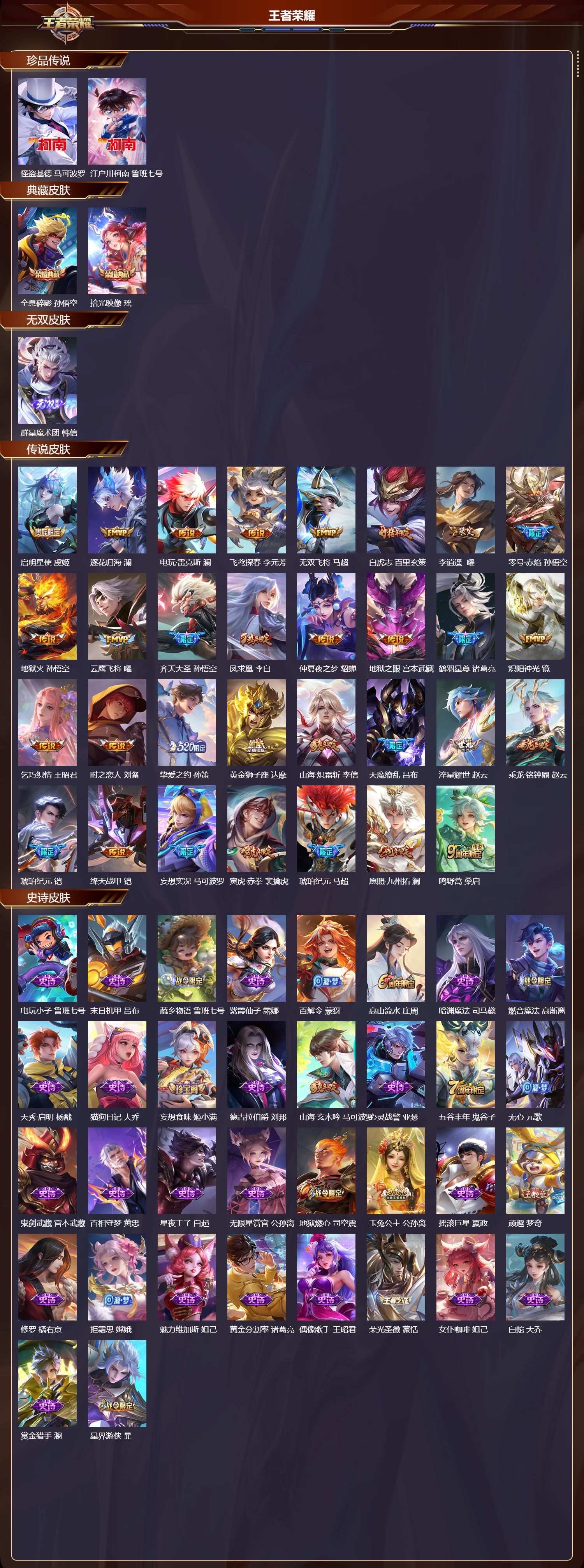 安卓qq/至尊星耀/356皮肤/126英雄/2典藏/0珍品无双/1无双/2珍品传说/31传说/104史诗/8稀有英雄【2 珍品传说】怪盗基德 马可波罗江户川柯南 鲁班七号【2 典藏皮肤】全息碎影 孙悟空拾光映像 瑶【1 无双皮肤】群星魔术团 韩信【31 传说皮肤】启明星使 虞姬逐花归海 澜电玩·雷克斯 澜飞鸢探春 李元芳无双飞将 马超白虎志 百里玄策李 曜零号·赤焰