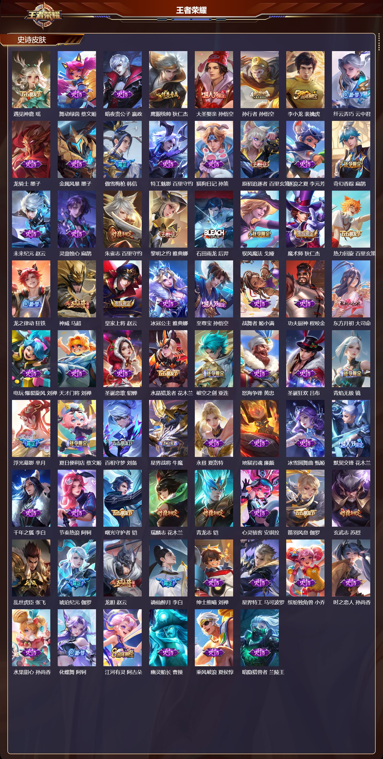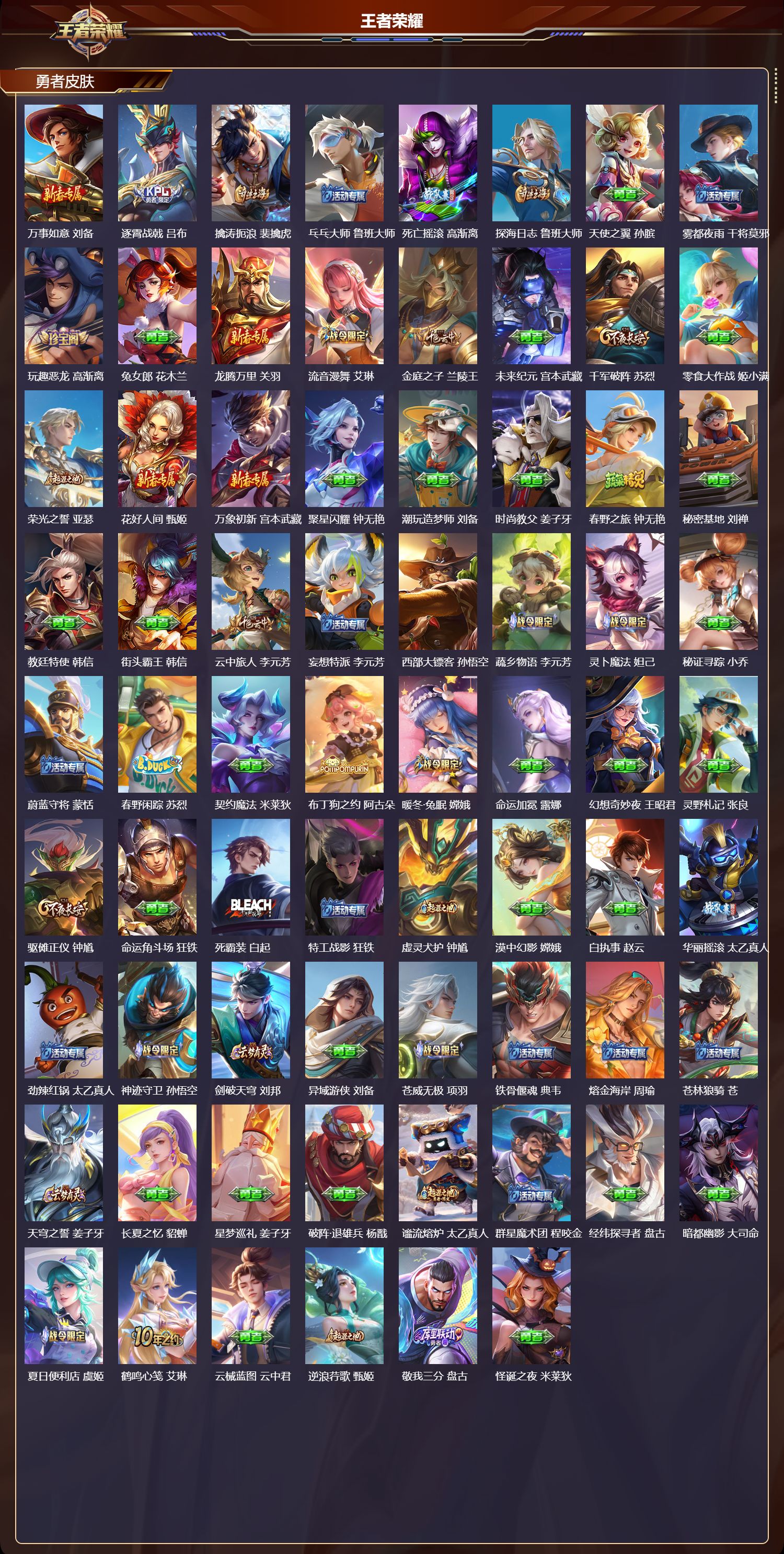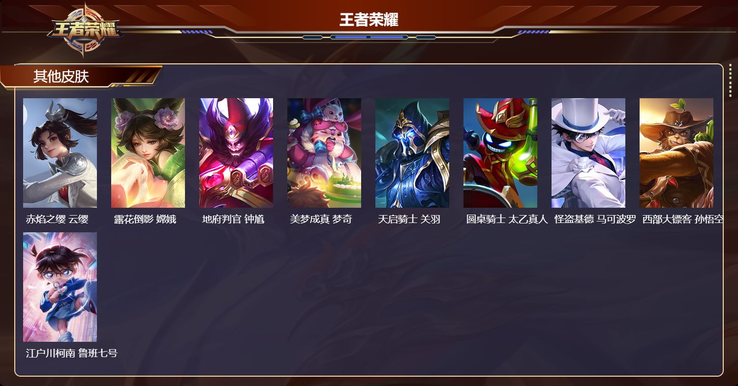 安卓qq/至尊星耀/356皮肤/126英雄/2典藏/0珍品无双/1无双/2珍品传说/31传说/104史诗/8稀有英雄【2 珍品传说】怪盗基德 马可波罗江户川柯南 鲁班七号【2 典藏皮肤】全息碎影 孙悟空拾光映像 瑶【1 无双皮肤】群星魔术团 韩信【31 传说皮肤】启明星使 虞姬逐花归海 澜电玩·雷克斯 澜飞鸢探春 李元芳无双飞将 马超白虎志 百里玄策李 曜零号·赤焰