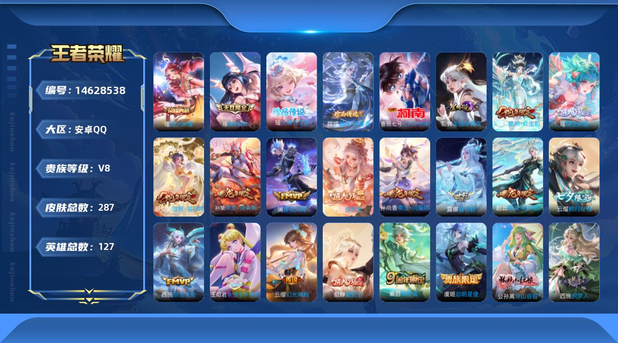 [14628538]安卓q-v8-最强王者段位-127英雄-286皮肤-1典藏-0珍品无双-1无双-3珍品传说-17传说-86史诗 【英雄全皮】:孙权全皮,瑶全皮,西施全皮,赵怀真全皮,戈娅全皮,空空儿全皮,影全皮 【荣耀典藏】:瑶拾光映像 【无双皮肤】:瑶真我赫兹 【珍品传说】:鲁班七号江户川柯南,嫦娥器灵落星盏,瑶大耳狗之梦 【传说皮肤】:后羿神树通天,西施续相思,妲己愿照众生和,蔡文姬愿照福禄聚,云缨幻光神呛,桑启鸣野蒿,貂蝉曦玄引,孙尚香乘龙问璇玑,孙策乘龙淬吴钩,赵云乘龙铭钟鼎,澜逐花归海,露娜霜月吟,王昭君永恒水手月亮,云缨鹤归松栖,瑶时之祈愿,西施游龙清影,虞姬启明星使 【限定皮肤】:蔡文姬夏日便利店,大乔绒语心约,虞姬夏日便利店,狄仁杰阴阳师,赵云皇家上将,妲己时之奇旅,孙尚香蔷薇恋人,吕布猎兽之王,元歌云间偶戏,元歌无心,甄姬落雪兰心,马可波罗暗影游猎,狄仁杰魔术师,狄仁杰万华元夜,达摩沙漠行僧,项羽海滩派对,老夫子醍醐杖,王昭君午后时光,兰陵王金庭之子,孙悟空孙行者,李元芳匿光侦查者,李元芳云中旅人,虞姬启明星使,钟馗驱傩正仪,蔡文姬繁星吟游,鬼谷子五谷丰年,苏烈千军破阵,公孙离玉兔公主,沈梦溪大漠名商,明世隐疑决卦,裴擒虎李小龙,裴擒虎擒涛扼浪,狂铁电玩高手,瑶时之祈愿,瑶山海碧波行,云中君纤云弄巧,上官婉儿神器万象笔,嫦娥拒霜思,嫦娥暖冬兔眠,西施玲珑珍味,西施至美乘鲤谣,鲁班大师探海日志,桑启海盐诗旅,戈娅驭风魔法,艾琳流音漫舞,赵怀真鹤归松栖,云缨鹤归松栖,司空震地狱燃心,阿古朵江河有灵,张良古海寻踪,王昭君永恒水手月亮,蒙犽百解令,高渐离燃音魔法,妲己灵卜魔法,鬼谷子天穹祈灯,伽罗琥珀纪元,姬小满妄想食味,大乔乘龙忆丹青,安琪拉乘龙聚宝船,孙尚香乘龙问璇玑,孙策乘龙淬吴钩,赵云乘龙铭钟鼎,貂蝉曦玄引,沈梦溪龙舞盛年,鲁班七号蔬乡物语,李元芳蔬乡物语,刘邦剑破天穹,程咬金群星魔术团,刘备异域游侠,周瑜熔金海岸 【年限皮肤】:马超神威,瑶山海碧波行,大乔乘龙忆丹青,安琪拉乘龙聚宝船,孙尚香乘龙问璇玑,孙策乘龙淬吴钩,赵云乘龙铭钟鼎 【赛季限定】:狄仁杰万华元夜,达摩沙漠行僧,老夫子醍醐杖,兰陵王金庭之子,张良古海寻踪,李元芳云中旅人,钟馗驱傩正仪,苏烈千军破阵,沈梦溪大漠名商,明世隐疑决卦,裴擒虎擒涛扼浪,鲁班大师探海日志,桑启海盐诗旅,鬼谷子天穹祈灯,刘邦