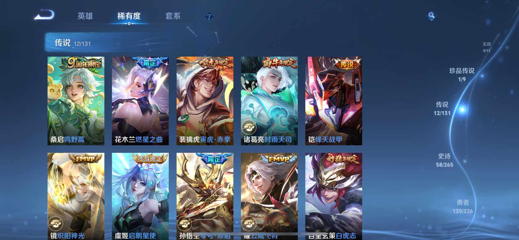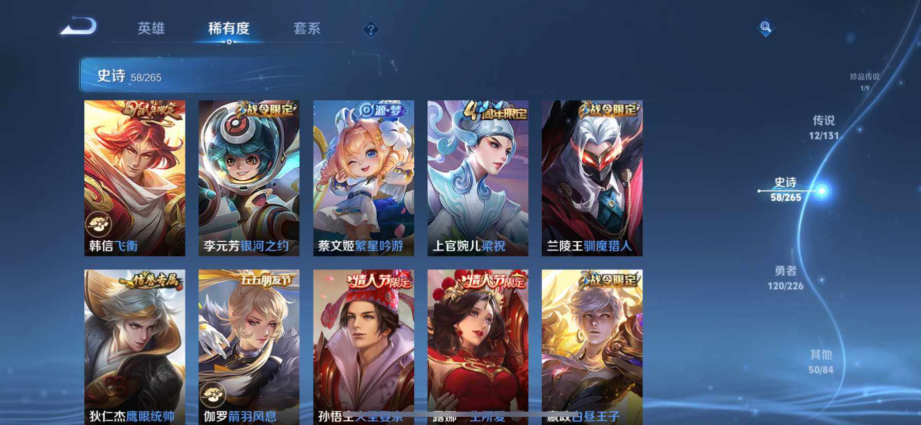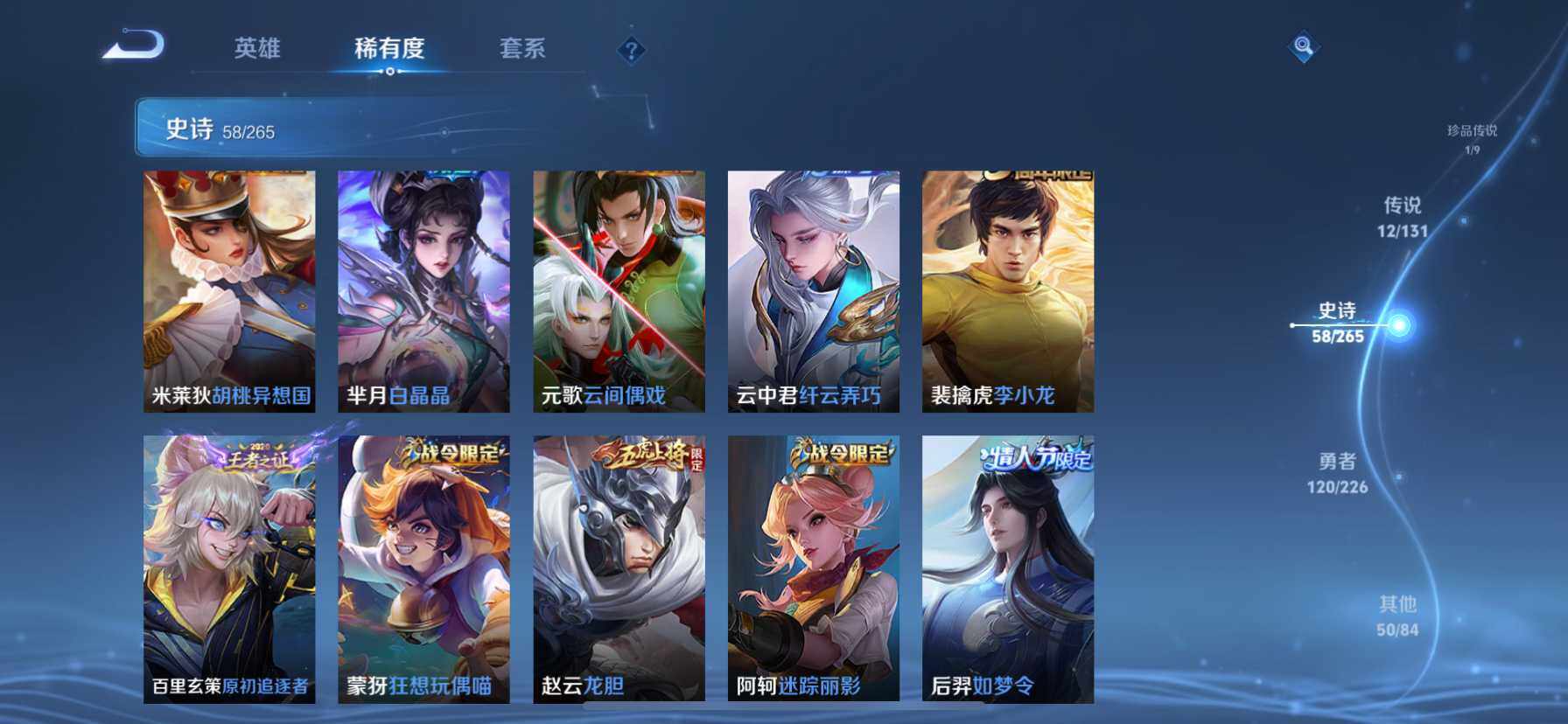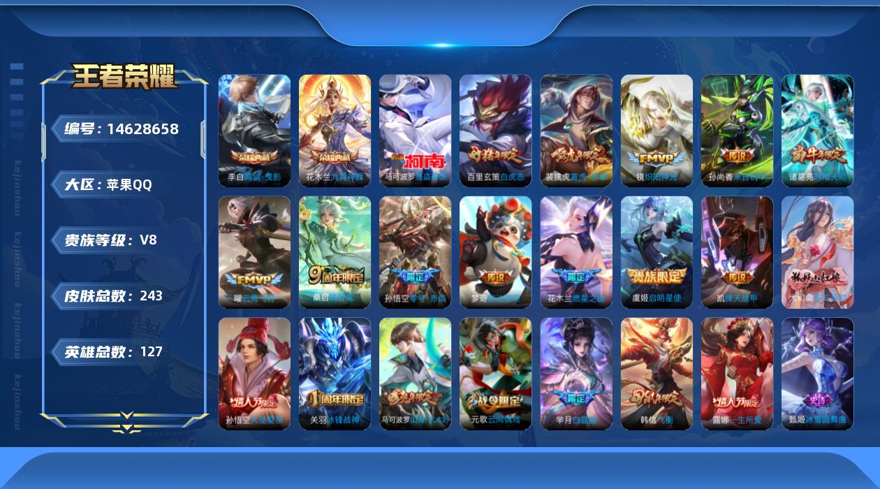 [14628658]苹果q-v8-至尊星耀i段位-127英雄-243皮肤-2典藏皮肤-1珍品传说-12传说-58史诗 【荣耀典藏】:李白鸣剑曳影,花木兰九霄神辉 【珍品传说】:马可波罗怪盗基德 【传说皮肤】:桑启鸣野蒿,花木兰燃星之曲,裴擒虎寅虎赤拳,诸葛亮时雨天司,铠绛天战甲,镜炽阳神光,虞姬启明星使,孙悟空零号赤焰,曜云鹰飞将,百里玄策白虎志,梦奇胖达荣荣,孙尚香末日机甲 【限定皮肤】:白起狰,姜子牙天穹之誓,狄仁杰阴阳师,虞姬凯尔特女王,赵云皇家上将,赵云龙胆,嬴政白昼王子,庄周蜃楼王,高渐离死亡摇滚,阿轲迷踪丽影,孙膑妖精王,扁鹊炼金王,芈月重明,芈月白晶晶,吕布猎兽之王,周瑜赤莲之焰,元歌云间偶戏,夏侯惇朔风刀,马可波罗山海玄木吟,狄仁杰魔术师,狄仁杰万华元夜,达摩星际陆战队,达摩沙漠行僧,项羽海滩派对,老夫子醍醐杖,关羽冰锋战神,程咬金演武夺筹,露娜一生所爱,刘邦夺宝奇兵,韩信飞衡,兰陵王驯魔猎人,花木兰燃星之曲,亚瑟潮玩骑士王,孙悟空大圣娶亲,孙悟空零号赤焰,牛魔御旌,后羿如梦令,李元芳银河之约,虞姬启明星使,杨玉环遇见飞天,女娲朔望之晖,雅典娜单词大作战,蔡文姬繁星吟游,太乙真人饕餮,太乙真人华丽摇滚,鬼谷子原初探秘者,诸葛亮时雨天司,百里玄策白虎志,百里玄策原初追逐者,弈星混沌棋,沈梦溪星空之诺,明世隐疑决卦,裴擒虎李小龙,裴擒虎寅虎赤拳,裴擒虎擒涛扼浪,狂铁御狮,米莱狄御霄,米莱狄胡桃异想国,云中君纤云弄巧,盾山御銮,上官婉儿梁祝,西施玲珑珍味,蒙犽狂想玩偶喵,鲁班大师探海日志,桑启海盐诗旅,戈娅驭风魔法,艾琳女武神,阿古朵江河有灵,张良古海寻踪,蒙恬荣光圣徽,鬼谷子天穹祈灯,沈梦溪龙舞盛年,鲁班七号蔬乡物语,李元芳蔬乡物语 【年限皮肤】:百里玄策白虎志,裴擒虎寅虎赤拳,诸葛亮时雨天司,韩信飞衡,赵云龙胆,马可波罗山海玄木吟 【赛季限定】:庄周蜃楼王,孙膑妖精王,扁鹊炼金王,白起狰,芈月重明,夏侯惇朔风刀,狄仁杰万华元夜,达摩沙漠行僧,老夫子醍醐杖,程咬金演武夺筹,张良古海寻踪,牛魔御旌,虞姬凯尔特女王,太乙真人饕餮,鬼谷子原初探秘者,百里玄策原初追逐者,弈星混沌棋,明世隐疑决卦,裴擒虎擒涛扼浪,狂铁御狮,米莱狄御霄,盾山御銮,鲁班大师探海日志,桑启海盐诗旅,鬼谷子天穹祈灯,蒙恬荣光圣徽,姜子牙天穹之誓 【战令限定】:嬴政白昼王子,阿轲迷踪丽影,吕布猎兽之王,周瑜