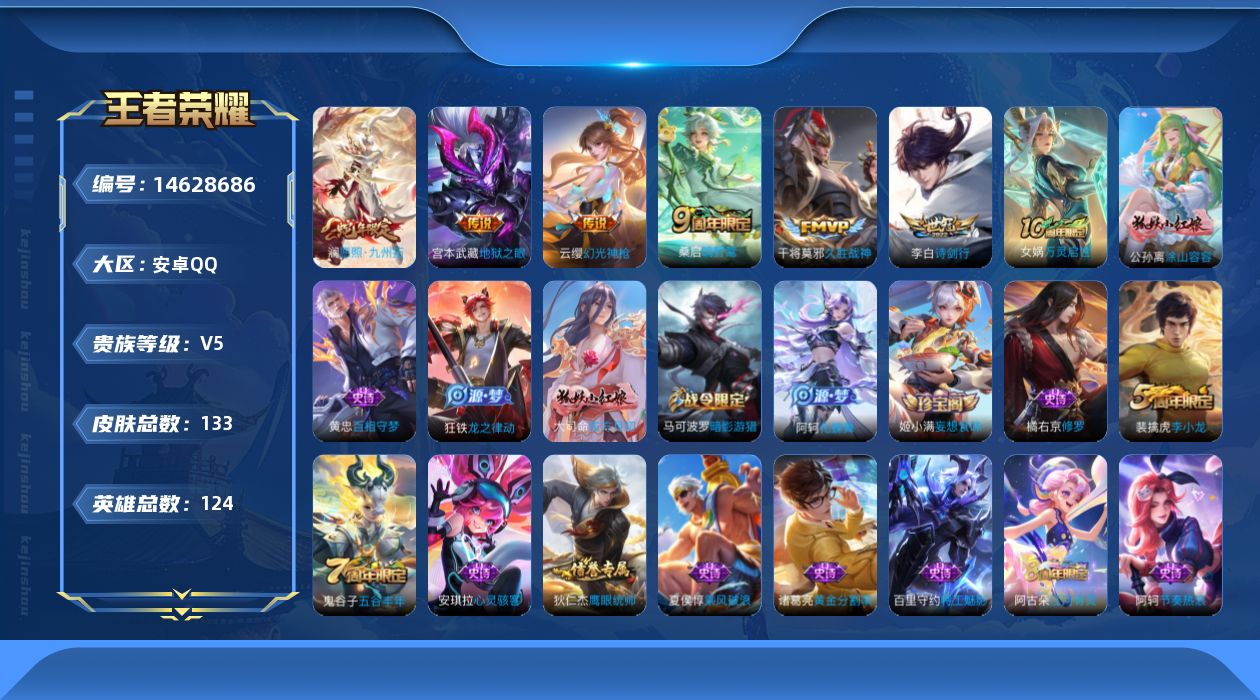 [14628686]安卓q-v5-最强王者段位-124英雄-132皮肤-6传说-33史诗 【英雄全皮】:孙权全皮,空空儿全皮 【传说皮肤】:澜愿照九州拓,云缨幻光神呛,桑启鸣野蒿,李白诗剑行,干将莫邪久胜战神,宫本武藏地狱之眼 【限定皮肤】:姜子牙天穹之誓,狄仁杰阴阳师,赵云皇家上将,马可波罗暗影游猎,达摩沙漠行僧,项羽海滩派对,李元芳云中旅人,鬼谷子五谷丰年,沈梦溪大漠名商,裴擒虎李小龙,裴擒虎擒涛扼浪,桑启海盐诗旅,艾琳女武神,阿古朵江河有灵,张良古海寻踪,鬼谷子天穹祈灯,姬小满妄想食味,沈梦溪龙舞盛年,刘邦剑破天穹,镜青焰无极,项羽苍威无极,周瑜熔金海岸 【赛季限定】:达摩沙漠行僧,张良古海寻踪,李元芳云中旅人,沈梦溪大漠名商,裴擒虎擒涛扼浪,桑启海盐诗旅,鬼谷子天穹祈灯,刘邦剑破天穹,姜子牙天穹之誓 【战令限定】:马可波罗暗影游猎,镜青焰无极,项羽苍威无极 【史诗皮肤】:赵云皇家上将,赵云未来纪元,貂蝉圣诞恋歌,宫本武藏鬼剑武藏,孙尚香水果甜心,妲己魅力维加斯,墨子金属风暴,吕布圣诞狂欢,夏侯惇乘风破浪,兰陵王暗隐猎兽者,诸葛亮黄金分割率,安琪拉心灵骇客,百里守约特工魅影,刘禅天才门将,阿轲节奏热浪,孙策猫狗日记,狄仁杰鹰眼统帅,橘右京修罗,马可波罗暗影游猎,裴擒虎李小龙,百里玄策热力回旋,鬼谷子五谷丰年,阿古朵江河有灵,姬小满妄想食味,镜青焰无极,大司命东方月初,孙膑茶境仙,阿轲化蝶舞,狂铁龙之律动,黄忠百相守梦,公孙离涂山容容,女娲万灵启世,少司缘巫礼祀神 【其他皮肤】:项羽海滩派对,韩信街头霸王,赵云忍炎影,艾琳女武神,白起白色死神,牛魔西部大镖客,武则天东方不败,扁鹊救世之瞳,孙膑天使之翼,典韦黄金武士,亚瑟死亡骑士,达摩拳王,花木兰兔女郎,甄姬花好人间,刘备万事如意,宫本武藏万象初新,后羿阿尔法小队,狄仁杰阴阳师,刘备纽约教父,关羽龙腾万里,钟无艳海滩丽影,王昭君幻想奇妙夜,老夫子功夫老勺,李白敏锐之力,大乔守护之力,小乔丁香结,哪吒次元突破,刘禅秘密基地,张良缤纷绘卷,鲁班大师乓乓大师,达摩沙漠行僧,程咬金无双福将,沈梦溪大漠名商,蒙恬蔚蓝守将,李元芳云中旅人,桑启海盐诗旅,白起乐园追猎者,赵怀真太极少年,裴擒虎擒涛扼浪,太乙真人劲辣红锅,姬小满零食大作战,张良古海寻踪,亚连破局者,后羿完美运算,鬼谷子天穹祈灯,廉颇功夫炙烤,沈梦溪龙舞盛年,刘邦剑破天穹,项羽苍威