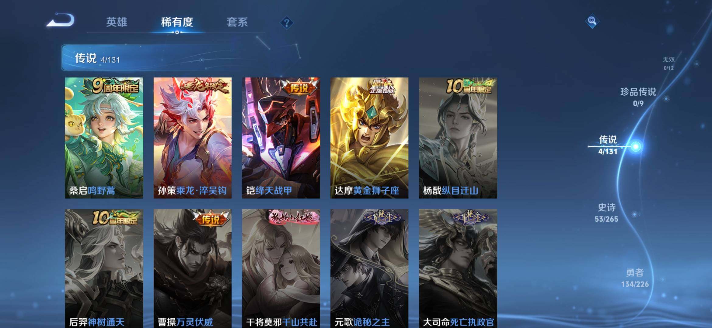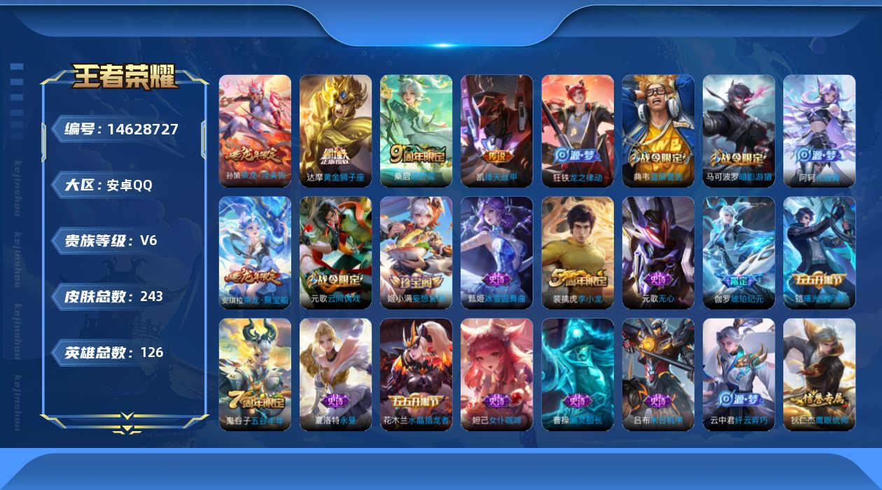 [14628727]安卓q-v6-最强王者段位-125英雄-233皮肤-4传说-53史诗 【英雄全皮】:空空儿全皮,影全皮 【传说皮肤】:桑启鸣野蒿,孙策乘龙淬吴钩,铠绛天战甲,达摩黄金狮子座 【限定皮肤】:姜子牙天穹之誓,杨戬破阵退雄兵,狄仁杰阴阳师,廉颇寅虎御盾,赵云皇家上将,鲁班七号狮舞东方,高渐离玩趣恶龙,钟无艳王者之锤,芈月重明,元歌云间偶戏,元歌无心,夏侯惇朔风刀,典韦蓝屏警告,马可波罗暗影游猎,狄仁杰魔术师,狄仁杰万华元夜,达摩星际陆战队,达摩沙漠行僧,项羽海滩派对,老夫子醍醐杖,程咬金演武夺筹,亚瑟潮玩骑士王,牛魔御旌,李元芳云中旅人,钟馗神迹守卫,女娲朔望之晖,雅典娜单词大作战,蔡文姬繁星吟游,鬼谷子原初探秘者,鬼谷子五谷丰年,百里玄策原初追逐者,弈星混沌棋,明世隐疑决卦,裴擒虎李小龙,裴擒虎擒涛扼浪,米莱狄御霄,米莱狄胡桃异想国,云中君纤云弄巧,盾山御銮,猪八戒西部大镖客,上官婉儿梁祝,蒙犽狂想玩偶喵,鲁班大师探海日志,桑启海盐诗旅,张良古海寻踪,鬼谷子天穹祈灯,伽罗琥珀纪元,姬小满妄想食味,安琪拉乘龙聚宝船,孙策乘龙淬吴钩,沈梦溪龙舞盛年,刘邦剑破天穹,程咬金群星魔术团,刘备异域游侠,周瑜熔金海岸 【年限皮肤】:廉颇寅虎御盾,安琪拉乘龙聚宝船,孙策乘龙淬吴钩 【赛季限定】:芈月重明,夏侯惇朔风刀,狄仁杰万华元夜,达摩沙漠行僧,老夫子醍醐杖,程咬金演武夺筹,张良古海寻踪,牛魔御旌,李元芳云中旅人,鬼谷子原初探秘者,百里玄策原初追逐者,弈星混沌棋,明世隐疑决卦,裴擒虎擒涛扼浪,米莱狄御霄,盾山御銮,鲁班大师探海日志,桑启海盐诗旅,鬼谷子天穹祈灯,刘邦剑破天穹,姜子牙天穹之誓 【战令限定】:鲁班七号狮舞东方,元歌云间偶戏,典韦蓝屏警告,马可波罗暗影游猎,达摩星际陆战队,亚瑟潮玩骑士王,钟馗神迹守卫,女娲朔望之晖,雅典娜单词大作战,米莱狄胡桃异想国,猪八戒西部大镖客,蒙犽狂想玩偶喵 【史诗皮肤】:钟无艳王者之锤,赵云皇家上将,赵云未来纪元,貂蝉圣诞恋歌,甄姬冰雪圆舞曲,狄仁杰魔术师,廉颇地狱岩魂,宫本武藏鬼剑武藏,孙尚香水果甜心,嬴政摇滚巨星,妲己魅力维加斯,妲己女仆咖啡,墨子金属风暴,吕布圣诞狂欢,曹操幽灵船长,吕布末日机甲,张飞乱世虎臣,花木兰水晶猎龙者,刘邦德古拉伯爵,夏侯惇乘风破浪,小乔缤纷独角兽,兰陵王暗隐猎兽者,诸葛亮黄金分割率,亚瑟心灵战警,雅典娜冰冠公主