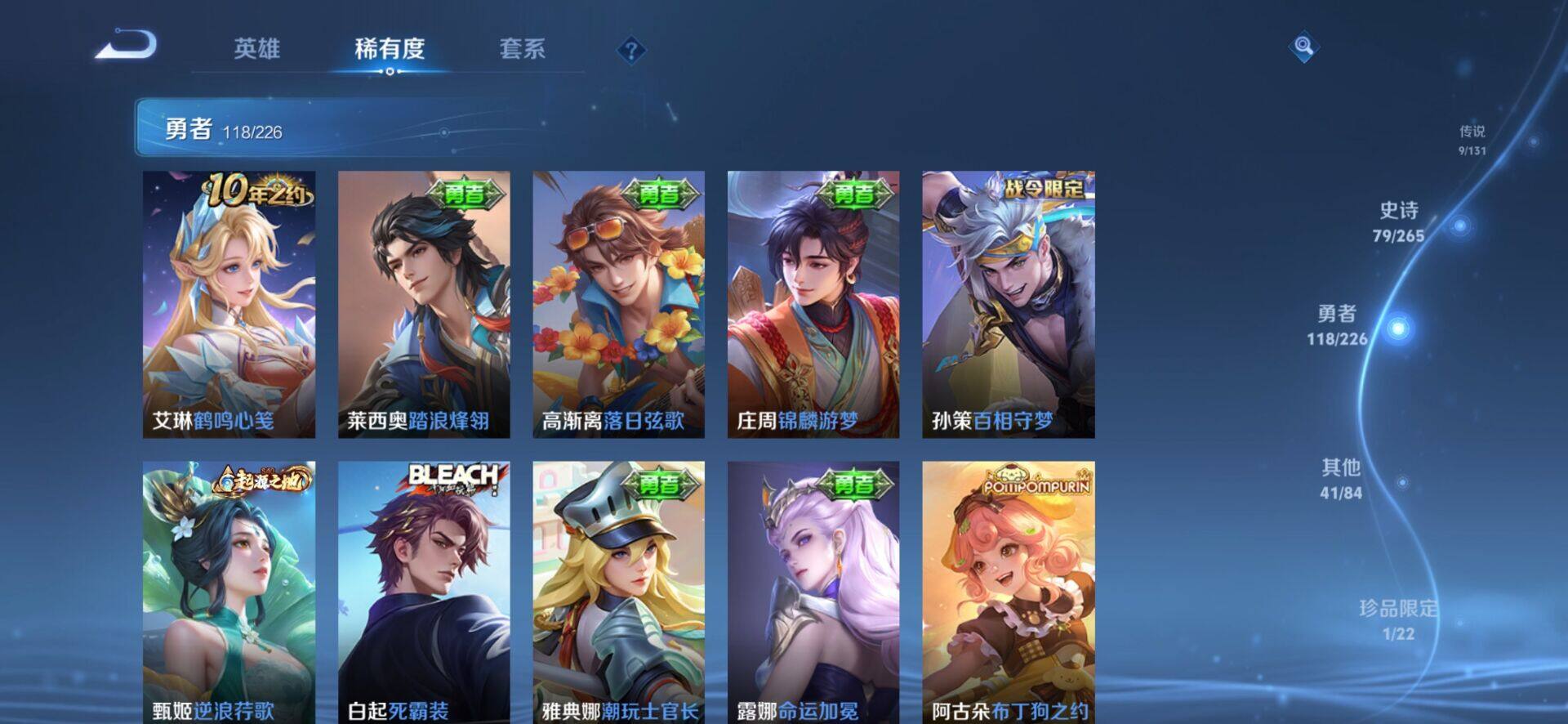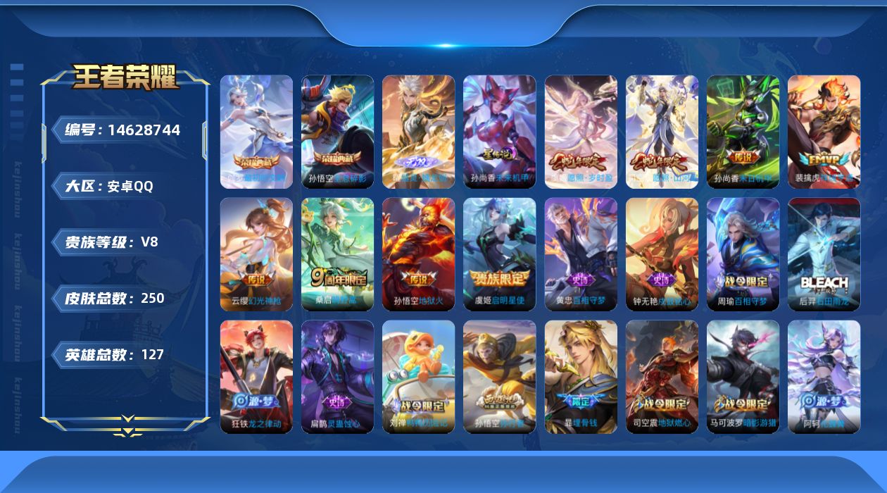 [14628744]安卓q-v8-最强王者段位-127英雄-250皮肤-2典藏皮肤-1无双-9传说-79史诗 【英雄全皮】:苍全皮,司空震全皮 【荣耀典藏】:孙悟空全息碎影,伽罗最初的交响 【无双皮肤】:曜器灵螭龙剑 【传说皮肤】:后羿神树通天,司空震愿照山河定,虞姬愿照岁时盈,云缨幻光神呛,裴擒虎祥瑞亨通,桑启鸣野蒿,虞姬启明星使,孙尚香末日机甲,孙悟空地狱火 【限定皮肤】:暃埋骨钱,蔡文姬夏日便利店,虞姬夏日便利店,姜子牙天穹之誓,杨戬破阵退雄兵,狄仁杰阴阳师,廉颇寅虎御盾,赵云皇家上将,墨子降魔,鲁班七号狮舞东方,高渐离玩趣恶龙,钟无艳超时空战士,白起夜都怪侠,周瑜赤莲之焰,元歌云间偶戏,元歌无心,夏侯惇朔风刀,甄姬落雪兰心,马可波罗暗影游猎,狄仁杰魔术师,狄仁杰万华元夜,达摩沙漠行僧,项羽海滩派对,王昭君午后时光,兰陵王驯魔猎人,兰陵王金庭之子,孙悟空孙行者,李元芳匿光侦查者,李元芳云中旅人,虞姬启明星使,钟馗神迹守卫,钟馗驱傩正仪,雅典娜单词大作战,雅典娜黎明之约,鬼谷子原初探秘者,鬼谷子五谷丰年,百里玄策原初追逐者,弈星混沌棋,梦奇顽趣,沈梦溪大漠名商,明世隐疑决卦,明世隐吟游魔法,裴擒虎天狼狩猎者,裴擒虎李小龙,裴擒虎擒涛扼浪,狂铁电玩高手,鲁班大师探海日志,桑启海盐诗旅,艾琳女武神,艾琳流音漫舞,司空震地狱燃心,阿古朵江河有灵,张良古海寻踪,蒙恬荣光圣徽,沈梦溪龙舞盛年,鲁班七号蔬乡物语,李元芳蔬乡物语,刘邦剑破天穹,程咬金群星魔术团,镜青焰无极,项羽苍威无极,刘备异域游侠,周瑜熔金海岸 【年限皮肤】:廉颇寅虎御盾 【赛季限定】:夏侯惇朔风刀,狄仁杰万华元夜,达摩沙漠行僧,兰陵王金庭之子,张良古海寻踪,李元芳云中旅人,钟馗驱傩正仪,雅典娜黎明之约,鬼谷子原初探秘者,百里玄策原初追逐者,弈星混沌棋,梦奇顽趣,沈梦溪大漠名商,明世隐疑决卦,裴擒虎擒涛扼浪,鲁班大师探海日志,桑启海盐诗旅,蒙恬荣光圣徽,刘邦剑破天穹,姜子牙天穹之誓 【战令限定】:蔡文姬夏日便利店,虞姬夏日便利店,鲁班七号狮舞东方,钟无艳超时空战士,白起夜都怪侠,周瑜赤莲之焰,元歌云间偶戏,甄姬落雪兰心,马可波罗暗影游猎,王昭君午后时光,兰陵王驯魔猎人,艾琳流音漫舞,钟馗神迹守卫,雅典娜单词大作战,明世隐吟游魔法,狂铁电玩高手,司空震地狱燃心,鲁班七号蔬乡物语,李元芳蔬乡物语,镜青焰无极,项羽苍威无极 【史诗