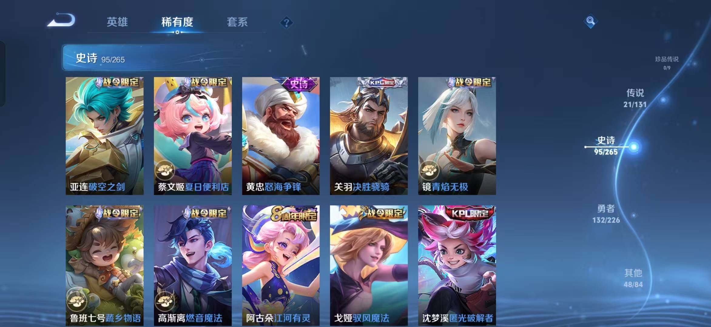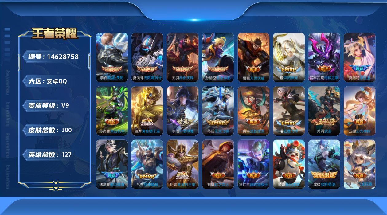 [14628758]安卓q-v9-最强王者段位-127英雄-300皮肤-4典藏皮肤-21传说-95史诗 【英雄全皮】:关羽全皮,苍全皮,戈娅全皮,影全皮 【荣耀典藏】:孙悟空全息碎影,夏侯惇无限飓风号,李白鸣剑曳影,关羽赤影疾锋 【传说皮肤】:后羿神树通天,曹操万灵伏威,云缨幻光神呛,典韦战鼓燎原,诸葛亮鹤羽星尊,夏洛特浮生妄,吕布怒海麟威,马超无双飞将,李元芳飞鸢探春,镜炽阳神光,虞姬启明星使,关羽武圣,曜云鹰飞将,李信一念神魔,刘备时之恋人,达摩黄金狮子座,梦奇胖达荣荣,后羿黄金射手座,孙尚香末日机甲,宫本武藏地狱之眼,狄仁杰超时空战士 【限定皮肤】:蔡文姬夏日便利店,大乔绒语心约,虞姬夏日便利店,姜子牙天穹之誓,狄仁杰阴阳师,赵云皇家上将,赵云引擎之心,嬴政优雅恋人,庄周云端筑梦师,高渐离死亡摇滚,高渐离玩趣恶龙,钟无艳超时空战士,扁鹊奇幻香踪,芈月白晶晶,元歌无心,甄姬落雪兰心,狄仁杰魔术师,狄仁杰万华元夜,达摩沙漠行僧,项羽海滩派对,关羽冰锋战神,关羽武圣,关羽百相守梦,貂蝉逐梦之音,程咬金演武夺筹,韩信逐梦之影,王昭君午后时光,兰陵王金庭之子,亚瑟潮玩骑士王,孙悟空美猴王,孙悟空至尊宝,孙悟空孙行者,李元芳云中旅人,虞姬启明星使,钟馗驱傩正仪,杨玉环遇见飞天,杨戬潮玩骑兵,干将莫邪冰霜恋舞曲,雅典娜单词大作战,太乙真人华丽摇滚,鬼谷子五谷丰年,诸葛亮鹤羽星尊,铠青龙志,苏烈千军破阵,百里玄策原初追逐者,沈梦溪大漠名商,沈梦溪匿光破解者,裴擒虎李小龙,裴擒虎擒涛扼浪,狂铁电玩高手,云中君纤云弄巧,嫦娥暖冬兔眠,西施玲珑珍味,蒙犽狂想玩偶喵,鲁班大师探海日志,桑启海盐诗旅,夏洛特浮生妄,暃星界游侠,戈娅驭风魔法,阿古朵江河有灵,张良古海寻踪,高渐离燃音魔法,妲己灵卜魔法,鬼谷子天穹祈灯,鲁班七号蔬乡物语,刘邦剑破天穹,关羽决胜骁骑,镜青焰无极,项羽苍威无极,周瑜熔金海岸 【年限皮肤】:铠青龙志,孙悟空美猴王,关羽武圣 【赛季限定】:狄仁杰万华元夜,达摩沙漠行僧,程咬金演武夺筹,兰陵王金庭之子,张良古海寻踪,李元芳云中旅人,钟馗驱傩正仪,苏烈千军破阵,百里玄策原初追逐者,沈梦溪大漠名商,裴擒虎擒涛扼浪,鲁班大师探海日志,桑启海盐诗旅,鬼谷子天穹祈灯,刘邦剑破天穹,姜子牙天穹之誓 【战令限定】:蔡文姬夏日便利店,虞姬夏日便利店,钟无艳超时空战士,扁鹊奇幻香踪,甄姬落雪兰心,王昭君