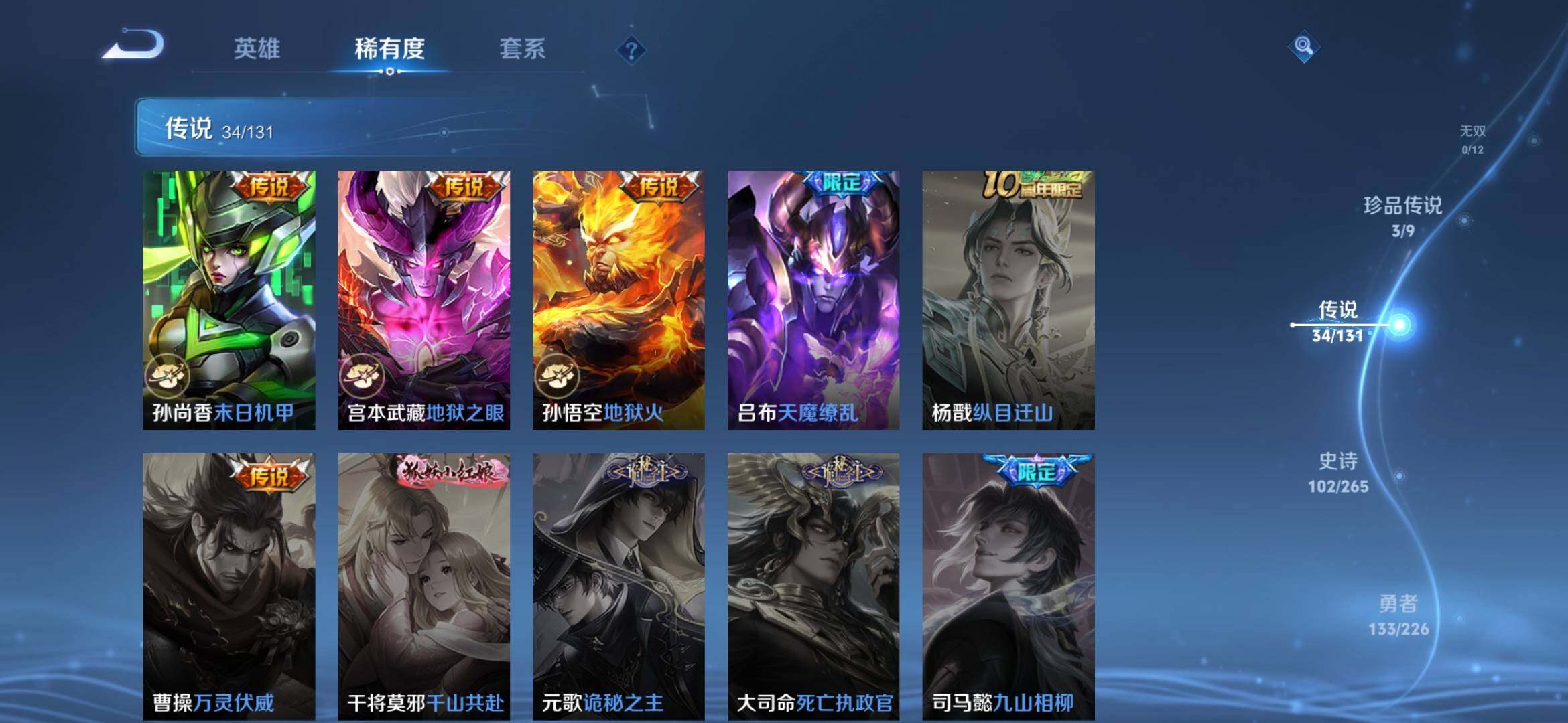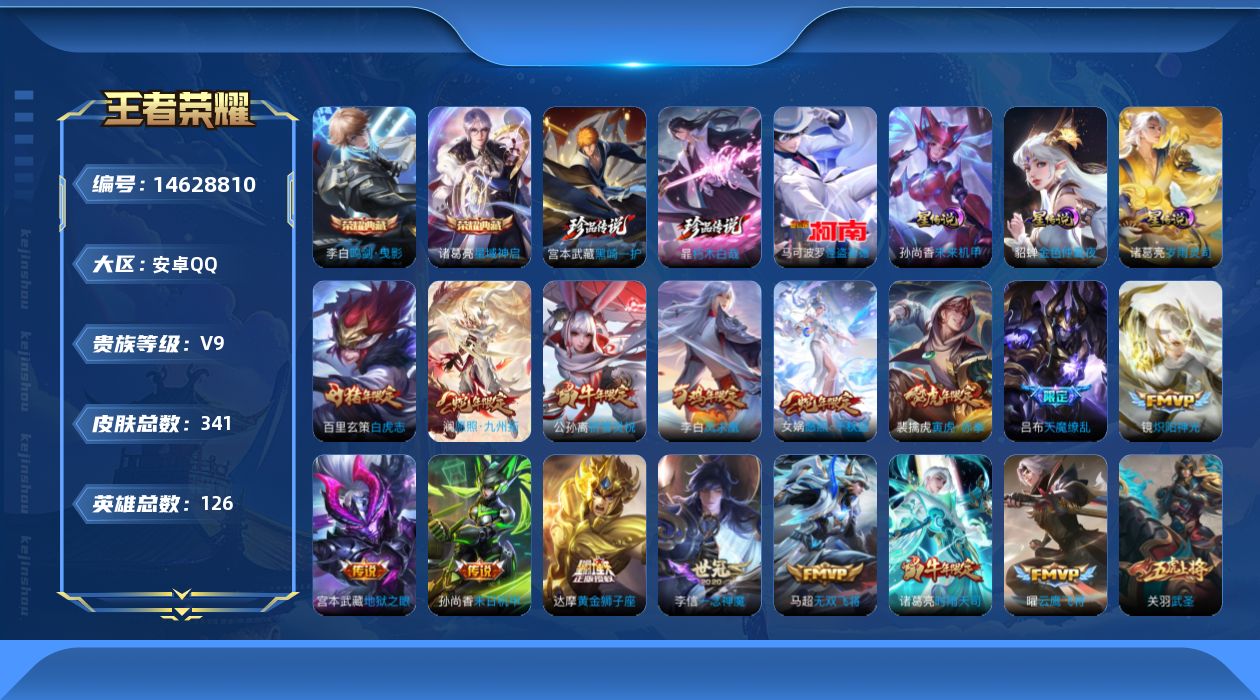[14628810]安卓q-v9-最强王者段位-126英雄-341皮肤-2典藏皮肤-3珍品传说-34传说-102史诗 【英雄全皮】:空空儿全皮,影全皮 【荣耀典藏】:李白鸣剑曳影,诸葛亮星域神启 【珍品传说】:马可波罗怪盗基德,暃朽木白哉,宫本武藏黑崎一护 【传说皮肤】:后羿神树通天,女娲愿照千秋盛,澜愿照九州拓,云缨幻光神呛,裴擒虎祥瑞亨通,桑启鸣野蒿,干将莫邪画中仙,孙尚香音你闪耀,马超无双飞将,裴擒虎寅虎赤拳,赵云淬星耀世,王昭君乞巧织情,西施游龙清影,周瑜音你心动,公孙离祈雪灵祝,诸葛亮时雨天司,铠绛天战甲,镜炽阳神光,虞姬启明星使,关羽武圣,曜云鹰飞将,李信一念神魔,张良黄金白羊座,干将莫邪久胜战神,达摩黄金狮子座,百里玄策白虎志,梦奇胖达荣荣,后羿黄金射手座,貂蝉仲夏夜之梦,李白凤求凰,孙尚香末日机甲,宫本武藏地狱之眼,孙悟空地狱火,吕布天魔缭乱 【限定皮肤】:暃埋骨钱,蒙犽顽岩魄,蔡文姬夏日便利店,虞姬夏日便利店,姜子牙天穹之誓,李白谪仙醉月,狄仁杰阴阳师,赵云皇家上将,赵云龙胆,鲁班七号狮舞东方,高渐离玩趣恶龙,白起夜都怪侠,吕布天魔缭乱,周瑜赤莲之焰,夏侯惇朔风刀,马可波罗逐梦之星,狄仁杰魔术师,狄仁杰万华元夜,项羽海滩派对,老夫子醍醐杖,关羽武圣,程咬金演武夺筹,韩信飞衡,兰陵王驯魔猎人,亚瑟潮玩骑士王,孙悟空至尊宝,孙悟空大圣娶亲,虞姬启明星使,钟馗神迹守卫,干将莫邪冰霜恋舞曲,干将莫邪画中仙,雅典娜单词大作战,蔡文姬繁星吟游,鬼谷子原初探秘者,诸葛亮时雨天司,黄忠烈魂,百里玄策白虎志,弈星混沌棋,梦奇顽趣,公孙离祈雪灵祝,明世隐疑决卦,裴擒虎李小龙,裴擒虎寅虎赤拳,狂铁御狮,米莱狄御霄,云中君纤云弄巧,盾山御銮,猪八戒猪悟能,上官婉儿梁祝,嫦娥拒霜思,蒙犽狂想玩偶喵,艾琳女武神,艾琳流音漫舞,司空震地狱燃心,阿古朵江河有灵,张良古海寻踪,蒙犽百解令,高渐离燃音魔法,妲己灵卜魔法,鬼谷子天穹祈灯,伽罗琥珀纪元,沈梦溪龙舞盛年,鲁班七号蔬乡物语,镜青焰无极,项羽苍威无极,周瑜熔金海岸 【年限皮肤】:百里玄策白虎志,裴擒虎寅虎赤拳,李白凤求凰,公孙离祈雪灵祝,诸葛亮时雨天司,韩信飞衡,关羽武圣,黄忠烈魂,赵云龙胆 【赛季限定】:夏侯惇朔风刀,狄仁杰万华元夜,老夫子醍醐杖,程咬金演武夺筹,张良古海寻踪,鬼谷子原初探秘者,弈星混沌棋,梦奇顽趣,明世隐疑决卦,狂铁御狮,米