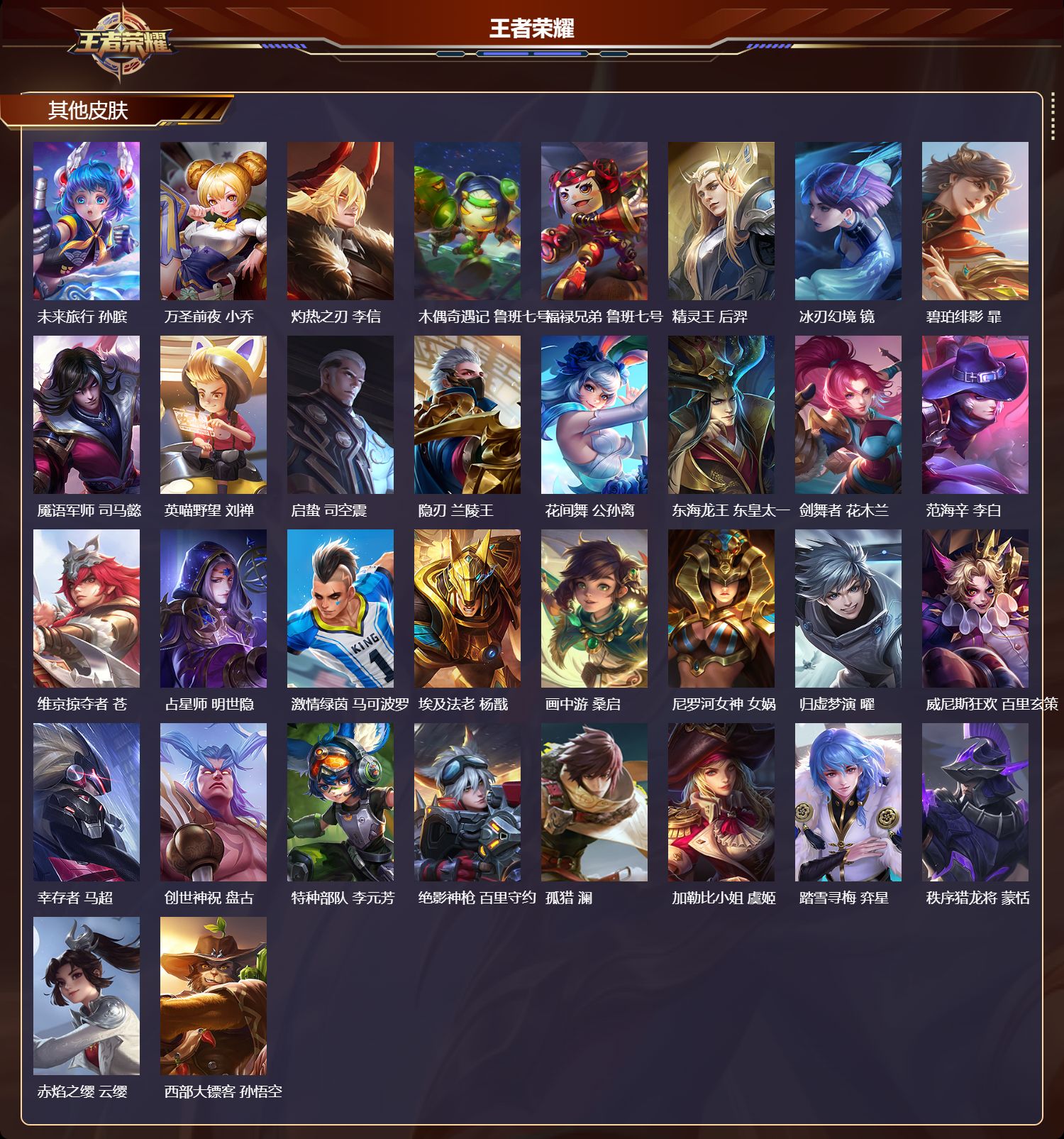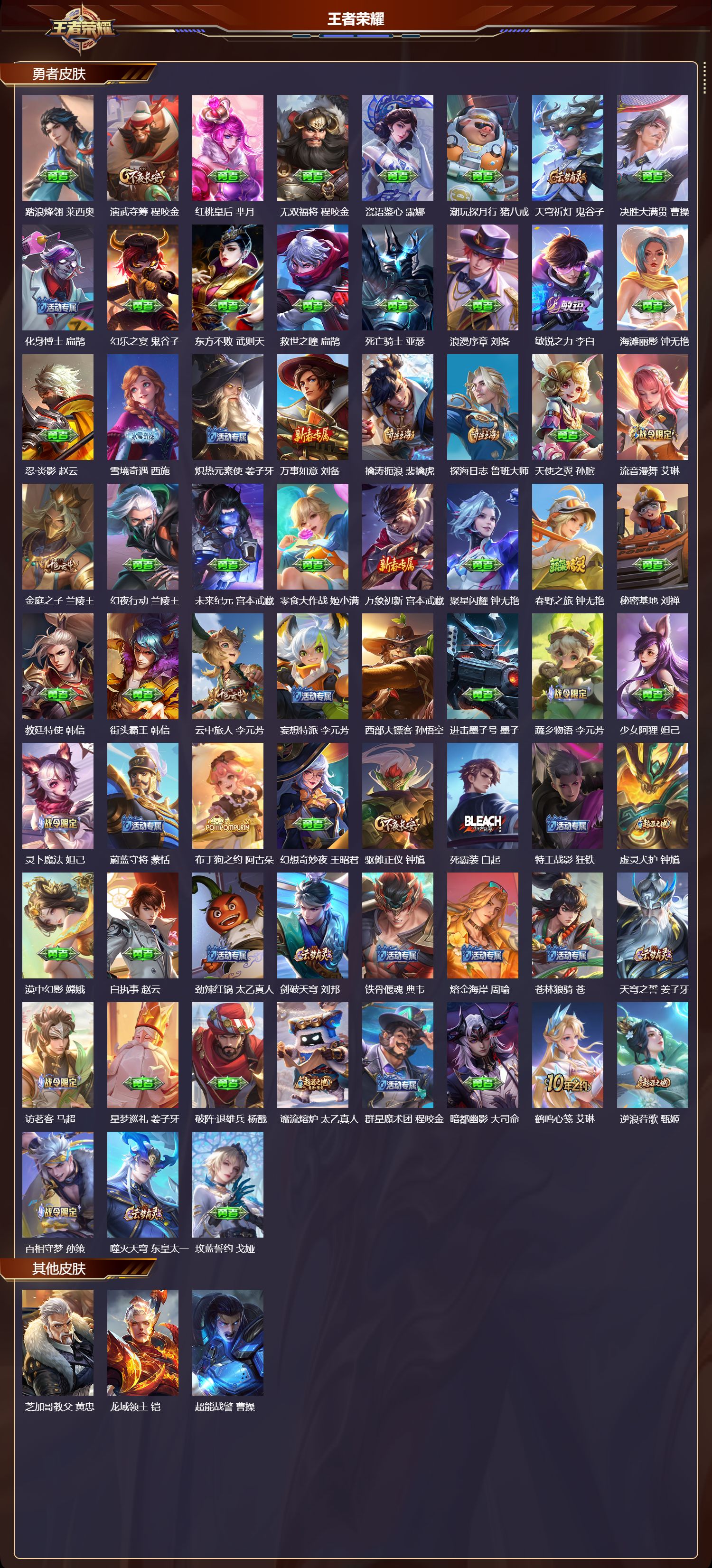 安卓qq/永恒钻石/174皮肤/126英雄/0典藏/0珍品无双/0无双/0珍品传说/6传说/41史诗/8稀有英雄【6 传说皮肤】九山相柳 司马懿地狱之眼 宫本武藏炽阳神光 镜久胜战神 干将莫邪乘龙·铭钟鼎 赵云鸣野蒿 桑启【41 史诗皮肤】蔬乡物语 鲁班七号紫霞仙子 露娜百解令 蒙犽燃音魔法 高渐离鬼剑武藏 宫本武藏百相守梦 黄忠地狱燃心 司空震顽趣 梦奇拒霜思 嫦娥