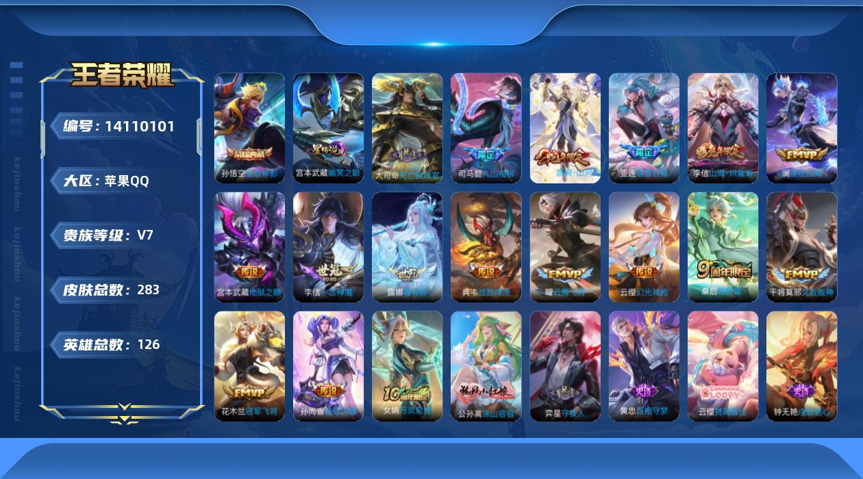[14110101]34按键 苹果q-v7-283皮肤-1典藏皮肤-17传说-83史诗 【英雄全皮】:司马懿全皮,孙权全皮,苍全皮,李信全皮,司空震全皮,空空儿全皮,影全皮 【荣耀典藏】:孙悟空全息碎影 【传说皮肤】:后羿神树通天,大司命死亡执政官,司马懿九山相柳,司空震愿照山河定,云缨幻光神呛,桑启鸣野蒿,亚连落雪白狼,典韦战鼓燎原,澜逐花归海,露娜霜月吟,李信山海炽霜斩,孙尚香音你闪耀,曜云鹰飞将,李信一念神魔,干将莫邪久胜战神,花木兰冠军飞将,宫本武藏地狱之眼 【限定皮肤】:暃埋骨钱,蒙犽顽岩魄,蔡文姬夏日便利店,大乔绒语心约,虞姬夏日便利店,姜子牙天穹之誓,杨戬破阵退雄兵,李白谪仙醉月,狄仁杰阴阳师,赵云皇家上将,高渐离玩趣恶龙,阿轲迷踪丽影,元歌云间偶戏,马可波罗暗影游猎,狄仁杰魔术师,狄仁杰万华元夜,达摩沙漠行僧,项羽海滩派对,老夫子醍醐杖,程咬金演武夺筹,兰陵王金庭之子,李元芳云中旅人,钟馗驱傩正仪,干将莫邪胡桃夹子,鬼谷子原初探秘者,鬼谷子五谷丰年,弈星混沌棋,沈梦溪大漠名商,明世隐疑决卦,裴擒虎李小龙,裴擒虎擒涛扼浪,狂铁电玩高手,云中君纤云弄巧,李信山海炽霜斩,嫦娥拒霜思,鲁班大师探海日志,桑启海盐诗旅,艾琳女武神,艾琳流音漫舞,司空震地狱燃心,阿古朵江河有灵,张良古海寻踪,蒙犽百解令,鬼谷子天穹祈灯,百里玄策超元猎域,亚连落雪白狼,沈梦溪龙舞盛年,鲁班七号蔬乡物语,刘邦剑破天穹,程咬金群星魔术团,镜青焰无极,项羽苍威无极,刘备异域游侠,芈月浮光幕影,周瑜熔金海岸 【年限皮肤】:李信山海炽霜斩 【赛季限定】:狄仁杰万华元夜,达摩沙漠行僧,老夫子醍醐杖,程咬金演武夺筹,兰陵王金庭之子,张良古海寻踪,李元芳云中旅人,钟馗驱傩正仪,鬼谷子原初探秘者,弈星混沌棋,沈梦溪大漠名商,明世隐疑决卦,裴擒虎擒涛扼浪,鲁班大师探海日志,桑启海盐诗旅,鬼谷子天穹祈灯,刘邦剑破天穹,姜子牙天穹之誓 【战令限定】:蔡文姬夏日便利店,虞姬夏日便利店,阿轲迷踪丽影,元歌云间偶戏,马可波罗暗影游猎,艾琳流音漫舞,狂铁电玩高手,司空震地狱燃心,鲁班七号蔬乡物语,镜青焰无极,项羽苍威无极 【史诗皮肤】:鲁班七号电玩小子,项羽苍穹之光,露娜紫霞仙子,赵云皇家上将,赵云未来纪元,貂蝉圣诞恋歌,甄姬冰雪圆舞曲,王昭君偶像歌手,狄仁杰魔术师,廉颇地狱岩魂,宫本武藏鬼剑武藏,孙尚香水果甜心,妲己魅力维加斯,