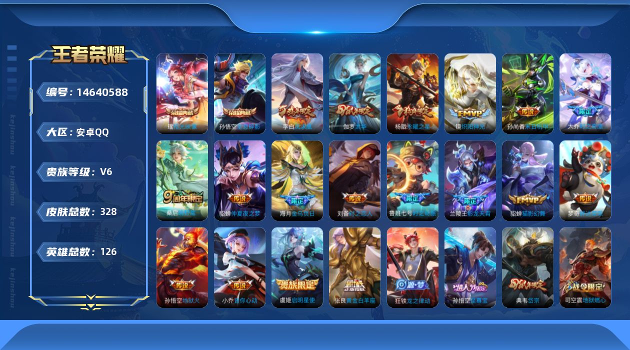 [14640588]k1204/可二次/【安卓qq/营地545928741】【126英雄-328皮肤-2典藏-18传说-95史诗】刘邦全皮,钟馗全皮,空空儿全皮,影全皮,孙悟空全息碎影,瑶拾光映像,桑启鸣野蒿,海月金乌负日,大乔时之奇旅,鲁班七号时之奇旅,兰陵王影龙天霄,小乔音你心动,镜炽阳神光,虞姬启明星使,刘备时之恋人,伽罗太华,貂蝉猫影幻舞,张良黄金白羊座,梦奇胖达荣荣,杨戬永曜之星,貂蝉仲夏夜之梦,李白凤求凰,孙尚香末日机甲,孙悟空地狱火,大乔绒语心约,姜子牙天穹之誓,狄仁杰阴阳师,赵云皇家上将,赵云龙胆,详情看图