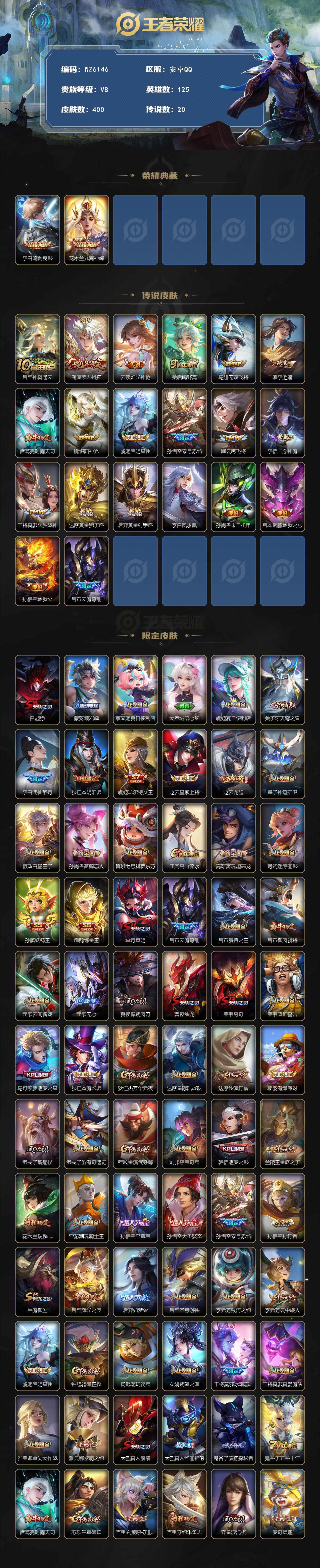 安卓q-v8-最强王者段位-125英雄-400皮肤-2典藏-0珍品无双-0无双-0珍品传说-20传说-113史诗 【英雄全皮】:刘邦全皮,孙权全皮,鬼谷子全皮,蒙恬全皮,空空儿全皮,影全皮,海诺全皮 【荣耀典藏】:李白鸣剑曳影,花木兰九霄神辉 【传说皮肤】:后羿神树通天,澜愿照九州拓,云缨幻光神呛,桑启鸣野蒿,马超无双飞将,曜李 ,诸葛亮时雨天司,镜炽阳神光,虞姬启明星使,孙悟空零号赤焰,曜云鹰飞将,李信一念神魔,干将莫邪久胜战神,达摩黄金狮子座,后羿黄金射手座,李白凤求凰,孙尚香末日机甲,宫本武藏地狱之眼,孙悟空地狱火,吕布天魔缭乱 【限定皮肤】:白起狰,蒙犽顽岩魄,蔡文姬夏日便利店,大乔绒语心约,虞姬夏日便利店,姜子牙天穹之誓,李白谪仙醉月,狄仁杰阴阳师,虞姬凯尔特女王,赵云皇家上将,赵云龙胆,墨子神迹守卫,嬴政白昼王子,孙尚香蔷薇恋人,鲁班七号狮舞东方,庄周高山流水,高渐离玩趣恶龙,阿轲迷踪丽影,孙膑妖精王,扁鹊炼金王,芈月重明,吕布天魔缭乱,吕布猎兽之王,吕布御风骁将,元歌云间偶戏,元歌无心,夏侯惇朔风刀,曹操烛龙,典韦穷奇,典韦蓝屏警告,马可波罗逐梦之星,狄仁杰魔术师,狄仁杰万华元夜,达摩星际陆战队,达摩沙漠行僧,项羽海滩派对,老夫子醍醐杖,老夫子航海奇遇记,程咬金演武夺筹,刘邦夺宝奇兵,韩信逐梦之影,兰陵王金庭之子,花木兰瑞麟志,亚瑟潮玩骑士王,孙悟空至尊宝,孙悟空大圣娶亲,孙悟空零号赤焰,孙悟空孙行者,牛魔御旌,后羿辉光之辰,后羿如梦令,后羿圣弓游侠,李元芳银河之约,李元芳云中旅人,虞姬启明星使,钟馗驱傩正仪,杨戬潮玩骑兵,女娲朔望之晖,干将莫邪冰霜恋舞曲,干将莫邪真爱魔法,雅典娜单词大作战,雅典娜黎明之约,太乙真人饕餮,太乙真人华丽摇滚,鬼谷子原初探秘者,鬼谷子五谷丰年,诸葛亮时雨天司,苏烈千军破阵,百里玄策原初追逐者,百里守约朱雀志,弈星混沌棋,梦奇顽趣,公孙离蜜橘之夏,沈梦溪星空之诺,沈梦溪大漠名商,明世隐疑决卦,裴擒虎李小龙,裴擒虎擒涛扼浪,狂铁御狮,米莱狄御霄,米莱狄胡桃异想国,云中君纤云弄巧,盾山御銮,上官婉儿梁祝,嫦娥拒霜思,曜李 ,西施玲珑珍味,蒙犽狂想玩偶喵,鲁班大师探海日志,镜匿光追影者,桑启海盐诗旅,艾琳流音漫舞,张良古海寻踪,裴擒虎梅西,蒙犽百解令,蒙恬荣光圣徽,高渐离燃音魔法,妲己灵卜魔法,鬼谷子天穹祈灯,伽罗琥珀纪元,姬小满妄想食味,沈梦溪龙舞盛年,鲁班七号蔬乡物语,李元芳蔬乡物语,刘邦剑破天穹,程咬金群星魔术团,镜青焰无极,项羽苍威无极,海诺心动手记,刘备异域游侠,芈月浮光幕影,周瑜熔金海岸 【年限皮肤】:百里守约朱雀志,花木兰瑞麟志,李白凤求凰,后羿辉光之辰,吕布御风骁将,诸葛亮时雨天司,马超神威,赵云龙胆 【赛季限定】:孙膑妖精王,扁鹊炼金王,白起狰,芈月重明,夏侯惇朔风刀,曹操烛龙,典韦穷奇,狄仁杰万华元夜,达摩沙漠行僧,老夫子醍醐杖,程咬金演武夺筹,兰陵王金庭之子,张良古海寻踪,牛魔御旌,李元芳云中旅人,虞姬凯尔特女王,钟馗驱傩正仪,雅典娜黎明之约,太乙真人饕餮,鬼谷子原初探秘者,苏烈千军破阵,百里玄策原初追逐者,弈星混沌棋,梦奇顽趣,沈梦溪大漠名商,明世隐疑决卦,裴擒虎擒涛扼浪,狂铁御狮,米莱狄御霄,盾山御銮,鲁班大师探海日志,桑启海盐诗旅,鬼谷子天穹祈灯,蒙恬荣光圣徽,刘邦剑破天穹,姜子牙天穹之誓 【战令限定】:墨子神迹守卫,蔡文姬夏日便利店,虞姬夏日便利店,嬴政白昼王子,鲁班七号狮舞东方,阿轲迷踪丽影,吕布猎兽之王,元歌云间偶戏,典韦蓝屏警告,达摩星际陆战队,老夫子航海奇遇记,刘邦夺宝奇兵,艾琳流音漫舞,亚瑟潮玩骑士王,后羿圣弓游侠,李元芳银河之约,杨戬潮玩骑兵,女娲朔望之晖,干将莫邪真爱魔法,雅典娜单词大作战,沈梦溪星空之诺,米莱狄胡桃异想国,西施玲珑珍味,蒙犽狂想玩偶喵,高渐离燃音魔法,妲己灵卜魔法,鲁班七号蔬乡物语,李元芳蔬乡物语,镜青焰无极,项羽苍威无极 【史诗皮肤】:项羽苍穹之光,露娜紫霞仙子,阿轲暗夜猫娘,赵云皇家上将,赵云未来纪元,貂蝉圣诞恋歌,甄姬冰雪圆舞曲,王昭君偶像歌手,狄仁杰魔术师,廉颇地狱岩魂,宫本武藏鬼剑武藏,孙尚香蔷薇恋人,孙尚香水果甜心,嬴政摇滚巨星,妲己魅力维加斯,妲己女仆咖啡,墨子龙骑士,墨子金属风暴,吕布圣诞狂欢,刘禅绅士熊喵,曹操幽灵船长,李白千年之狐,吕布末日机甲,张飞乱世虎臣,孙悟空至尊宝,花木兰水晶猎龙者,刘邦德古拉伯爵,韩信逐梦之影,夏侯惇乘风破浪,小乔缤纷独角兽,兰陵王暗隐猎兽者,诸葛亮黄金分割率,马可波罗逐梦之星,雅典娜冰冠公主,安琪拉心灵骇客,后羿辉光之辰,百里守约特工魅影,铠曙光守护者,蔡文姬舞动绿茵,裴擒虎梅西,刘禅天才门将,公孙离蜜橘之夏,李元芳逐浪之夏,程咬金功夫厨神,白起星夜王子,阿轲节奏热浪,嬴政白昼王子,大乔猫狗日记,百里守约朱雀志,干将莫邪冰霜恋舞曲,孙悟空大圣娶亲,花木兰瑞麟志,典韦蓝屏警告,鲁班七号狮舞东方,狄仁杰鹰眼统帅,上官婉儿梁祝,李元芳银河之约,后羿如梦令,大乔白蛇,阿轲迷踪丽影,橘右京修罗,马超神威,赵云龙胆,蒙犽狂想玩偶喵,百里玄策原初追逐者,裴擒虎李小龙,云中君纤云弄巧,元歌云间偶戏,吕布御风骁将,米莱狄胡桃异想国,百里玄策热力回旋,老夫子航海奇遇记,杨戬天秀启明,干将莫邪真爱魔法,沈梦溪月团寄思,孙悟空孙行者,庄周