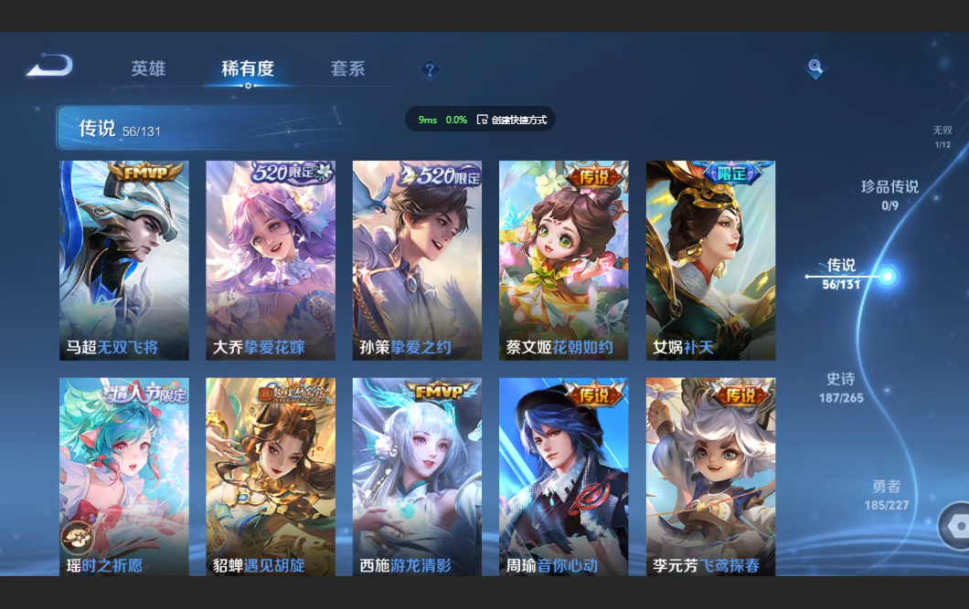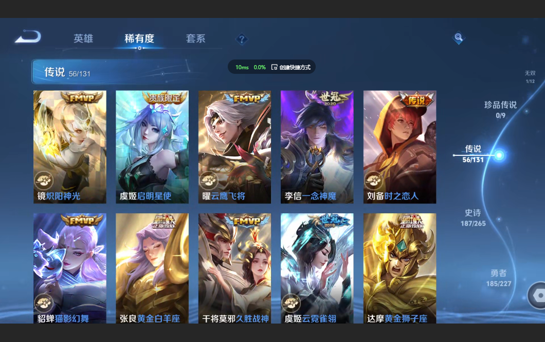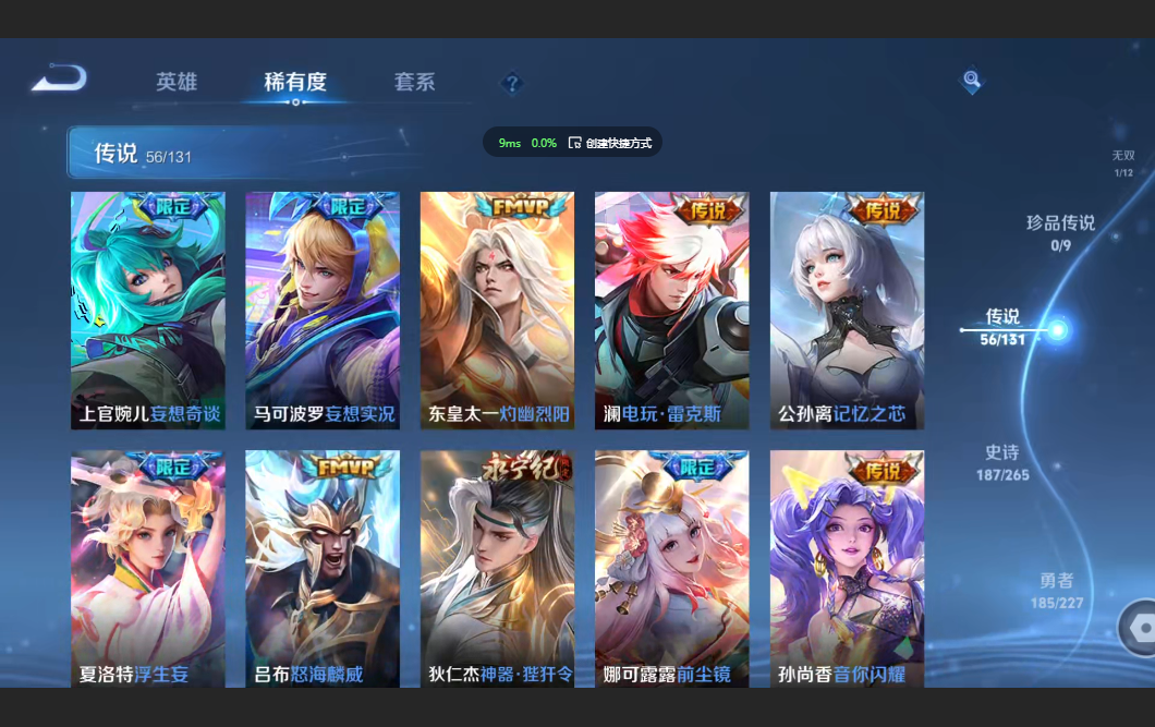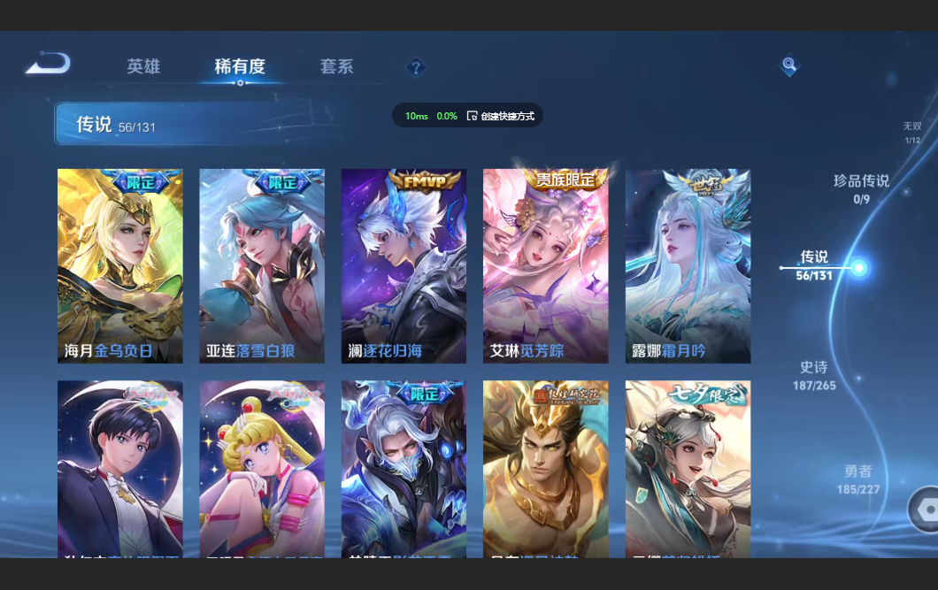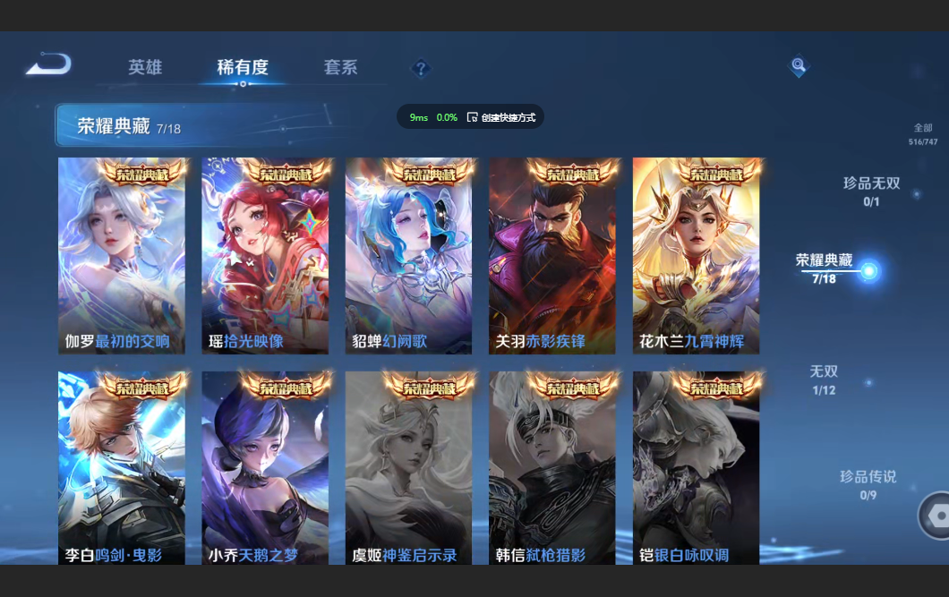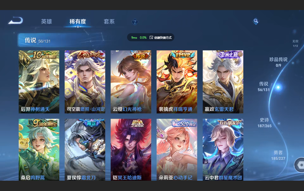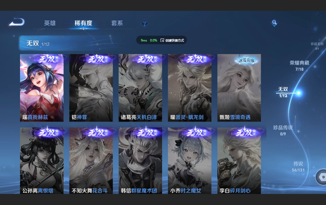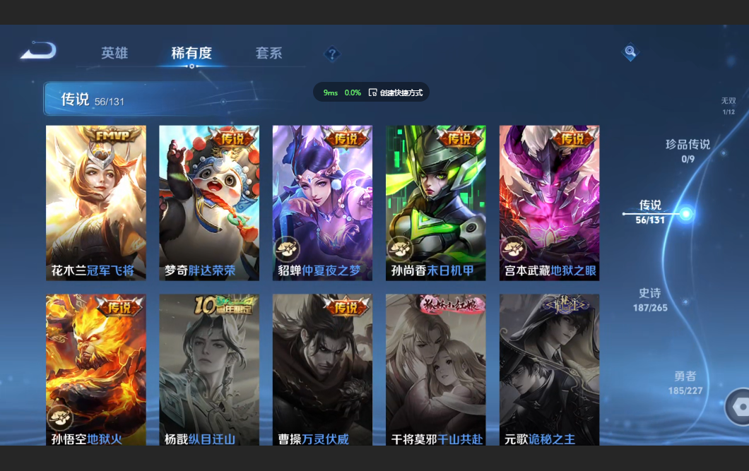【56传说 瑶无双皮肤 7典藏 4小国标 5金标】苹微信/v10/516皮肤/125英雄/7典藏/1无双/56传说【4 小国标】小国标嬴政小国标海月小国标不知火舞小国标姜子牙【1 星传说皮肤】幽冥之眼 宫本武藏【7 典藏皮肤】鸣剑·曳影 李白天鹅之梦 小乔幻阙歌 貂蝉九霄神辉 花木兰赤影疾锋 关羽拾光映像 瑶最初的交响 伽罗【1 无双皮肤】真我赫兹 瑶【56 传说