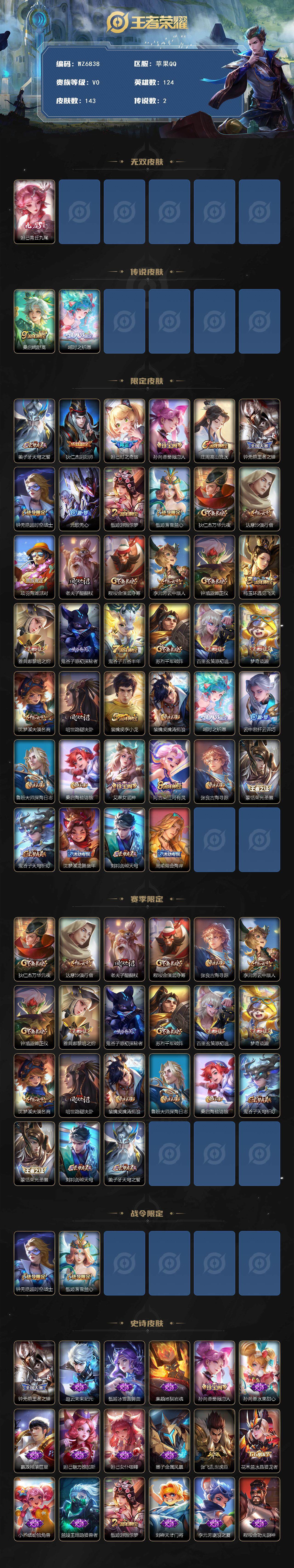 苹果q-v0-至尊星耀ii段位-124英雄-143皮肤-1无双-2传说-37史诗 【无双皮肤】:妲己青丘九尾 【传说皮肤】:桑启鸣野蒿,瑶时之祈愿 【限定皮肤】:姜子牙天穹之誓,狄仁杰阴阳师,妲己时之奇旅,孙尚香蔷薇恋人,庄周高山流水,钟无艳王者之锤,钟无艳超时空战士,元歌无心,甄姬游园惊梦,甄姬落雪兰心,狄仁杰万华元夜,达摩沙漠行僧,项羽海滩派对,老夫子醍醐杖,程咬金演武夺筹,李元芳云中旅人,钟馗驱傩正仪,杨玉环遇见飞天,雅典娜黎明之约,鬼谷子原初探秘者,鬼谷子五谷丰年,苏烈千军破阵,百里玄策原初追逐者,梦奇顽趣,沈梦溪大漠名商,明世隐疑决卦,裴擒虎李小龙,裴擒虎擒涛扼浪,瑶时之祈愿,云中君纤云弄巧,鲁班大师探海日志,桑启海盐诗旅,艾琳女武神,阿古朵江河有灵,张良古海寻踪,蒙恬荣光圣徽,鬼谷子天穹祈灯,沈梦溪龙舞盛年,刘邦剑破天穹,周瑜熔金海岸 【赛季限定】:狄仁杰万华元夜,达摩沙漠行僧,老夫子醍醐杖,程咬金演武夺筹,张良古海寻踪,李元芳云中旅人,钟馗驱傩正仪,雅典娜黎明之约,鬼谷子原初探秘者,苏烈千军破阵,百里玄策原初追逐者,梦奇顽趣,沈梦溪大漠名商,明世隐疑决卦,裴擒虎擒涛扼浪,鲁班大师探海日志,桑启海盐诗旅,鬼谷子天穹祈灯,蒙恬荣光圣徽,刘邦剑破天穹,姜子牙天穹之誓 【战令限定】:钟无艳超时空战士,甄姬落雪兰心 【史诗皮肤】:钟无艳王者之锤,赵云未来纪元,甄姬冰雪圆舞曲,廉颇地狱岩魂,孙尚香蔷薇恋人,孙尚香水果甜心,嬴政摇滚巨星,妲己魅力维加斯,妲己女仆咖啡,墨子金属风暴,张飞乱世虎臣,花木兰水晶猎龙者,小乔缤纷独角兽,兰陵王暗隐猎兽者,甄姬游园惊梦,刘禅天才门将,李元芳逐浪之夏,程咬金功夫厨神,杨玉环遇见飞天,狄仁杰鹰眼统帅,百里玄策原初追逐者,裴擒虎李小龙,云中君纤云弄巧,庄周高山流水,雅典娜黎明之约,钟无艳超时空战士,妲己时之奇旅,鬼谷子五谷丰年,元歌无心,梦奇顽趣,刘禅电玩爆裂旋风,阿古朵江河有灵,蒙恬荣光圣徽,牛魔星界战将,阿轲化蝶舞,后羿石田雨龙,黄忠百相守梦 【其他皮肤】:项羽海滩派对,韩信街头霸王,赵云忍炎影,芈月红桃皇后,艾琳女武神,白起白色死神,武则天东方不败,扁鹊化身博士,宫本武藏未来纪元,安琪拉玩偶对对碰,妲己少女阿狸,典韦黄金武士,亚瑟死亡骑士,花木兰兔女郎,张飞五福同心,甄姬花好人间,刘备万事如意,后羿阿尔法小队,狄仁杰阴阳师,刘备汉昭烈帝,钟无艳海滩丽影,诸葛亮掌控之力,李白敏锐之力,苏烈坚韧之力,大乔守护之力,明世隐虹云星官,小乔丁香结,孙膑归虚梦演,沈梦溪鲨炮海盗猫,哪吒次元突破,明世隐疑决卦,盾山圆桌骑士,老夫子醍醐杖,狂铁特工战影,鬼谷子原初探秘者,狄仁杰万华元夜,刘禅秘密基地,程咬金演武夺筹,张良缤纷绘卷,钟馗驱傩正仪,鲁班大师乓乓大师,苏烈千军破阵,达摩沙漠行僧,刘禅唤灵魔甲,沈梦溪大漠名商,甄姬落雪兰心,李元芳云中旅人,刘备潮玩造梦师,桑启海盐诗旅,赵怀真太极少年,裴擒虎擒涛扼浪,太乙真人劲辣红锅,鲁班大师探海日志,李元芳妄想特派,张良古海寻踪,钟无艳聚星闪耀,鬼谷子天穹祈灯,嫦娥漠中幻影,沈梦溪龙舞盛年,钟无艳春野之旅,刘邦剑破天穹,姜子牙天穹之誓,周瑜熔金海岸,盘古敬我三分,东皇太一噬灭天穹,干将莫邪雾都夜雨,苍苍林狼骑,少司缘灵卦秘语,戈娅玫蓝誓约,钟馗虚灵犬护,露娜命运加冕,白起死霸装,甄姬逆浪荇歌,庄周锦麟游梦,鬼谷子克喵,鲁班七号福禄兄弟,项羽帝国元帅,貂蝉异域舞娘,老夫子潮流仙人,张良一千零一夜,孙膑未来旅行,刘邦圣殿之光,蔡文姬蔷薇王座,马可波罗激情绿茵,黄忠芝加哥教父,干将莫邪第七人偶,鬼谷子阿摩司公爵,百里守约绝影神呛,女娲尼罗河女神,明世隐占星师,公孙离花间舞,弈星踏雪寻梅,米莱狄精准探案法,司马懿魇语军师,伽罗花见巫女,上官婉儿修竹墨客,瑶森,云中君荷鲁斯之眼,西施归虚梦演,蒙犽归虚梦演,云缨赤焰之缨,金蝉前尘,桑启画中游 【内测皮肤】:孙尚香蔷薇恋人,艾琳女武神,狂铁特工战影 【营地id】:1793710503