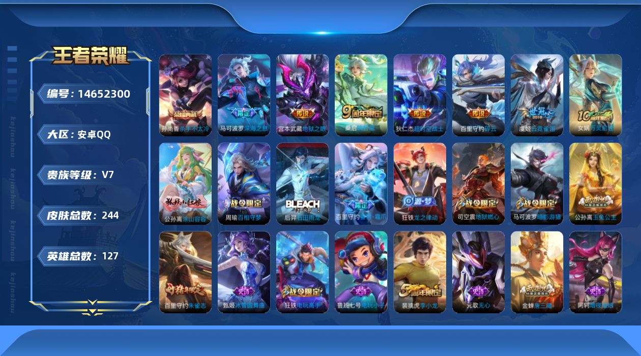 [14652300]v7 1典藏 7传说 127英雄 244皮肤 可修改实名 【英雄全皮】:敖隐全皮孙权全皮狂铁全皮金蝉全皮 【稀有英雄】:敖隐小龙人大司命嬴政始皇帝韩信韩跳跳夏洛特夏师傅艾琳橘右京橘子娜可露露鸟人不知火舞赵云金蝉唐僧戈娅 【荣耀水晶】:杀手不太冷 【传说皮】:神树通天地狱之眼云霓雀翎超时空战士-狄仁杰碎云 【珍宝阁皮】:万物之道女武神玩趣恶龙 【赛季/战令皮】:古海寻踪s33海盐诗旅s30擒涛扼浪s31探海日志s32流音漫舞顽趣-梦奇地狱燃心剑破天穹s35天穹祈灯s34饕餮s9重明s11穷奇s12御狮s13御霄s14御旌s15御銮s16朔风刀s17混沌棋s18疑决卦s19醍醐杖s20原初探秘者s21万华元夜s22演武夺筹s23驱傩正仪s24千军破阵s25西部大镖客-猪八戒暗影游猎游乐娃子火炮绅士沙漠行僧s26幻夜卜梦吟游魔法夜都怪侠金庭之子s27电玩高手电玩铁子午后时光大漠名商s28云中旅人s29超时空战士-钟无艳落雪兰心 【史诗皮】:雪豹·霜爪龙之律动石田雨龙百相守梦-周瑜星界战将星界特工涂山容容万灵启世电玩小子小书包特工魅影江河有灵高渐离燃音魔法百解令蒙犽蒙恬荣光圣徽龙骑士小龙虾冰冠公主偶像歌手电玩·爆裂旋风暗夜猫娘末日机甲-吕布乱世虎臣节奏热浪女仆咖啡摇滚巨星水果甜心星夜王子心灵骇客功夫厨神德古拉伯爵暗隐猎兽者幽灵船长鬼剑武藏心灵战警舞动绿茵纤云弄巧繁星吟游呼啦呼啦缤纷独角兽乘风破浪逐浪之夏水晶猎龙者箭羽风息金属风暴原初追逐者圣诞恋歌鹰眼统帅魅力维加斯黎明之约无心未来纪元-赵云 【限定皮】:鸣野蒿高山流水五谷丰年游园惊梦李小龙朱雀志守约年限玉兔公主深海之息深海大菠萝唐三藏 【普通皮】:苍林狼骑劲辣红锅刘邦虎啸剑宗程咬金群星魔术团春野之旅龙舞盛年功夫炙烤街头霸王星梦巡礼鹤鸣心笺径山谋武罗小黑战记-张良荣光之誓百相守梦-孙策踏浪烽翎罗小黑战记-哪吒