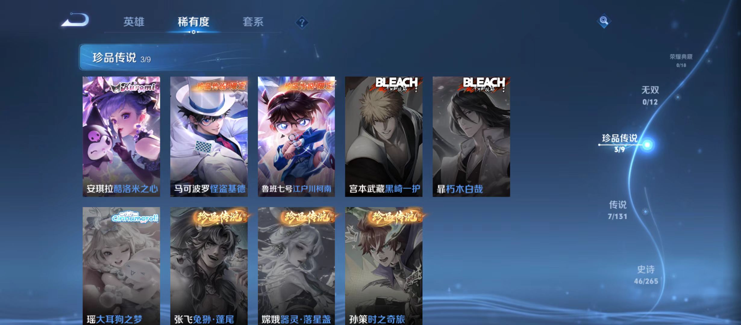 txwz24182 v7-154皮肤 3珍品 酷洛米之心,江户川柯南,怪盗基德 7传说神树通天,死亡执政官,云诺千山,愿照·岁时盈,超时空战士,鸣野蒿,黄金射手座 46史诗