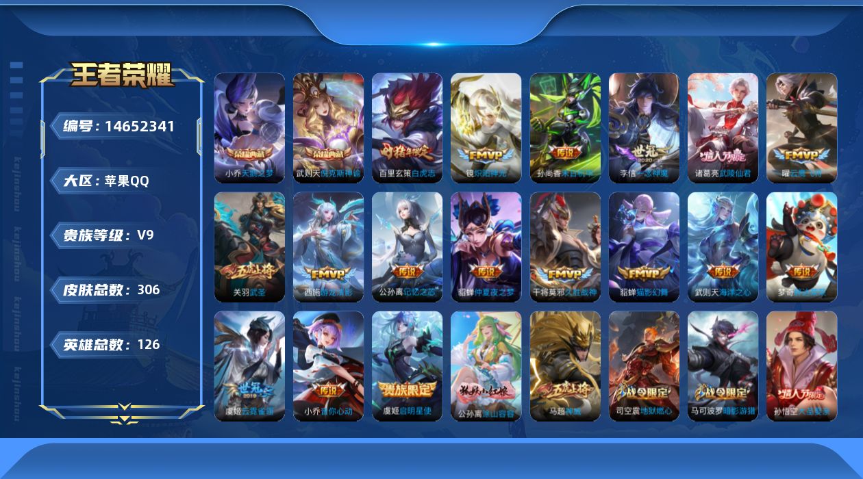 v9 2典藏 17传说 126英雄 306皮肤 典藏英雄武则天 可修改实名 【英雄全皮】:蒙恬全皮 【稀有英雄】:大司命嬴政始皇帝韩信韩跳跳夏洛特夏师傅艾琳橘右京橘子娜可露露鸟人不知火舞赵云金蝉唐僧戈娅 【荣耀水晶】:天鹅之梦小乔典藏倪克斯神谕宇