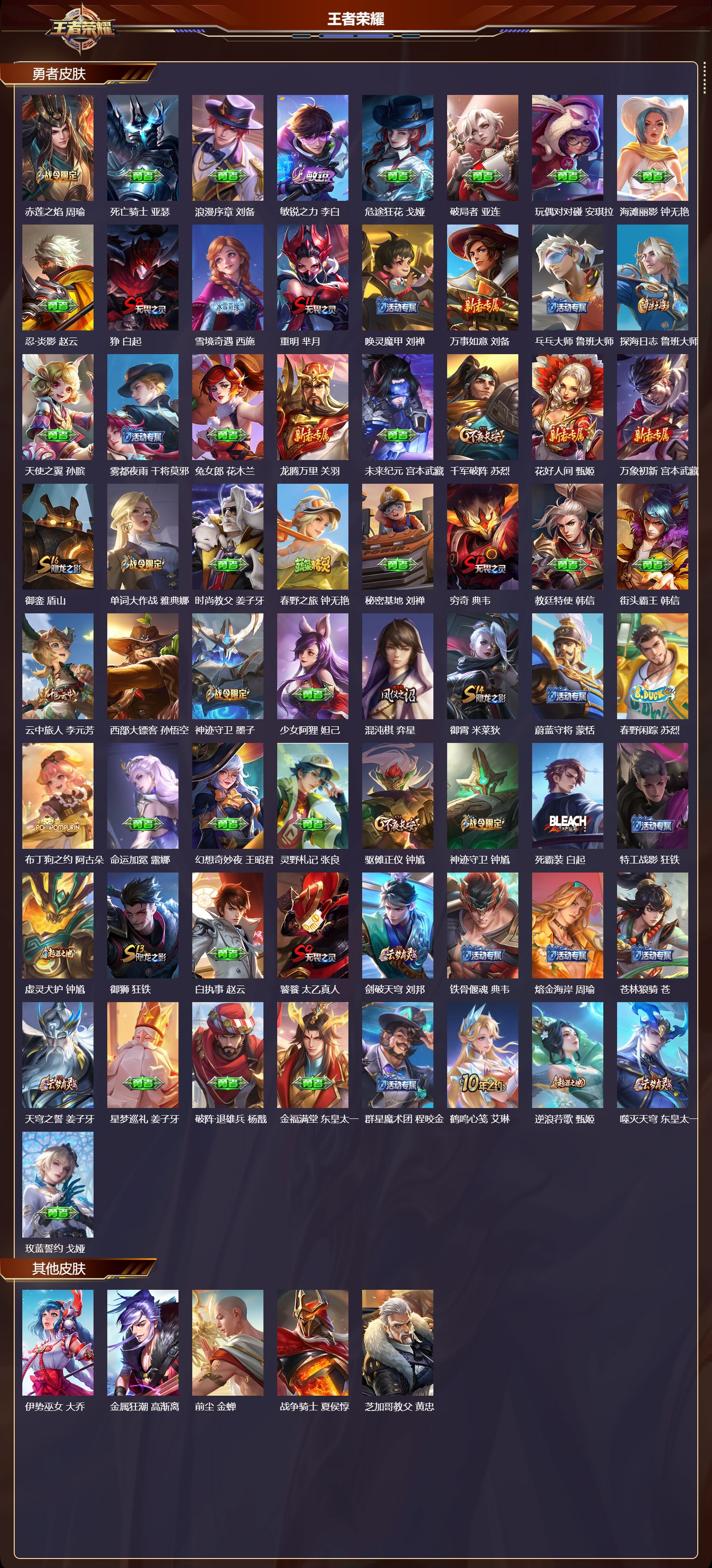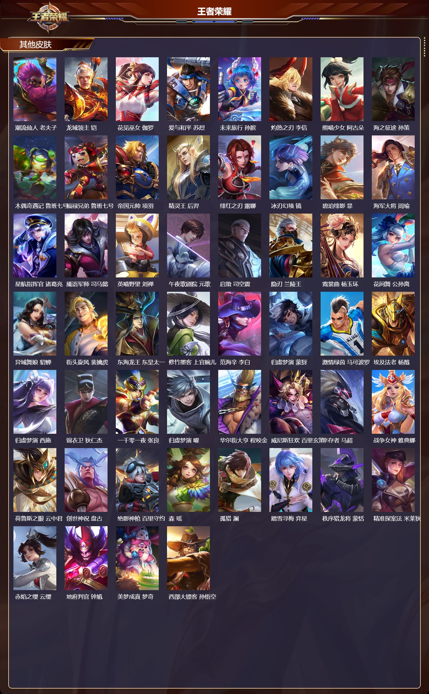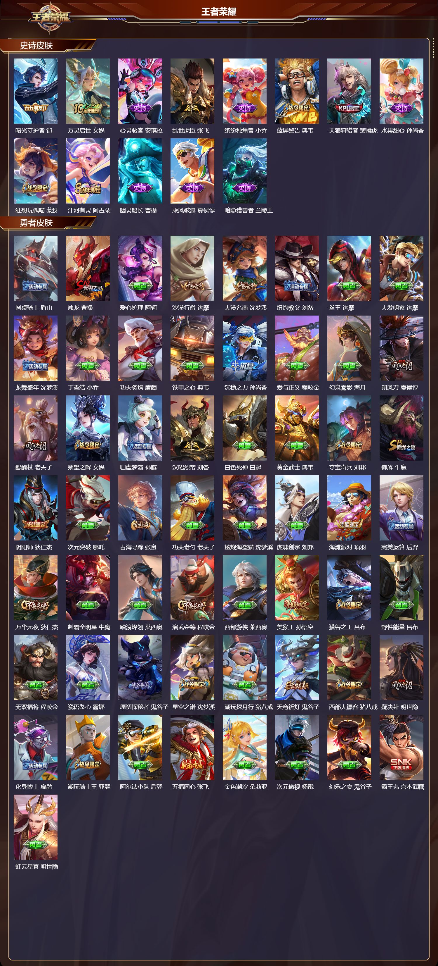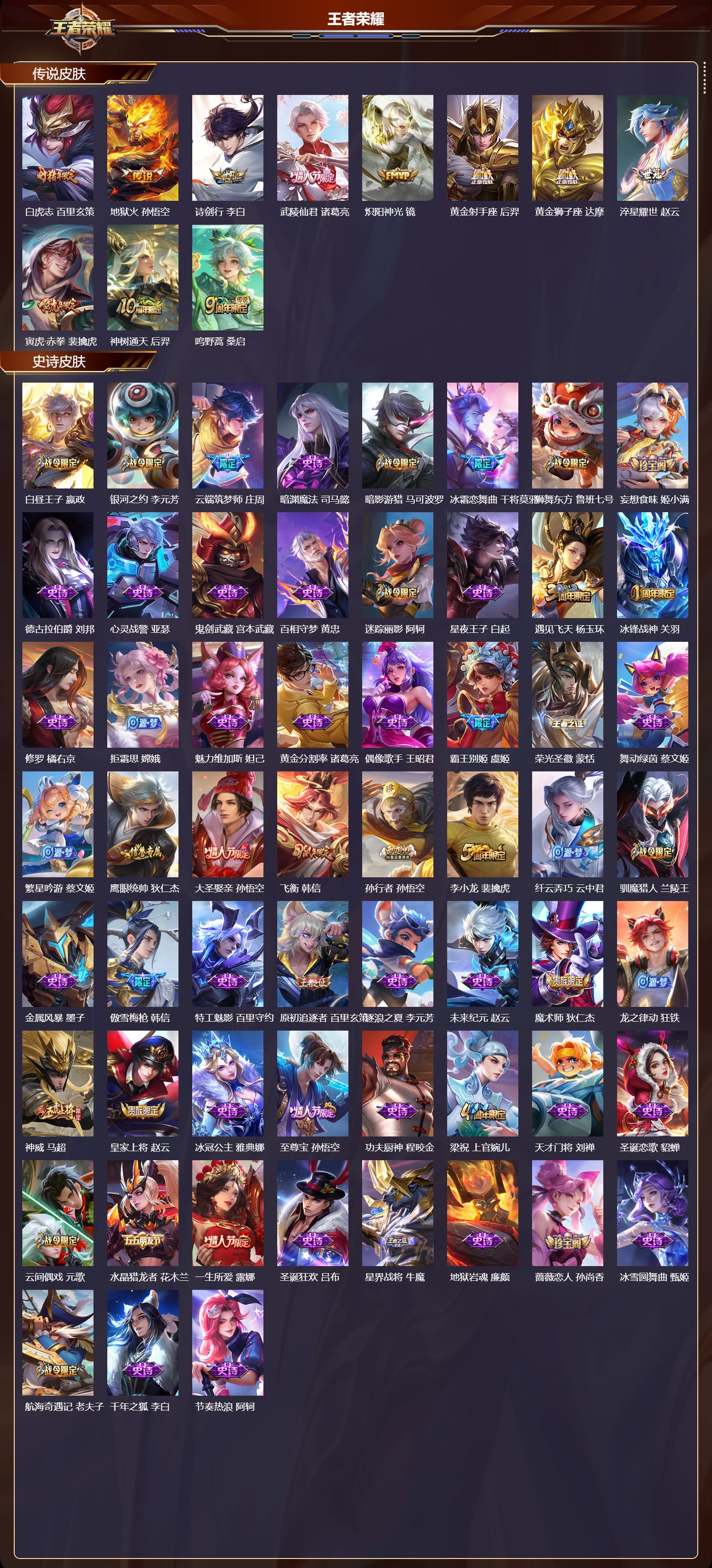 安卓qq/至尊星耀/261皮肤/126英雄/0典藏/0珍品无双/0无双/0珍品传说/11传说/72史诗/8稀有英雄【11 传说皮肤】白虎志 百里玄策地狱火 孙悟空诗剑行 李白武陵仙君 诸葛亮炽阳神光 镜黄金射手座 后羿黄金狮子座 达摩淬星耀世 赵云寅虎·赤拳 裴擒虎神树通天 后羿鸣野蒿 桑启【72 史诗皮肤】白昼王子 嬴政银河之约 李元芳云端筑梦师 庄周暗渊魔法 司马懿