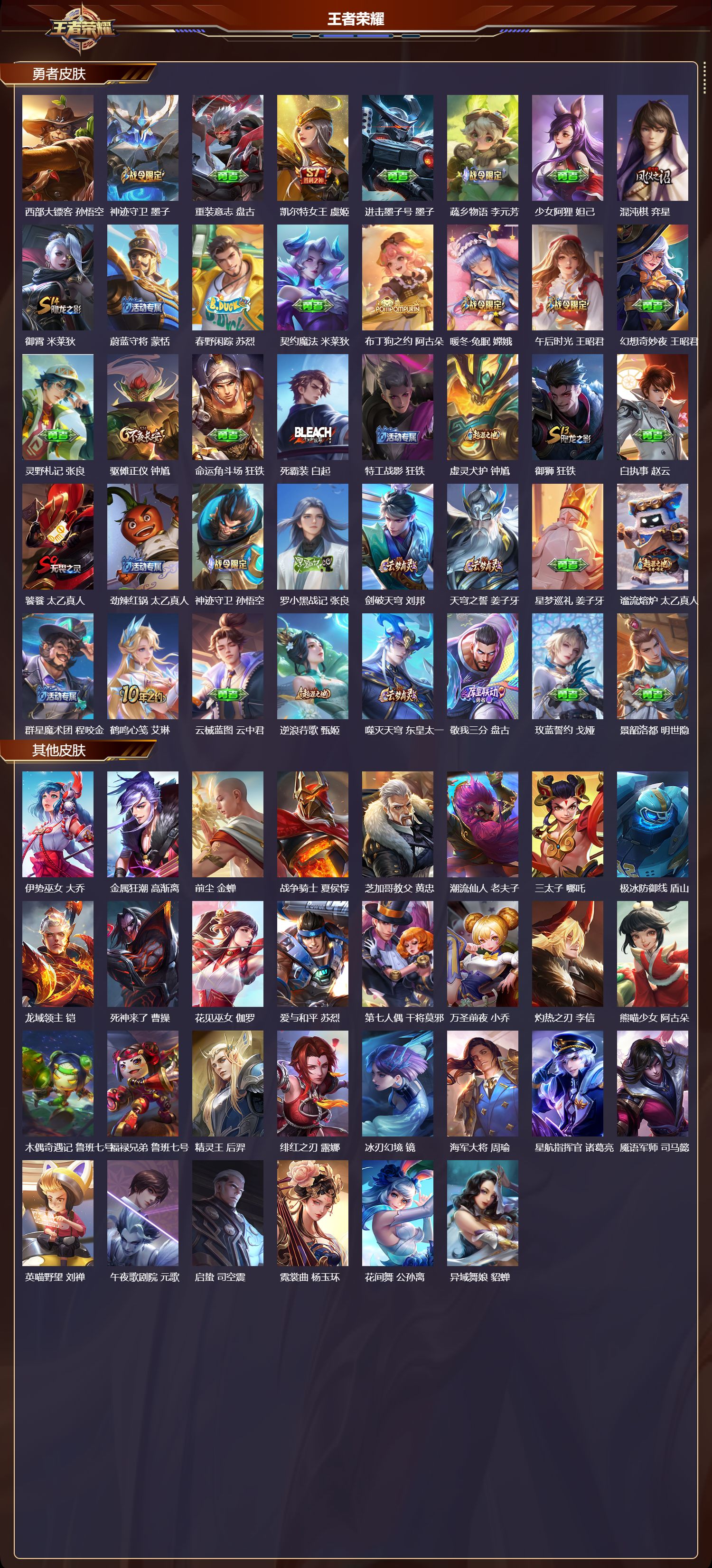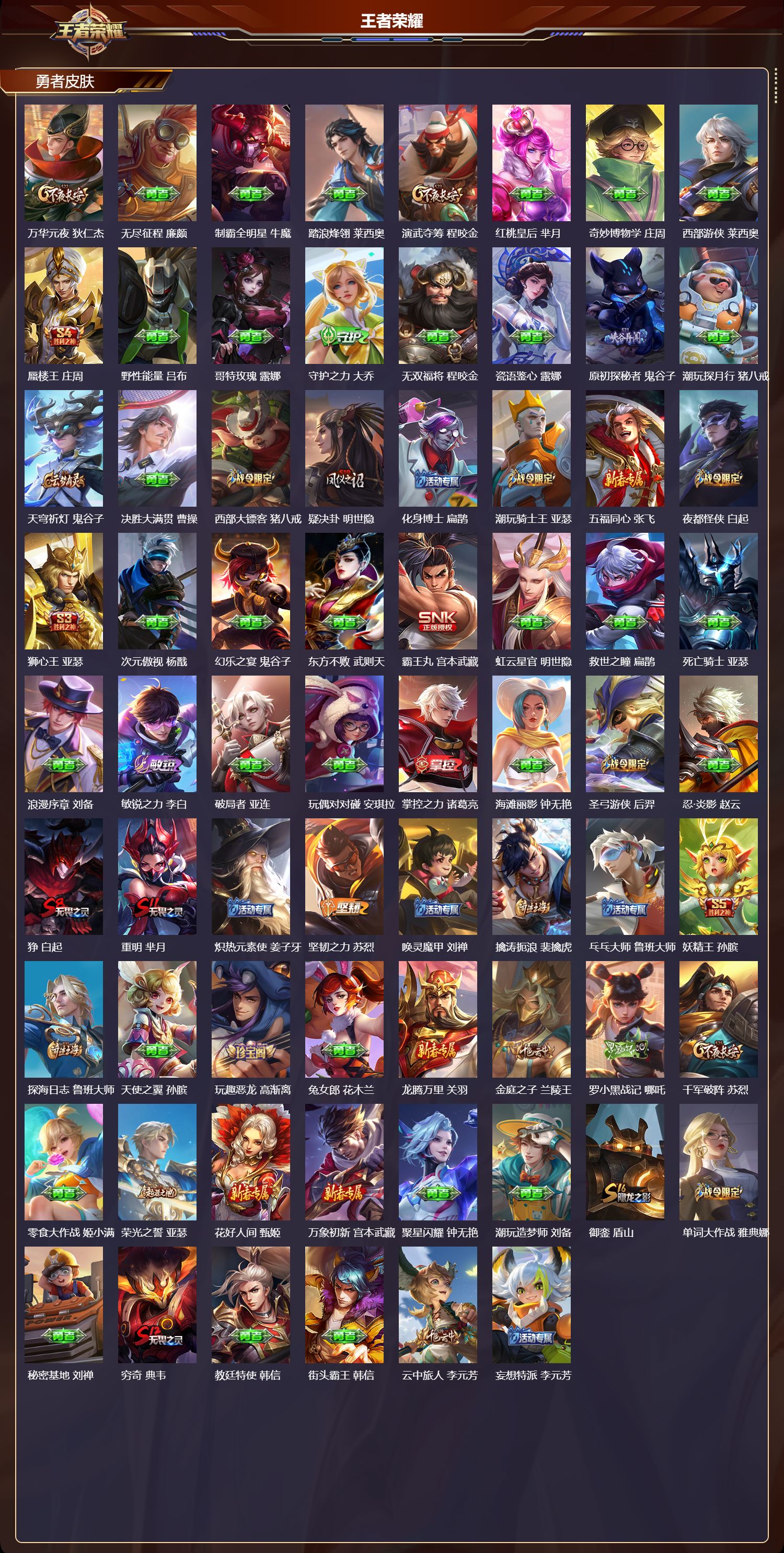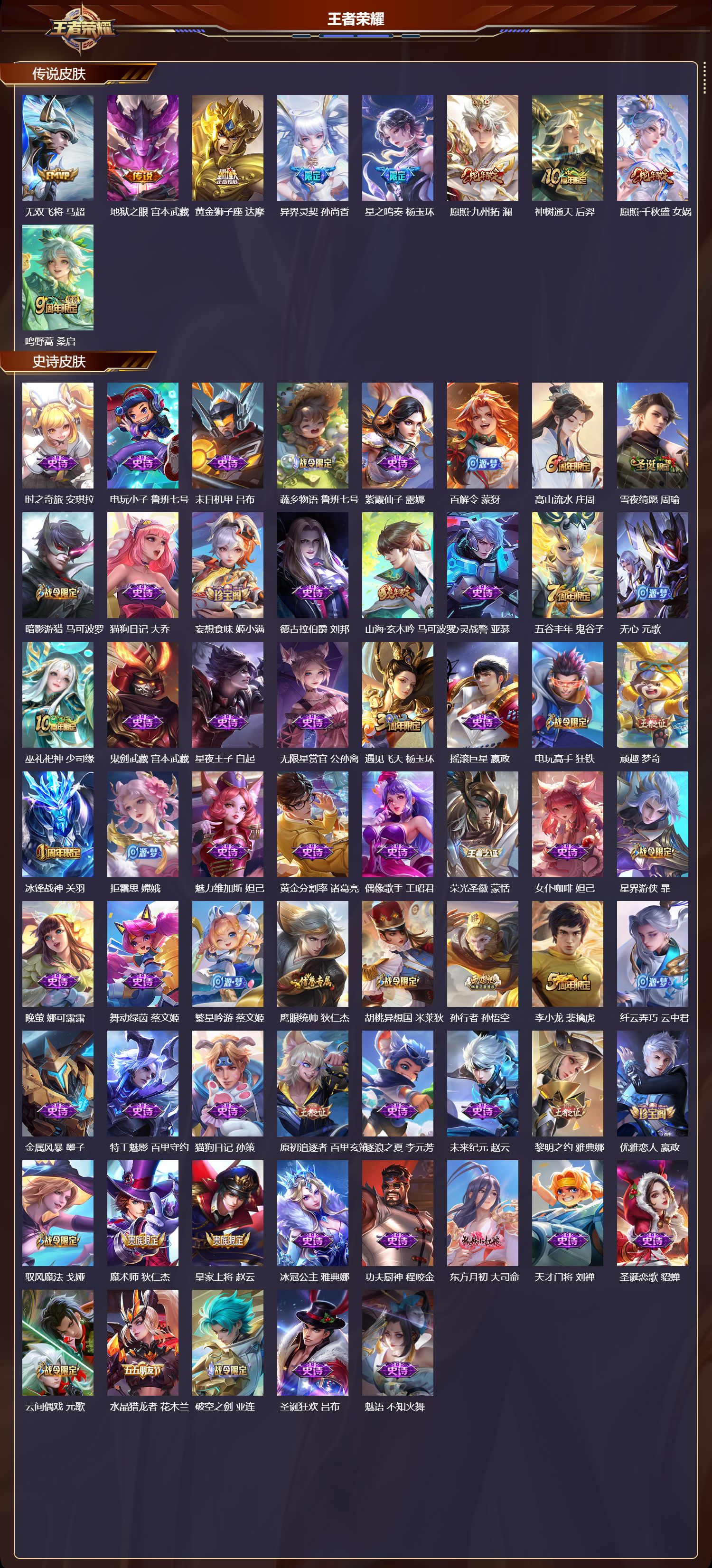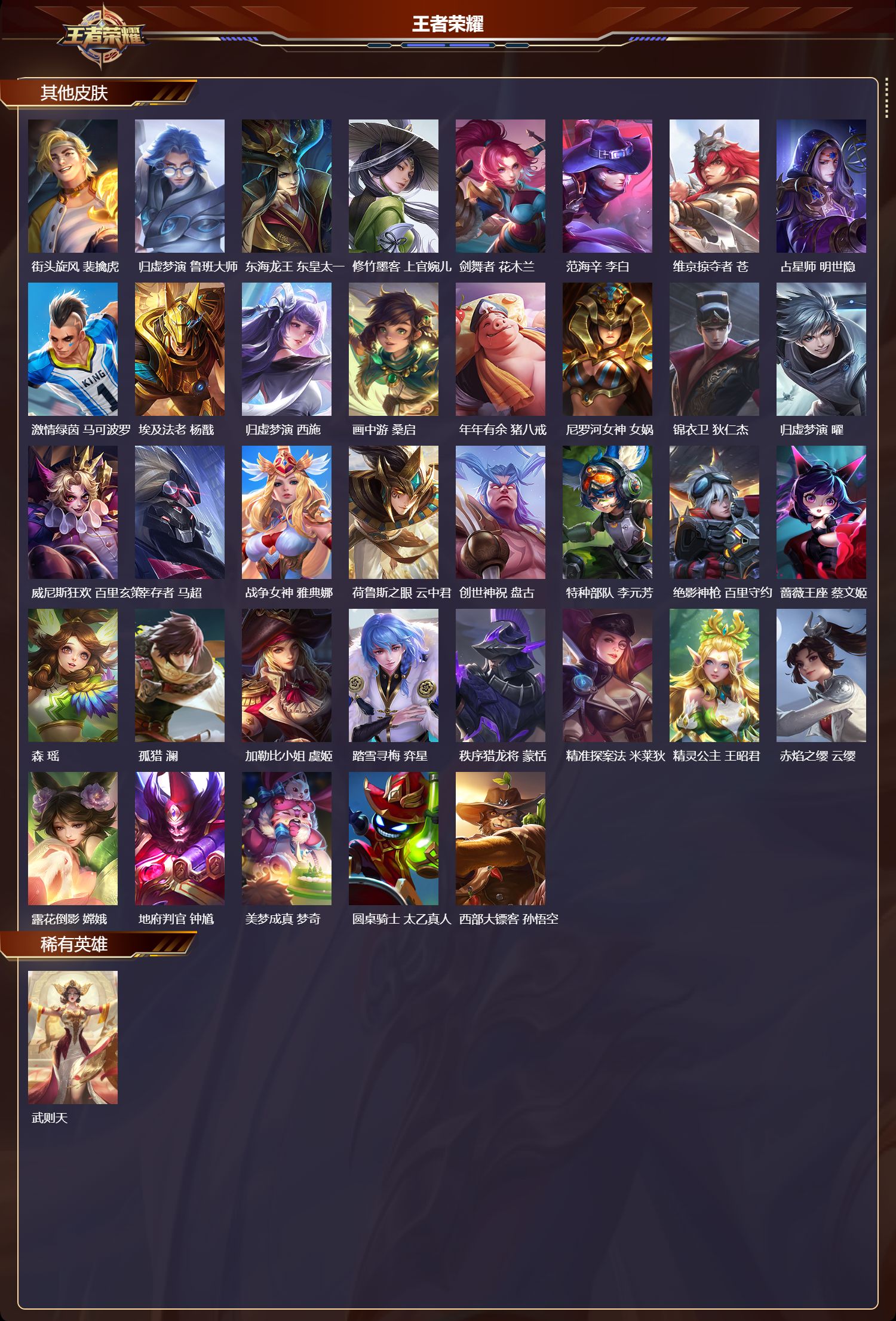 安卓qq/无双王者/317皮肤/128英雄/0典藏/0珍品无双/0无双/0珍品传说/9传说/88史诗/10稀有英雄【9 传说皮肤】无双飞将 马超地狱之眼 宫本武藏黄金狮子座 达摩异界灵契 孙尚香星之鸣奏 杨玉环愿照·九州拓 澜神树通天 后羿愿照·千秋盛 女娲鸣野蒿 桑启【88 史诗皮肤】时之奇旅 安琪拉电玩小子 鲁班七号末日机甲 吕布蔬乡物语 鲁班七号紫霞仙子 露娜百解