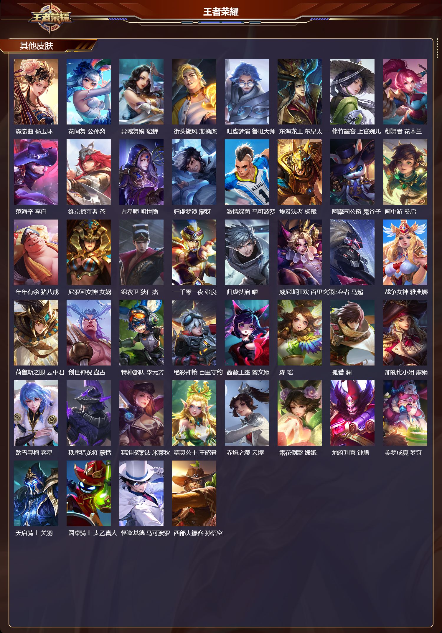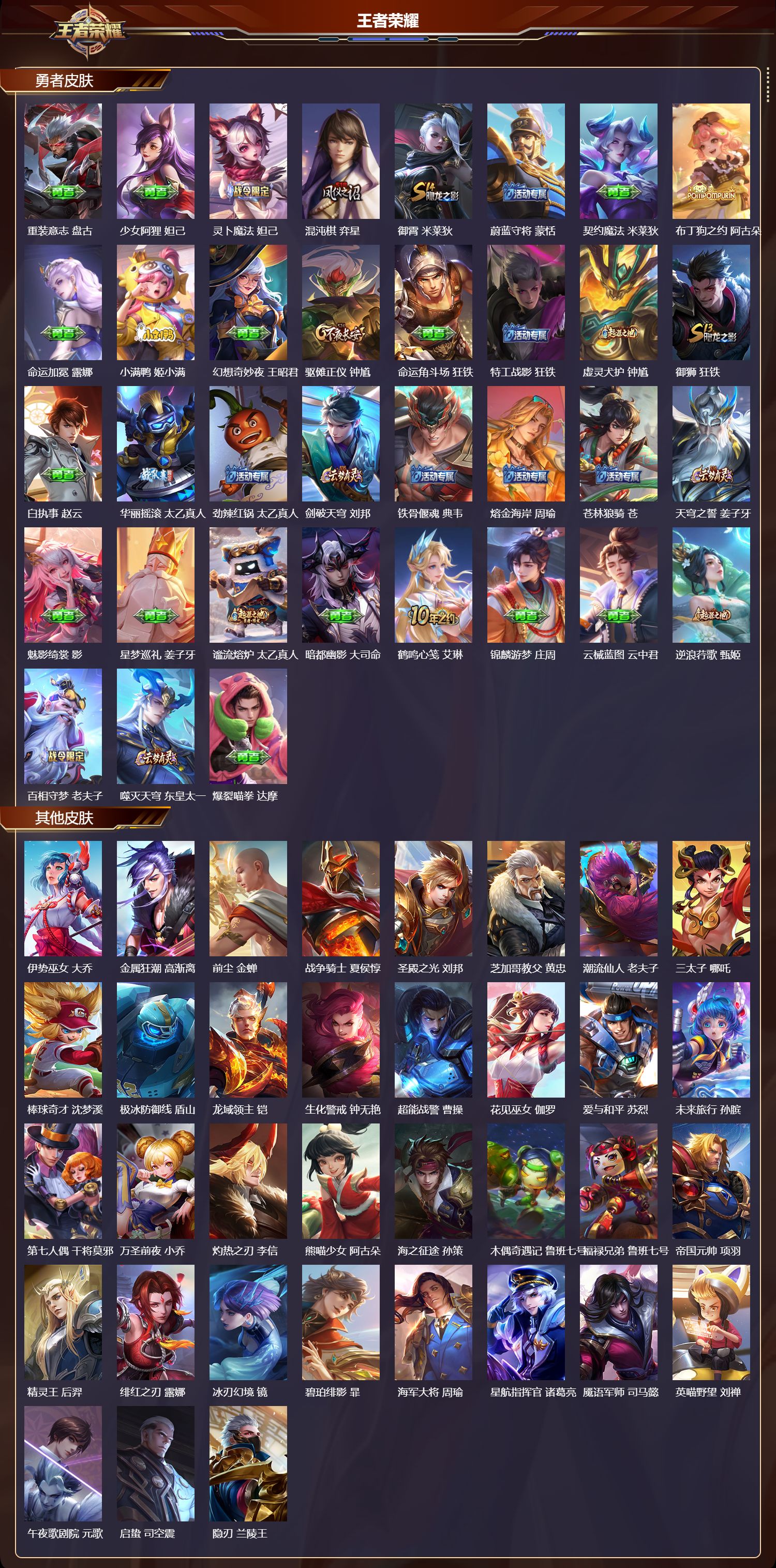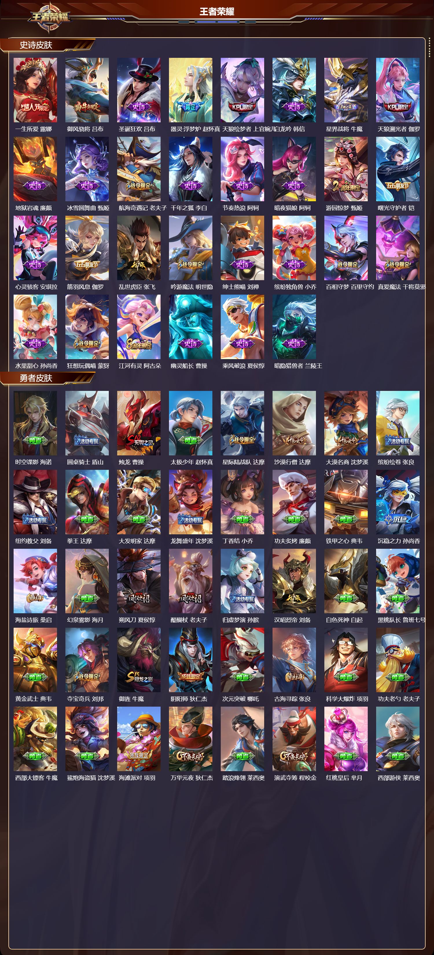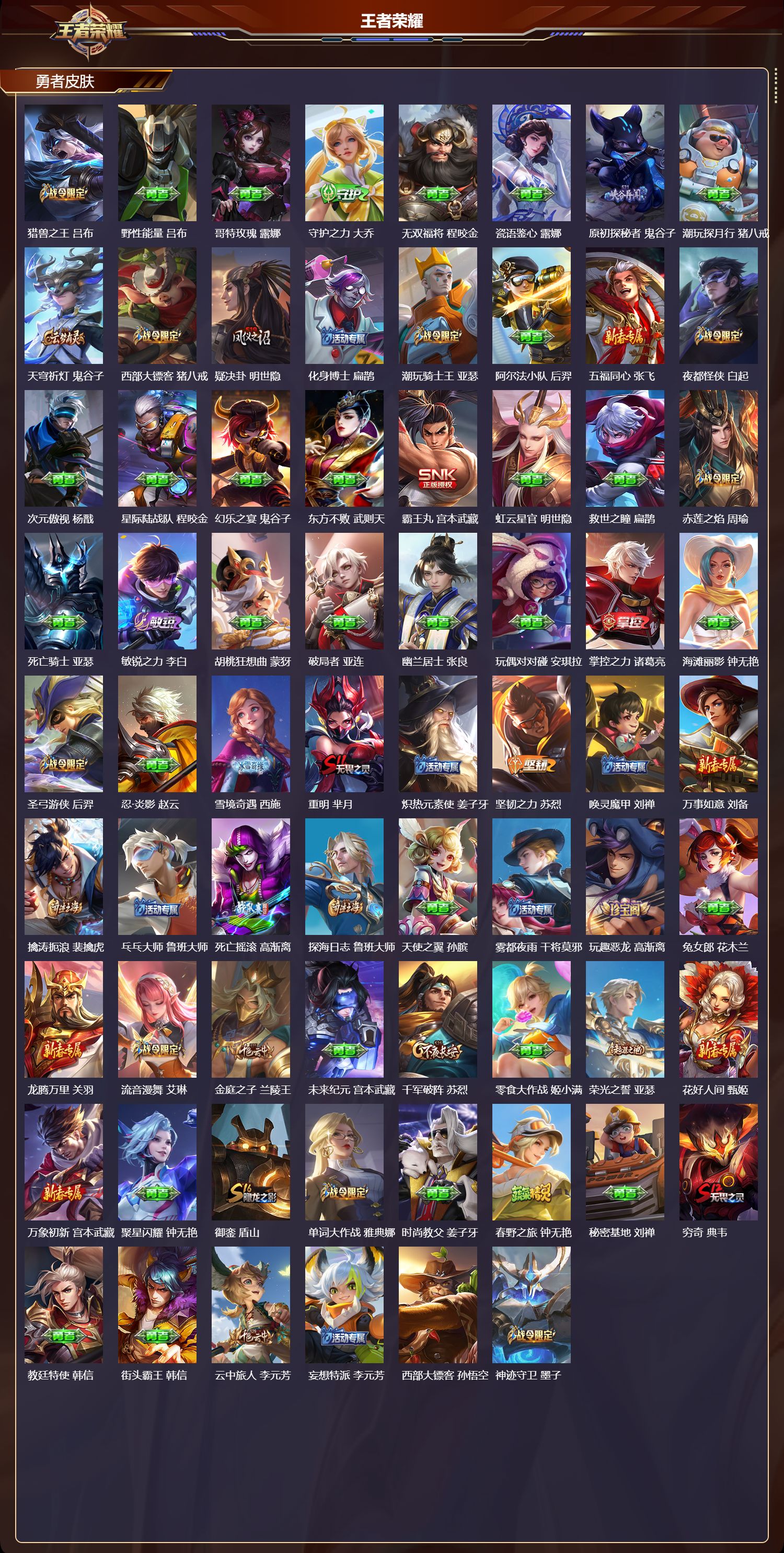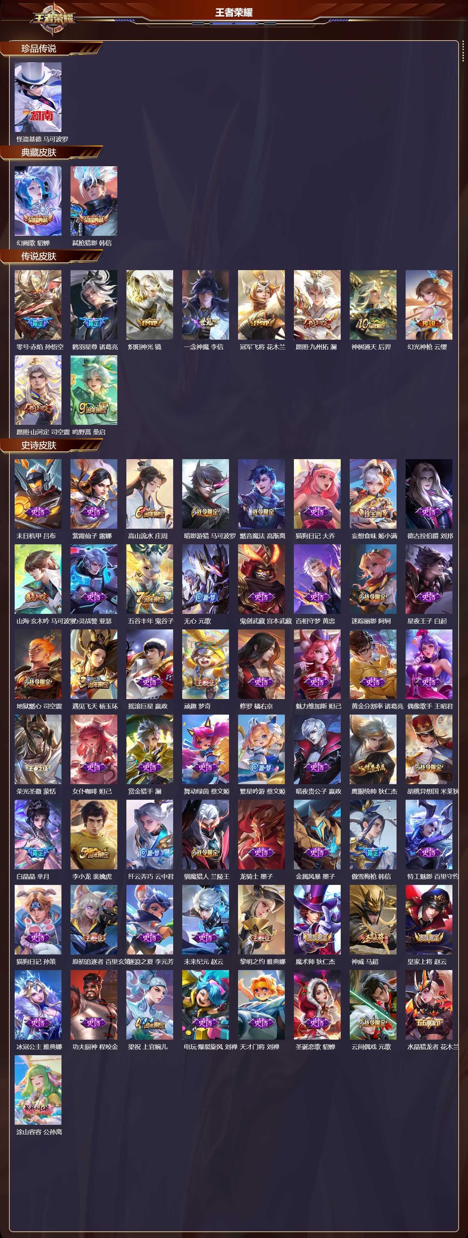 安卓qq/最强王者/323皮肤/125英雄/2典藏/0珍品无双/0无双/1珍品传说/10传说/87史诗/8稀有英雄【1 珍品传说】怪盗基德 马可波罗【2 典藏皮肤】幻阙歌 貂蝉弑呛猎影 韩信【10 传说皮肤】零号·赤焰 孙悟空鹤羽星尊 诸葛亮炽阳神光 镜一念神魔 李信冠军飞将 花木兰愿照·九州拓 澜神树通天 后羿幻光神呛 云缨愿照·山河定 司空震鸣野蒿