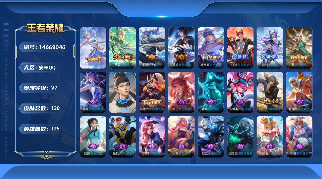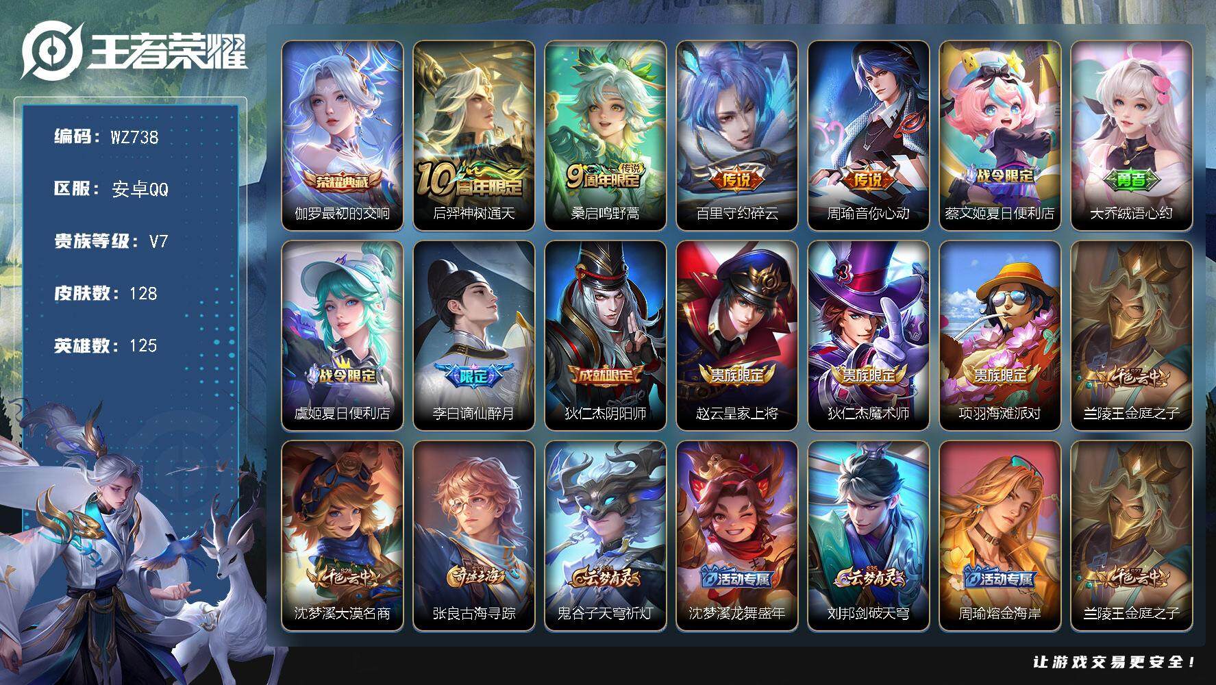 [14669046]安卓q-v7-尊贵铂金ii段位-125英雄-128皮肤-1典藏皮肤-4传说-27史诗 【英雄全皮】:孙权全皮 【荣耀典藏】:伽罗最初的交响 【传说皮肤】:后羿神树通天,桑启鸣野蒿,百里守约碎云,周瑜音你心动 【限定皮肤】:蔡文姬夏日便利店,大乔绒语心约,虞姬夏日便利店,李白谪仙醉月,狄仁杰阴阳师,赵云皇家上将,狄仁杰魔术师,项羽海滩派对,兰陵王金庭之子,沈梦溪大漠名商,张良古海寻踪,鬼谷子天穹祈灯,沈梦溪龙舞盛年,刘邦剑破天穹,周瑜熔金海岸 【赛季限定】:兰陵王金庭之子,张良古海寻踪,沈梦溪大漠名商,鬼谷子天穹祈灯,刘邦剑破天穹 【战令限定】:蔡文姬夏日便利店,虞姬夏日便利店 【史诗皮肤】:赵云皇家上将,赵云未来纪元,甄姬冰雪圆舞曲,狄仁杰魔术师,宫本武藏鬼剑武藏,孙尚香水果甜心,嬴政摇滚巨星,妲己女仆咖啡,曹操幽灵船长,花木兰水晶猎龙者,刘邦德古拉伯爵,夏侯惇乘风破浪,兰陵王暗隐猎兽者,安琪拉心灵骇客,阿轲节奏热浪,孙策猫狗日记,大乔猫狗日记,狄仁杰鹰眼统帅,瑶遇见神鹿,西施诗语江南,杨戬天秀启明,蔡文姬夏日便利店,李白谪仙醉月,阿轲化蝶舞,狂铁龙之律动,莱西奥光弋星穹,少司缘巫礼祀神 【其他皮肤】:项羽海滩派对,韩信教廷特使,露娜哥特玫瑰,阿轲爱心护理,赵云白执事,白起白色死神,牛魔西部大镖客,扁鹊救世之瞳,孙膑天使之翼,妲己少女阿狸,典韦黄金武士,花木兰兔女郎,甄姬花好人间,刘备万事如意,狄仁杰阴阳师,刘备汉昭烈帝,李元芳黑猫爱糖果,钟无艳海滩丽影,王昭君幻想奇妙夜,狂铁命运角斗场,诸葛亮掌控之力,李白敏锐之力,大乔守护之力,孙膑归虚梦演,刘禅秘密基地,盘古重装意志,鲁班大师乓乓大师,程咬金无双福将,兰陵王金庭之子,刘禅唤灵魔甲,沈梦溪大漠名商,蒙恬蔚蓝守将,海月幻泉雾影,猪八戒潮玩探月行,张良古海寻踪,亚连破局者,后羿完美运算,鬼谷子天穹祈灯,朵莉亚金色潮汐,沈梦溪龙舞盛年,刘邦剑破天穹,周瑜熔金海岸,虞姬夏日便利店,大乔绒语心约,东皇太一噬灭天穹,太乙真人谧流熔炉,明世隐景韶洛都,戈娅玫蓝誓约,刘备浪漫序章,钟馗虚灵犬护,白起死霸装,甄姬逆浪荇歌,哪吒罗小黑战记,亚瑟荣光之誓,明世隐往忆晖光,孙权径山谋武,艾琳鹤鸣心笺,曹操逐霄之志,鲁班七号福禄兄弟,高渐离金属狂潮,项羽帝国元帅,貂蝉异域舞娘,老夫子潮流仙人,张良一千零一夜,孙膑未来旅行,孙悟空西部大镖