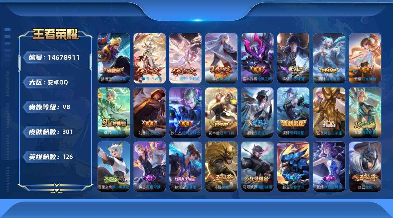 [14678911]v8 1典藏 14传说 126英雄 301皮肤 可修改实名 【英雄全皮】:蒙恬全皮鬼谷子全皮 【稀有英雄】:大司命嬴政始皇帝韩信韩跳跳夏洛特夏师傅艾琳橘右京橘子娜可露露鸟人不知火舞赵云金蝉唐僧戈娅 【荣耀水晶】:全息碎影猴子典藏 【传说皮】:幻光神呛游龙清影小青龙黄金白羊座地狱之眼云霓雀翎一念神魔冠军飞将时之恋人-刘备电焊工超时空战士-狄仁杰 【珍宝阁皮】:蔷薇恋人女武神 【赛季/战令皮】:噬灭天穹s37古海寻踪s33海盐诗旅s30擒涛扼浪s31潮玩骑兵奇幻香踪探海日志s32驭风魔法玲珑珍味顽趣-梦奇剑破天穹s35天穹祈灯s34天穹之誓s36炼金王s6凯尔特女王s7狰s8饕餮s9烛龙s10重明s11穷奇s12御狮s13御霄s14御旌s15御銮s16朔风刀s17混沌棋s18疑决卦s19醍醐杖s20原初探秘者s21万华元夜s22演武夺筹s23驱傩正仪s24千军破阵s25神迹守卫-钟馗狮舞东方赤莲之焰驯魔猎人星空之诺银河之约夺宝奇兵迷踪丽影西部大镖客-猪八戒暗影游猎游乐娃子金庭之子s27大漠名商s28云中旅人s29 【史诗皮】:百相守梦-黄忠星界战将谪仙醉月万灵启世罗小黑战记-百里玄策紫霞仙子白龙吟黄金分割率特工魅影千年之狐江河有灵百解令蒙犽蒙恬荣光圣徽龙骑士小龙虾冰冠公主偶像歌手无限星赏官电玩·爆裂旋风猫狗日记-孙策猫狗日记-大乔时之恋人-孙尚香乱世虎臣节奏热浪女仆咖啡摇滚巨星水果甜心绅士熊喵星夜王子心灵骇客功夫厨神暗隐猎兽者幽灵船长鬼剑武藏暗渊魔法心灵战警舞动绿茵地狱岩魂繁星吟游呼啦呼啦拒霜思缤纷独角兽乘风破浪逐浪之夏水晶猎龙者曙光守护者箭羽风息金属风暴原初追逐者圣诞狂欢圣诞恋歌鹰眼统帅暗夜贵公子魅力维加斯黎明之约无心未来纪元-赵云 【限定皮】:愿照·九州拓澜年限愿照·岁时盈虞姬年限逐霄战戟鸣野蒿至尊宝凤求凰白切鸡神威电光马子遇见