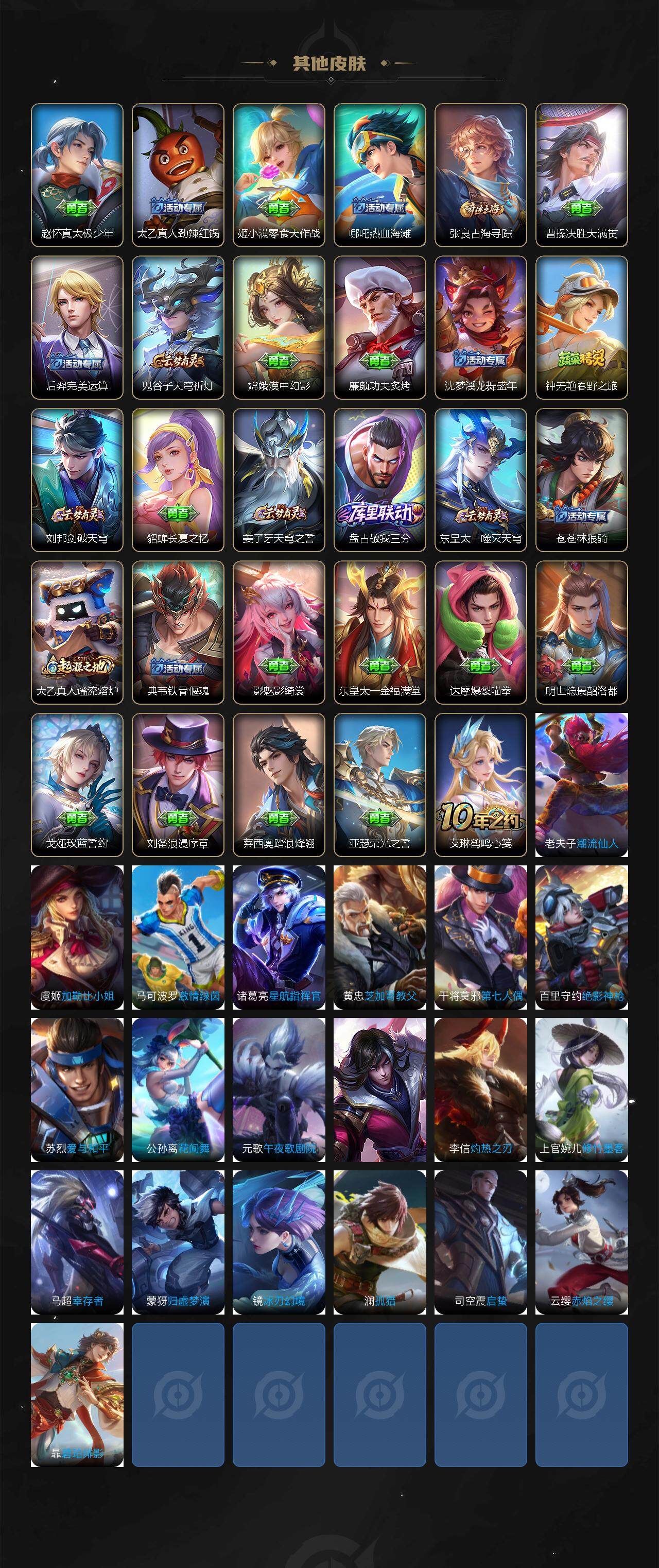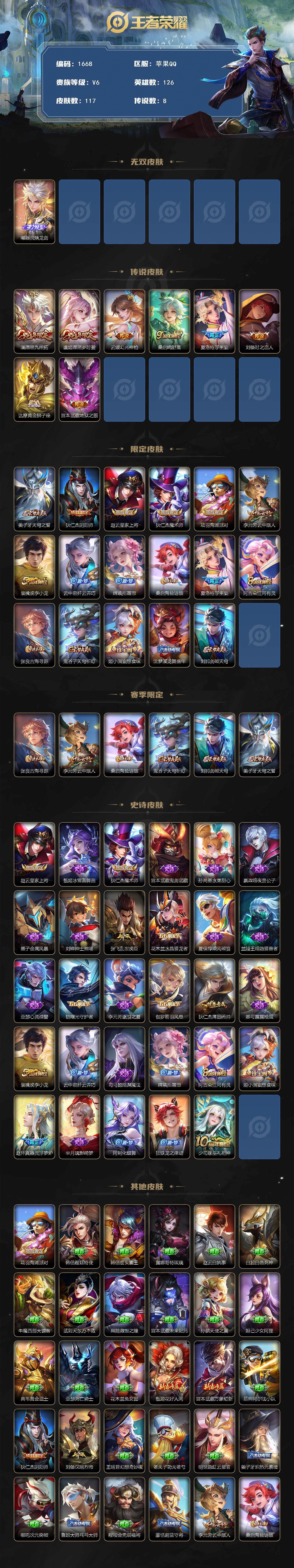126英雄-117皮肤-贵族6/皮肤117/传说8/史诗29/英雄126/影全皮/器灵·螭龙剑 曜/愿照·九州拓 澜/愿照·岁时盈 虞姬/幻光神呛 云缨/鸣野蒿 桑启/浮生妄 夏洛特/时之恋人 刘备/黄金狮子座 达摩/地狱之眼 宫本武藏/天穹之誓 姜子牙/阴阳师 狄仁杰/皇家上将 赵云/魔术师 狄仁杰/海滩派对 项羽/云中旅人 李元芳/李小龙 裴擒虎/纤云弄巧 云中君/拒霜思 嫦娥/海盐诗旅 桑启/江河有灵 阿古朵/