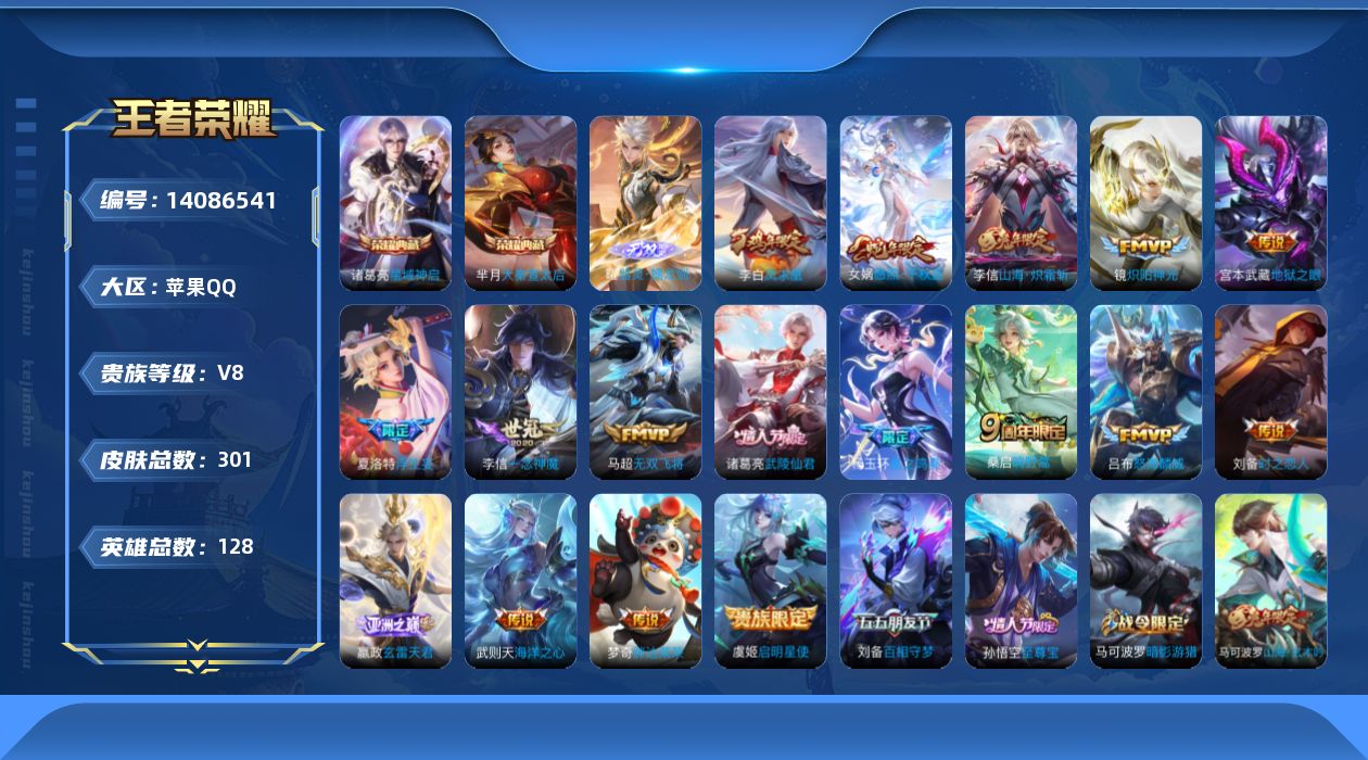 [14086541]9300战力刘备 贵族8 王者14星 贵族积分83225苹果手q114区301皮2典藏17传说1无双v8 营地id72550641非凡王者【无双皮肤】:器灵·螭龙剑【荣耀典藏】:大秦宣太后星域神启【优质限定皮肤】:山海·炽霜斩至尊宝凤求凰无双飞将【传说皮肤】:时之恋人星之鸣奏一念神魔愿照·千秋盛玄雷天君鸣野蒿炽阳神光浮生妄山海·炽霜斩地狱之眼怒海麟