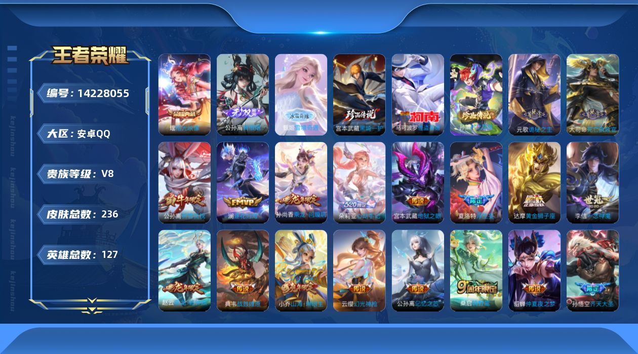 [14228055]贵族8-贵族积分92008-236皮1典藏27传说2无双3珍品传说-8个英雄全皮肤 安卓手q403区236皮1典藏27传说2无双3珍品传说v8 营地id1716303951非凡王者【珍品传说皮肤】:黑崎一护时之奇旅怪盗基德【无双皮肤】:离恨烟雪境奇遇【荣耀典藏】:拾光映像【优质限定皮肤】:至尊宝山海·琳琅生祈雪灵祝【传说皮肤】:神树通天诡秘之主死亡执政官地狱之