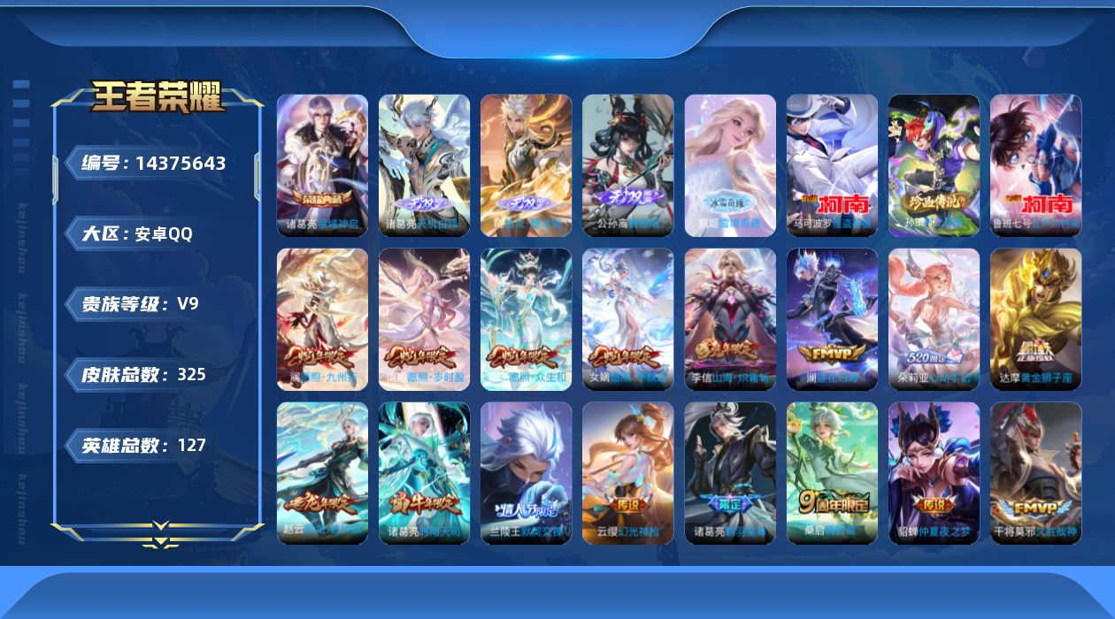 [14375643]贵族9-贵族积分131340-雪境奇遇天幕-雪境奇遇小兵-325皮-1典藏-24传说-4无双-3珍品传说-0珍品无双-5全皮-9改名卡-1灵宝改名卡改名卡 安卓手q400区 营地id1852693588荣耀王者【珍品传说皮肤】:时之奇旅怪盗基德江户川柯南【无双皮肤】:天机白泽器灵·螭龙剑雪境奇遇离恨烟【荣耀典藏】:星域神启【优质限定皮肤】:山海·炽霜斩【传说皮肤】: