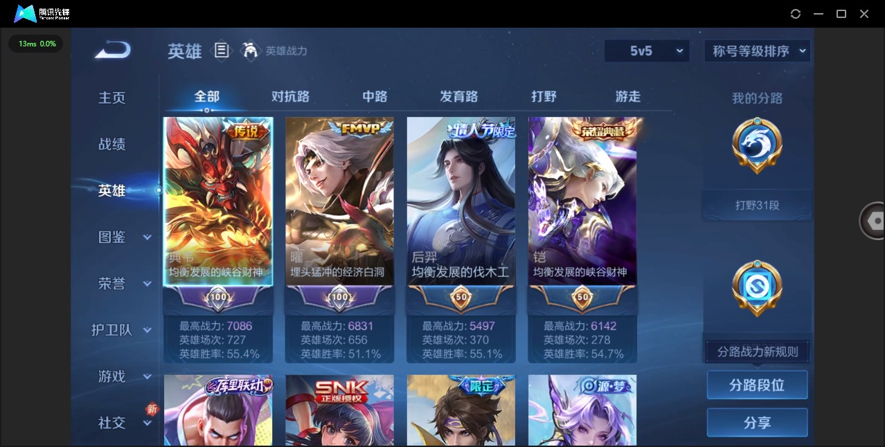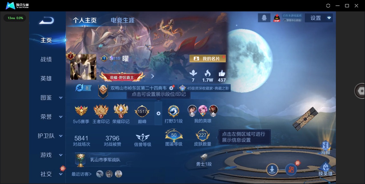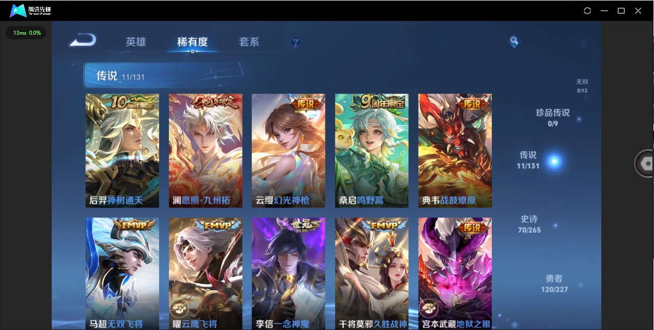 v7 1典藏 11传说 127英雄 227皮肤 可修改实名 【英雄全皮】:敖隐全皮孙权全皮蚩奼全皮影全皮 【稀有英雄】:敖隐小龙人大司命嬴政始皇帝韩信韩跳跳夏洛特夏师傅艾琳橘右京橘子娜可露露鸟人不知火舞赵云金蝉唐僧戈娅 【荣耀水晶】:银白咏叹