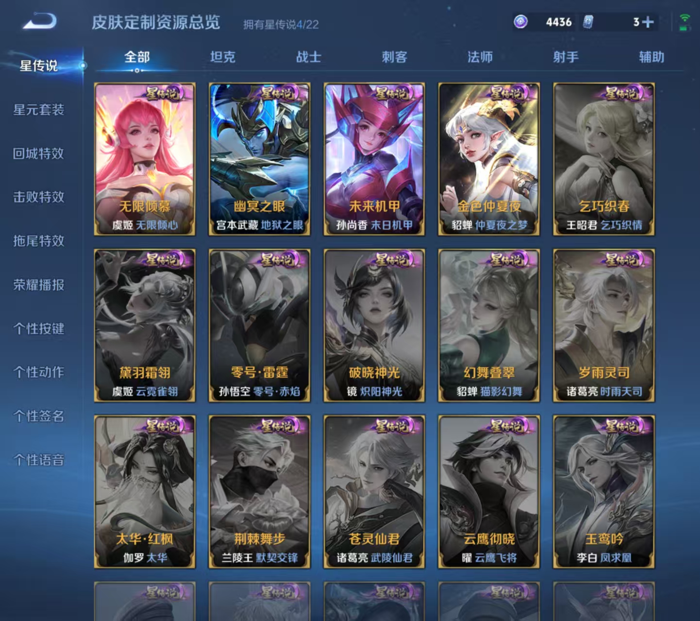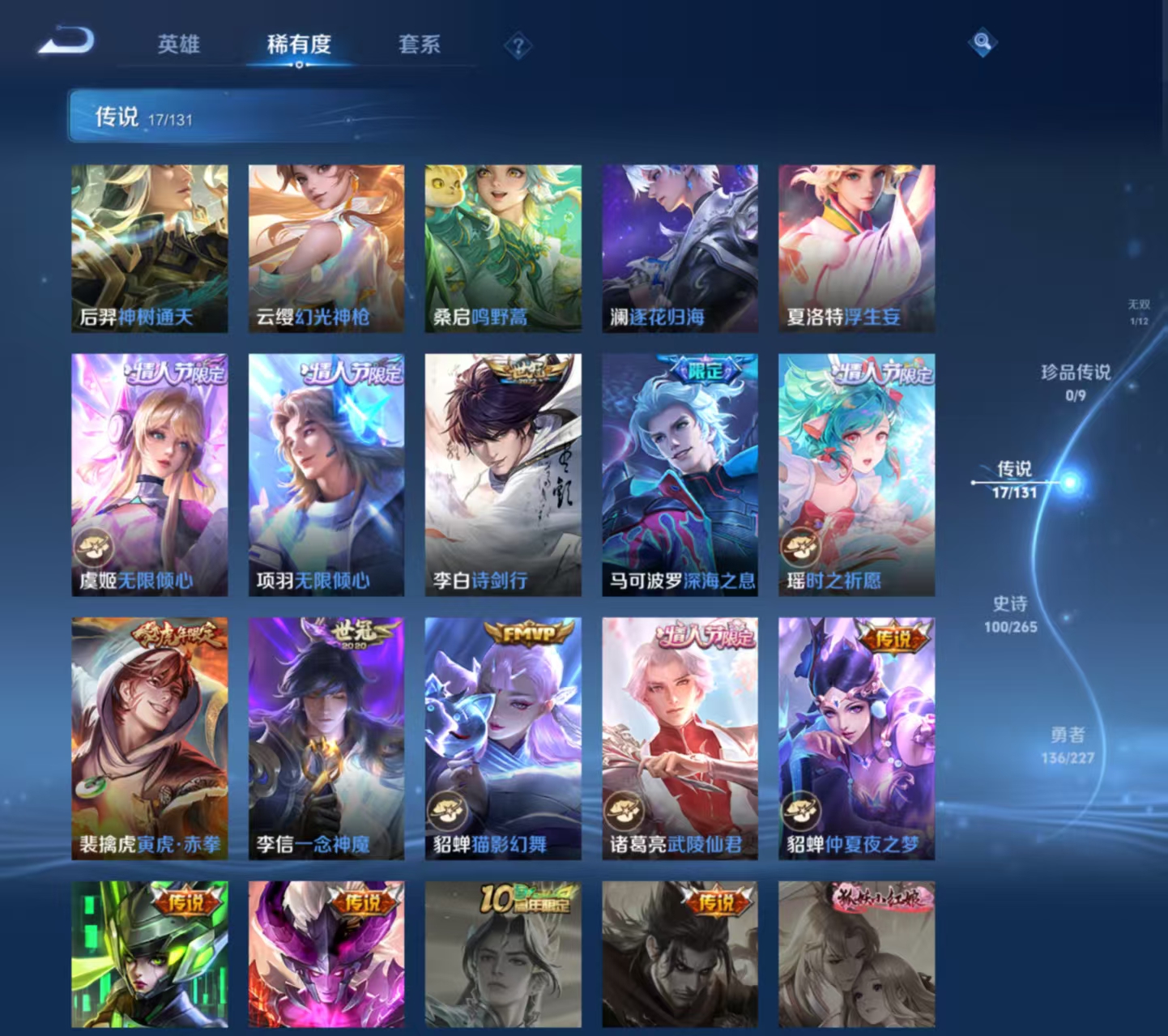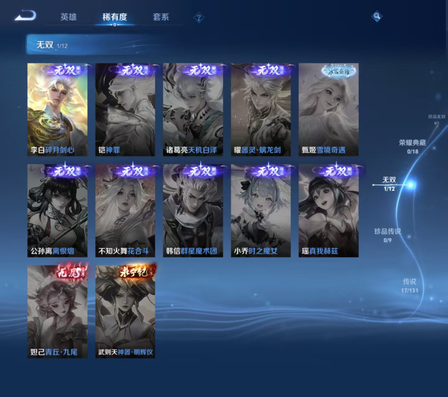 战力号 18金标 25个荣耀印记 全能大神 33个王者印记 万战李白 万战貂蝉 万战马可波罗 302皮1无双17传说 碎月剑心 地狱之眼,神树通天,仲夏夜之梦,猫影幻舞,诗剑行,末日机甲,武陵仙君,无限倾心,深海之息,寅虎·赤拳,一念神魔,时之祈愿,浮生妄,逐花归海,无限倾心,幻光神呛,鸣野蒿