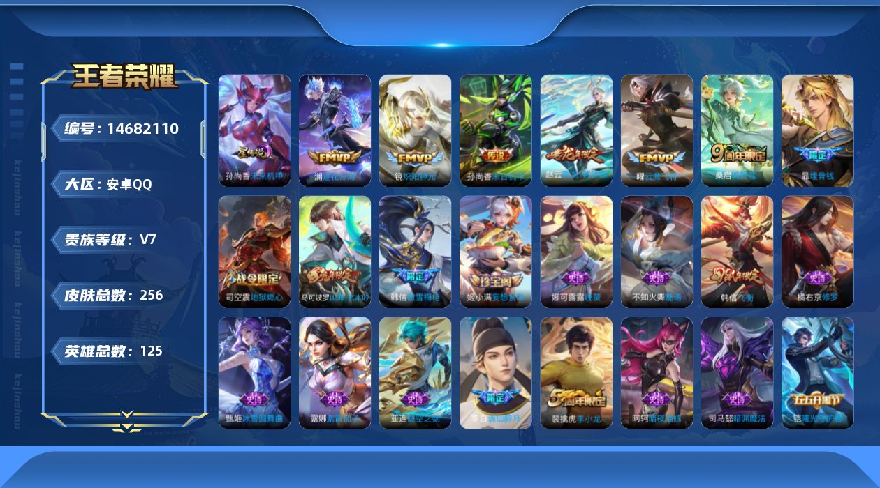 [14682110]v7-124英雄-256皮肤-6传说-67史诗,,tt1177 【内测皮肤】:高渐离玩趣恶龙,狂铁特工战影 【传说皮肤】:孙尚香末日机甲,曜云鹰飞将,镜炽阳神光,澜逐花归海,赵云乘龙铭钟鼎,桑启鸣野蒿 【限定皮肤】:暃埋骨钱,姜子牙天穹之誓,杨戬破阵退雄兵,李白谪仙醉月,狄仁杰阴阳师,赵云皇家上将,庄周高山流水,高渐离死亡摇滚,高渐离玩趣恶龙,扁鹊奇幻香踪,吕布猎兽之王,马可波罗山海玄木吟,狄仁杰魔术师,达摩沙漠行僧,项羽海滩派对,韩信飞衡,韩信傲雪梅呛,兰陵王金庭之子,李元芳匿光侦查者,李元芳云中旅人,钟馗驱傩正仪,杨戬潮玩骑兵,女娲朔望之晖,雅典娜黎明之约,太乙真人华丽摇滚,鬼谷子五谷丰年,苏烈千军破阵,沈梦溪星空之诺,沈梦溪大漠名商,裴擒虎李小龙,裴擒虎擒涛扼浪,云中君纤云弄巧,嫦娥拒霜思,嫦娥暖冬兔眠,西施玲珑珍味,鲁班大师探海日志,桑启海盐诗旅,暃星界游侠,戈娅驭风魔法,艾琳流音漫舞,司空震地狱燃心,阿古朵江河有灵,张良古海寻踪,蒙恬荣光圣徽,高渐离燃音魔法,妲己灵卜魔法,鬼谷子天穹祈灯,姬小满妄想食味,赵云乘龙铭钟鼎,沈梦溪龙舞盛年,鲁班七号蔬乡物语,李元芳蔬乡物语,刘邦剑破天穹,程咬金群星魔术团,镜青焰无极,项羽苍威无极,周瑜熔金海岸 【年限皮肤】:韩信飞衡,马可波罗山海玄木吟,赵云乘龙铭钟鼎 【赛季限定】:达摩沙漠行僧,兰陵王金庭之子,张良古海寻踪,李元芳云中旅人,钟馗驱傩正仪,雅典娜黎明之约,苏烈千军破阵,沈梦溪大漠名商,裴擒虎擒涛扼浪,鲁班大师探海日志,桑启海盐诗旅,鬼谷子天穹祈灯,蒙恬荣光圣徽,刘邦剑破天穹,姜子牙天穹之誓 【战令限定】:扁鹊奇幻香踪,吕布猎兽之王,艾琳流音漫舞,杨戬潮玩骑兵,女娲朔望之晖,沈梦溪星空之诺,嫦娥暖冬兔眠,西施玲珑珍味,司空震地狱燃心,暃星界游侠,戈娅驭风魔法,高渐离燃音魔法,妲己灵卜魔法,鲁班七号蔬乡物语,李元芳蔬乡物语,镜青焰无极,项羽苍威无极 【史诗皮肤】:露娜紫霞仙子,阿轲暗夜猫娘,赵云皇家上将,赵云未来纪元,貂蝉圣诞恋歌,甄姬冰雪圆舞曲,王昭君偶像歌手,狄仁杰魔术师,廉颇地狱岩魂,宫本武藏鬼剑武藏,孙尚香水果甜心,嬴政摇滚巨星,妲己魅力维加斯,妲己女仆咖啡,墨子金属风暴,吕布圣诞狂欢,曹操幽灵船长,韩信白龙吟,花木兰水晶猎龙者,夏侯惇乘风破浪,小乔缤纷独角兽,兰陵王暗隐猎兽者,诸葛亮黄金分割率,亚瑟心灵