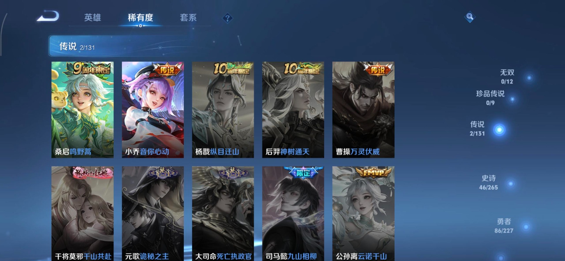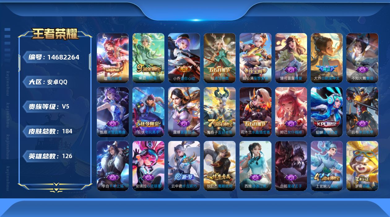 v1 1典藏 2传说 126英雄 184皮肤 可修改实名 【英雄全皮】敖隐全皮 【稀有英雄】大司命敖隐小龙人夏洛特夏师傅金蝉唐僧戈娅赵云韩信韩跳跳艾琳不知火舞娜可露露鸟人橘右京橘子 【荣耀水晶】拾光映像瑶典藏 【传说皮】音你心动-小乔 【珍宝