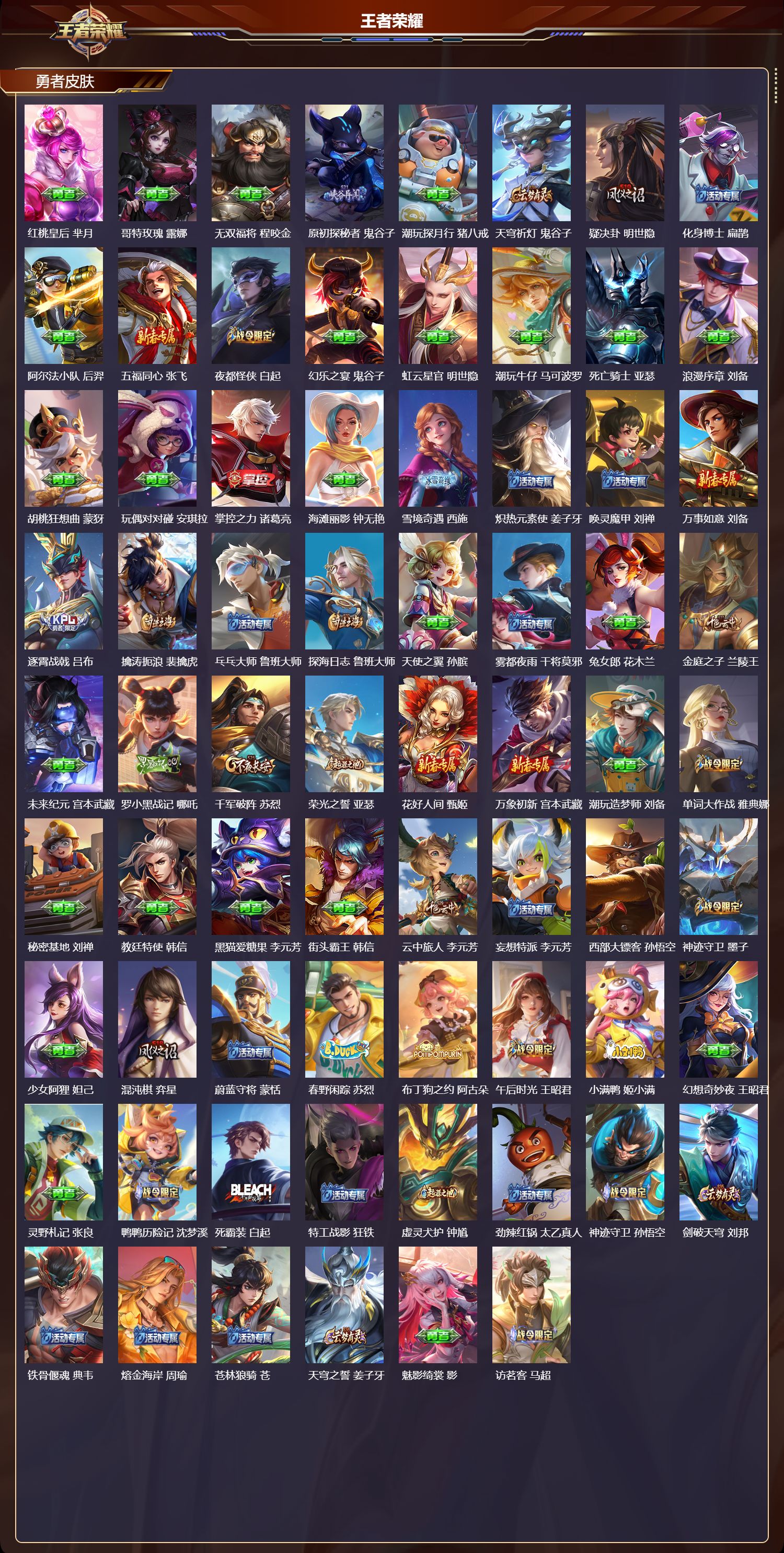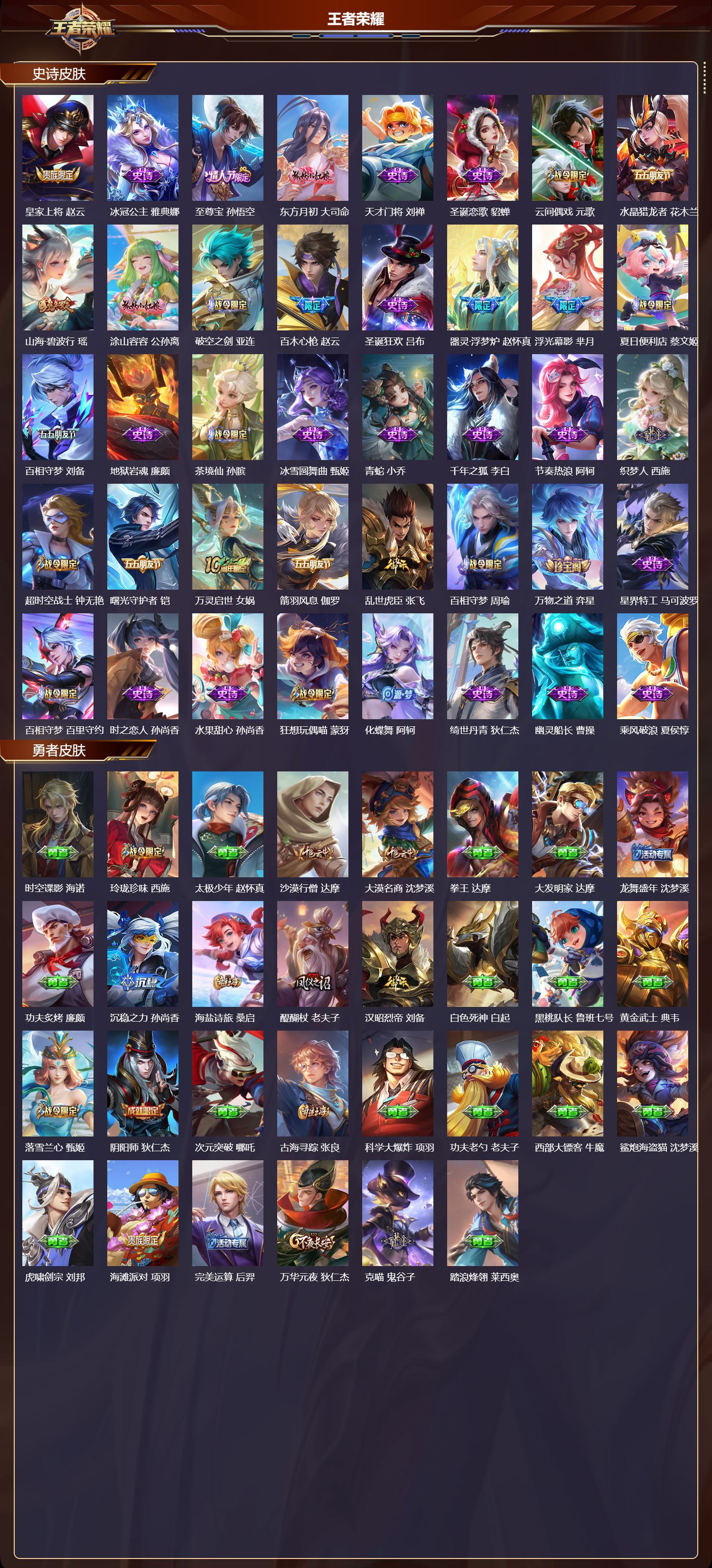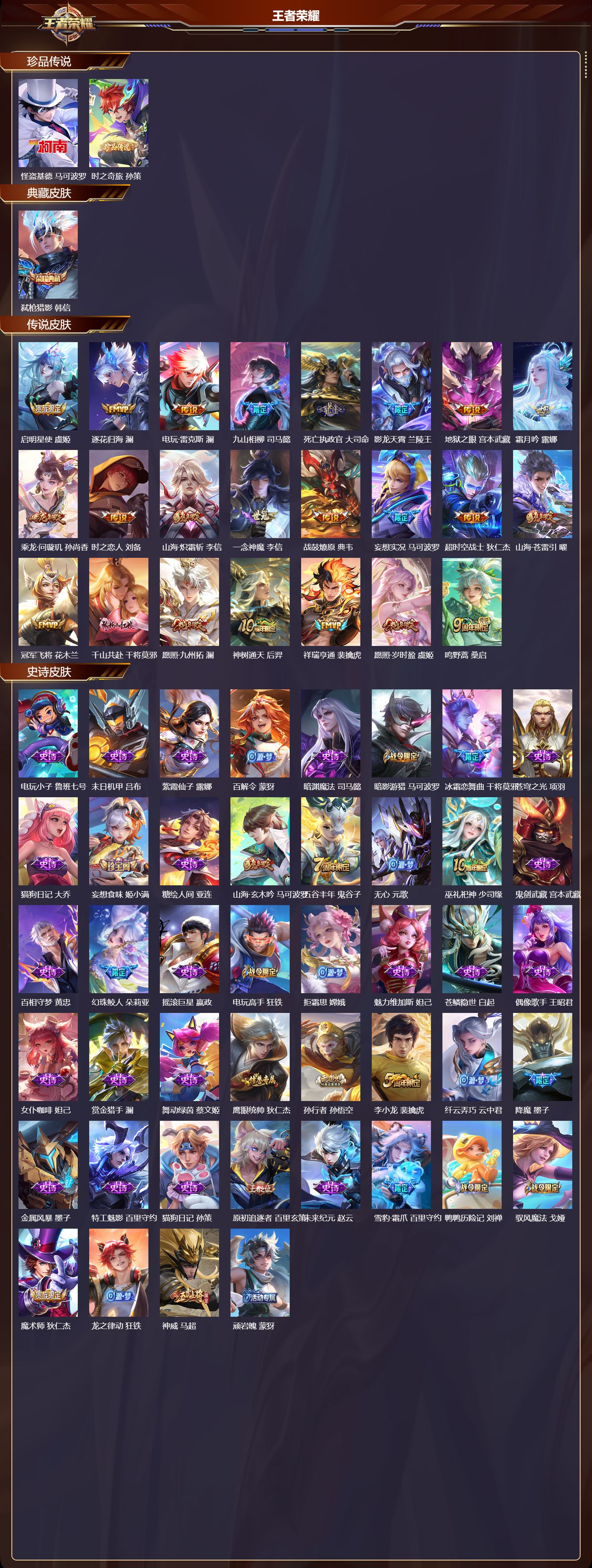 安卓qq/最强王者/269皮肤/124英雄/1典藏/0珍品无双/0无双/2珍品传说/23传说/84史诗/8稀有英雄【2 珍品传说】怪盗基德 马可波罗时之奇旅 孙策【1 典藏皮肤】弑呛猎影 韩信【23 传说皮肤】启明星使 虞姬逐花归海 澜电玩·雷克斯 澜九山相柳 司马懿死亡执政官 大司命影龙天霄 兰陵王地狱之眼 宫本武藏霜月吟 露娜乘龙·问璇玑 孙尚香时之