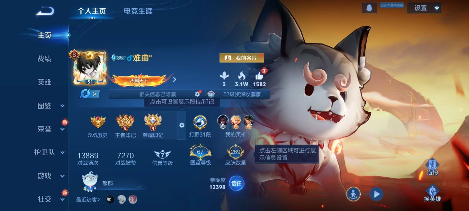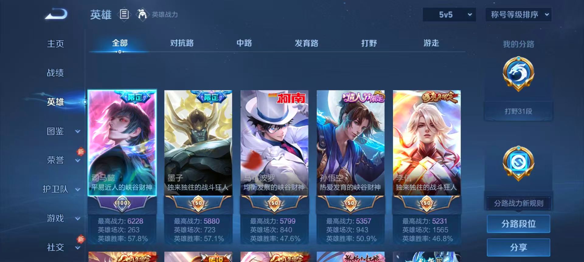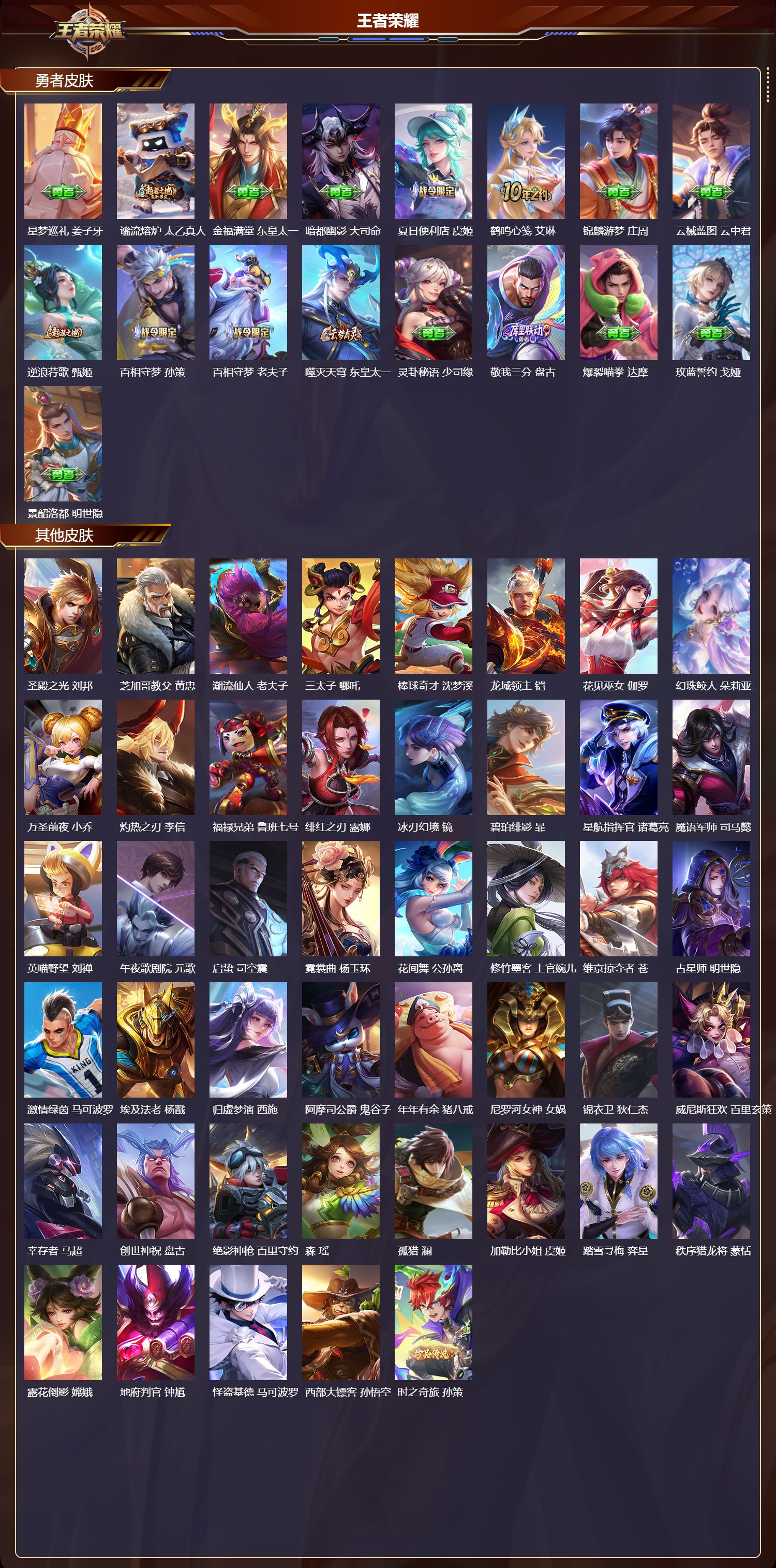 安卓qq/最强王者/269皮肤/124英雄/1典藏/0珍品无双/0无双/2珍品传说/23传说/84史诗/8稀有英雄【2 珍品传说】怪盗基德 马可波罗时之奇旅 孙策【1 典藏皮肤】弑呛猎影 韩信【23 传说皮肤】启明星使 虞姬逐花归海 澜电玩·雷克斯 澜九山相柳 司马懿死亡执政官 大司命影龙天霄 兰陵王地狱之眼 宫本武藏霜月吟 露娜乘龙·问璇玑 孙尚香时之
