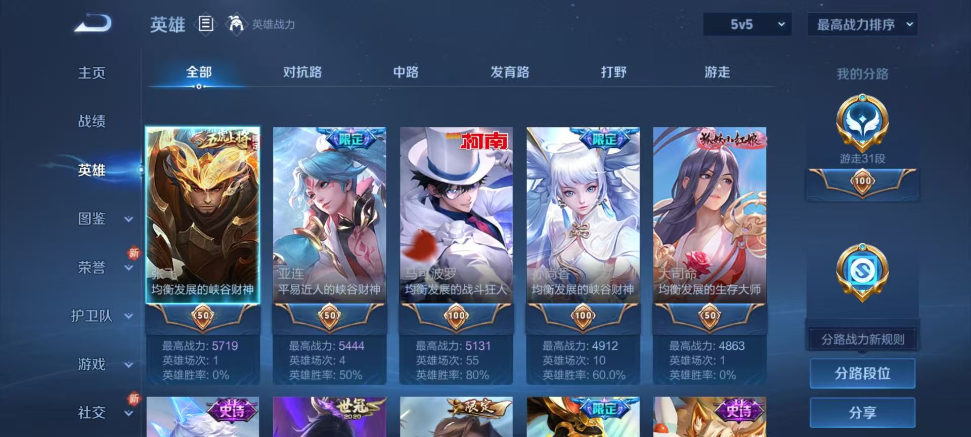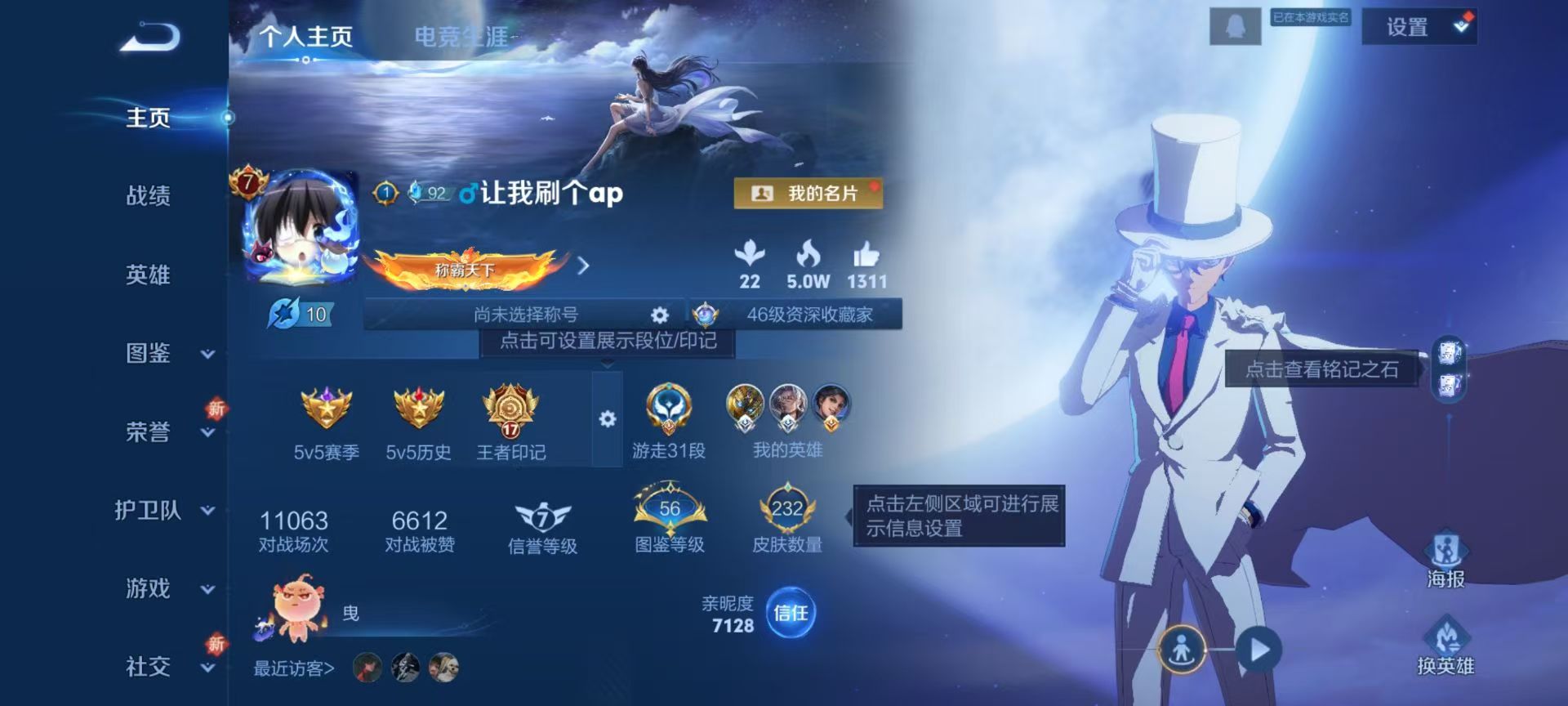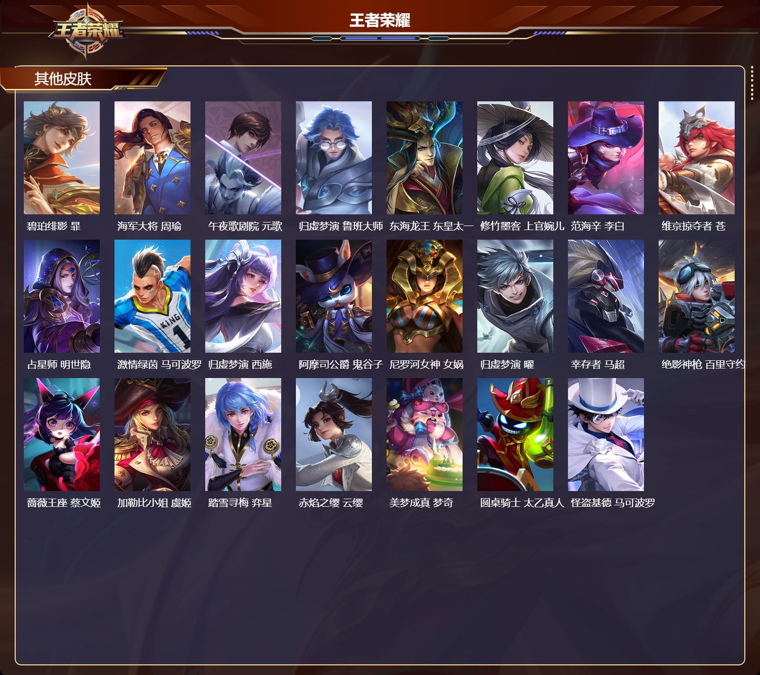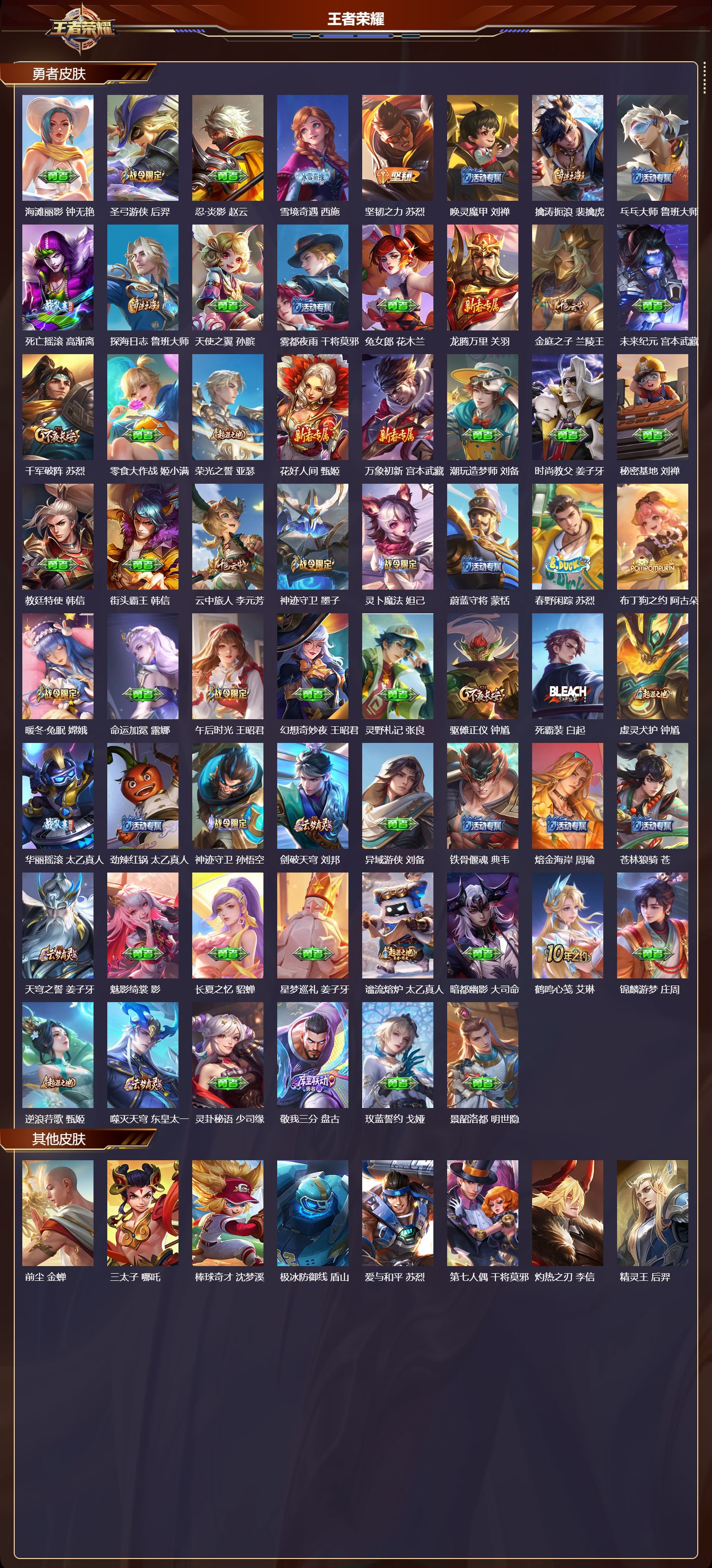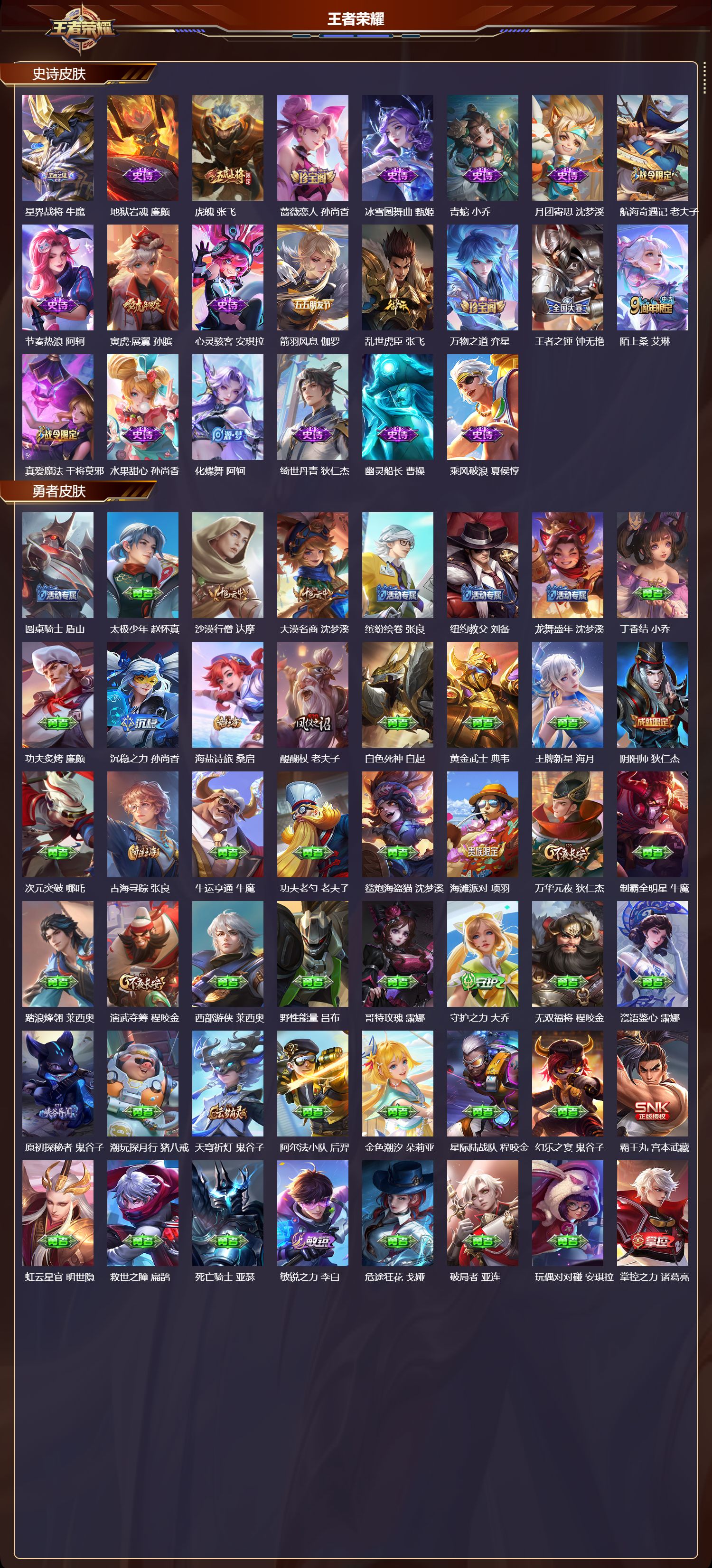 安卓qq/绝世王者/232皮肤/124英雄/1典藏/0珍品无双/0无双/1珍品传说/12传说/78史诗/9稀有英雄【1 珍品传说】怪盗基德 马可波罗【1 典藏皮肤】弑呛猎影 韩信【12 传说皮肤】无双飞将 马超李 曜补天 女娲落雪白狼 亚连异界灵契 孙尚香一念神魔 李信超时空战士 狄仁杰愿照·九州拓 澜神树通天 后羿愿照·岁时盈 虞姬鸣野蒿 桑启