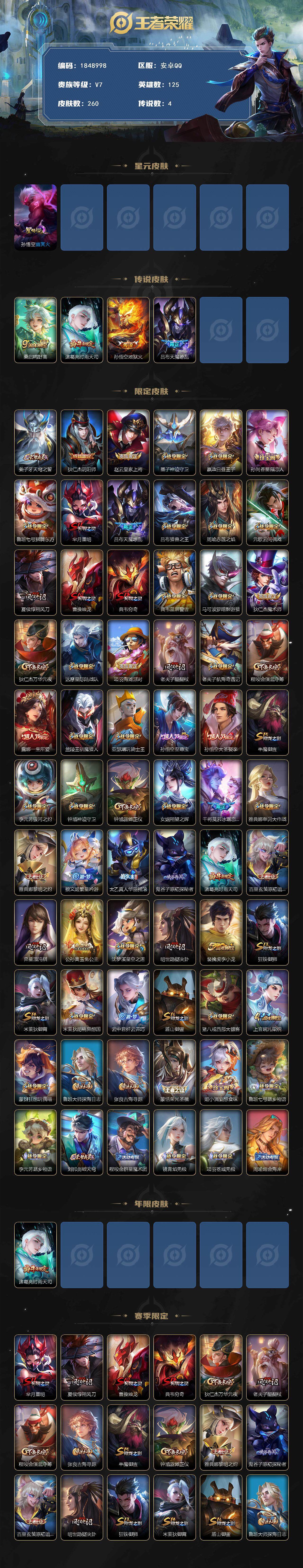 w11955,,可立即换绑无需挂单养号,,铭文满级,,传说4,,星传说1,,,按键1,,,夺宝326,,安卓q-v7-尊贵铂金ii段位-125英雄-260皮肤-4传说-67史诗 【英雄全皮】:钟馗全皮 【传说皮肤】:桑启鸣野蒿,诸葛亮时雨天司,孙悟空地狱火,吕布天魔缭乱 【限定皮肤】:姜子牙天穹之誓,狄仁杰阴阳师,赵云皇家上将,墨子神迹守卫,嬴政白昼王子,孙尚香蔷薇恋人,鲁班七号狮舞东方,芈月