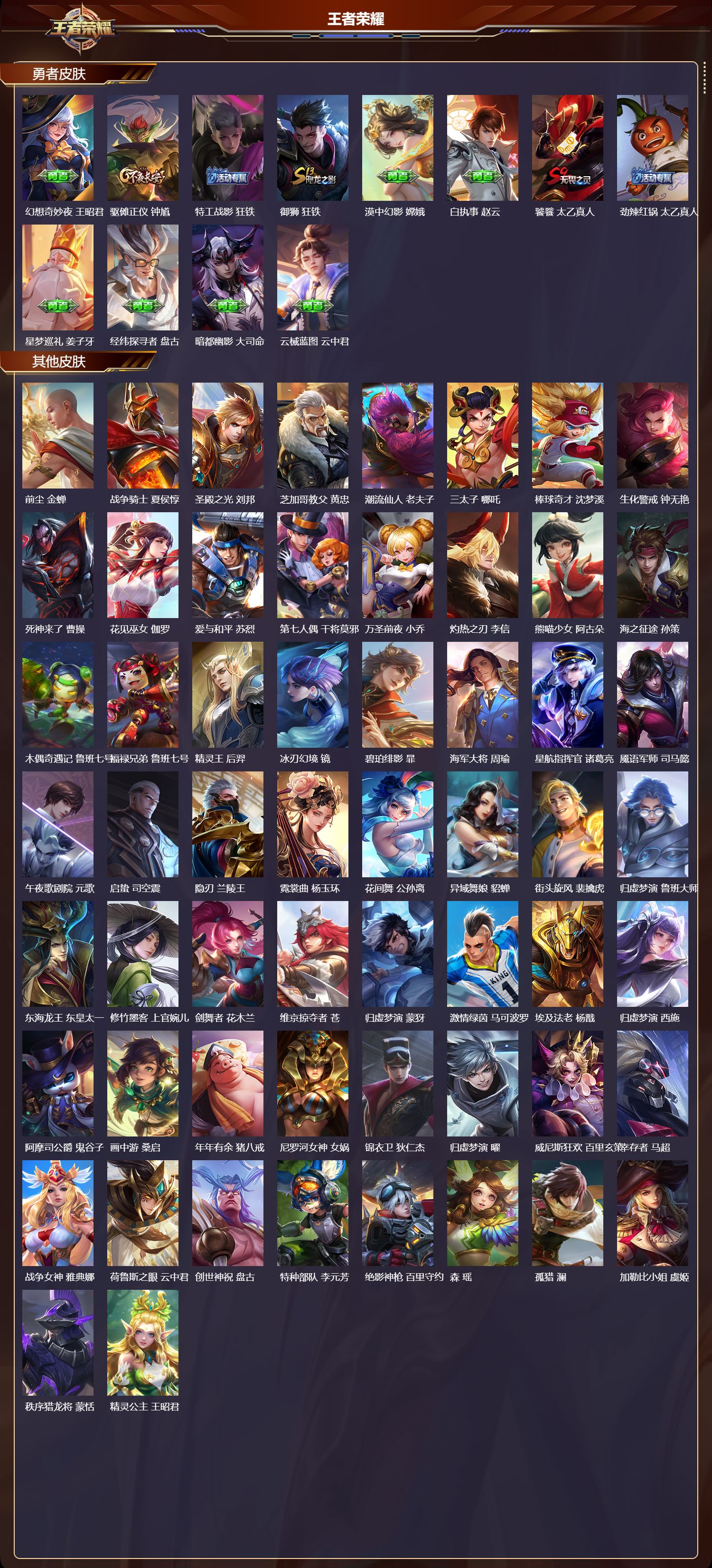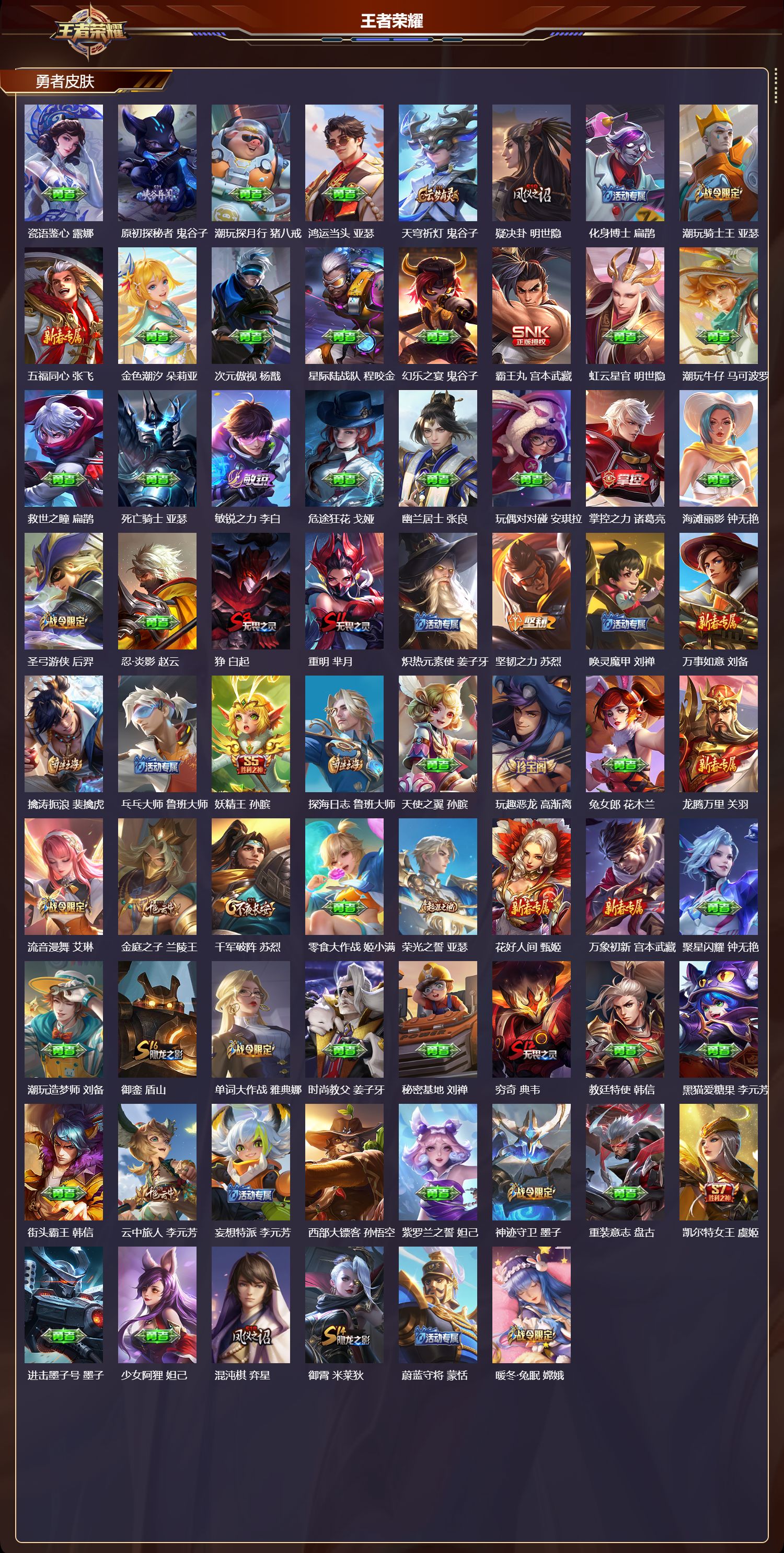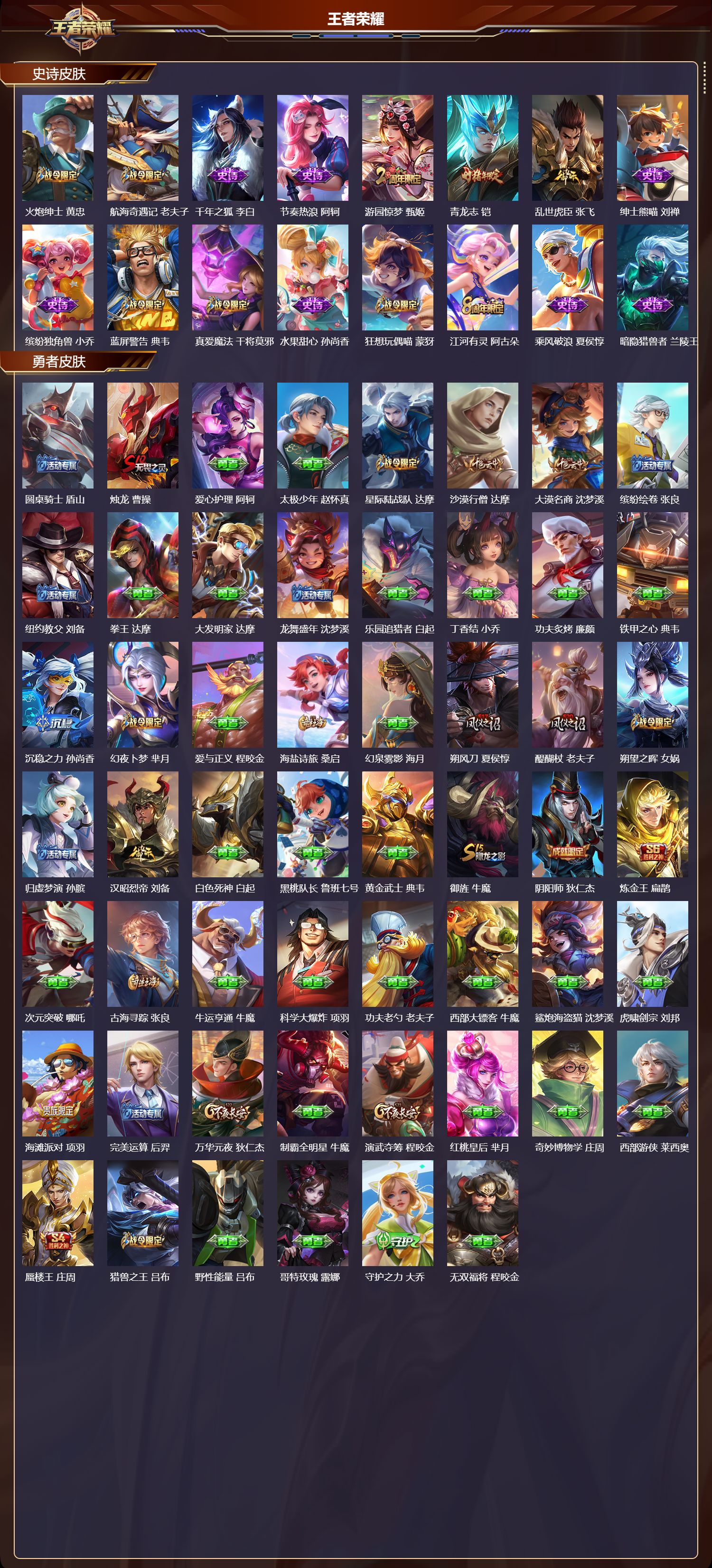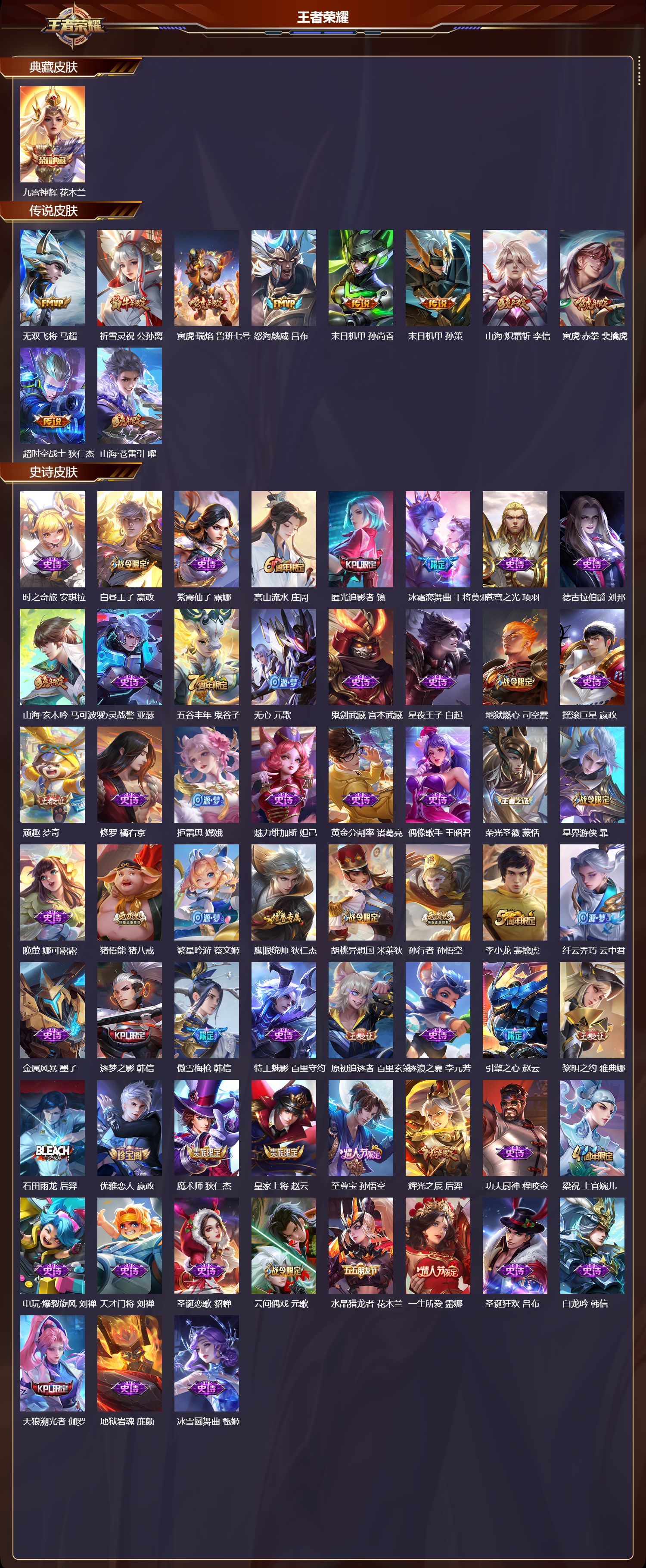 2304812-q/绝世王者/286皮肤/125英雄/1典藏/0珍品无双/0无双/0珍品传说/10传说/75史诗/7稀有英雄 【1 典藏皮肤】九霄神辉 花木兰 【10 传说皮肤】无双飞将 马超祈雪灵祝 公孙离寅虎·瑞焰 鲁班七号怒海麟威 吕布末日机甲 孙尚香末日机甲 孙策山海·炽霜斩 李信寅虎·赤拳 裴擒虎超时空战士 狄仁杰山海·苍雷引 曜 【75 史诗皮肤】时之奇旅