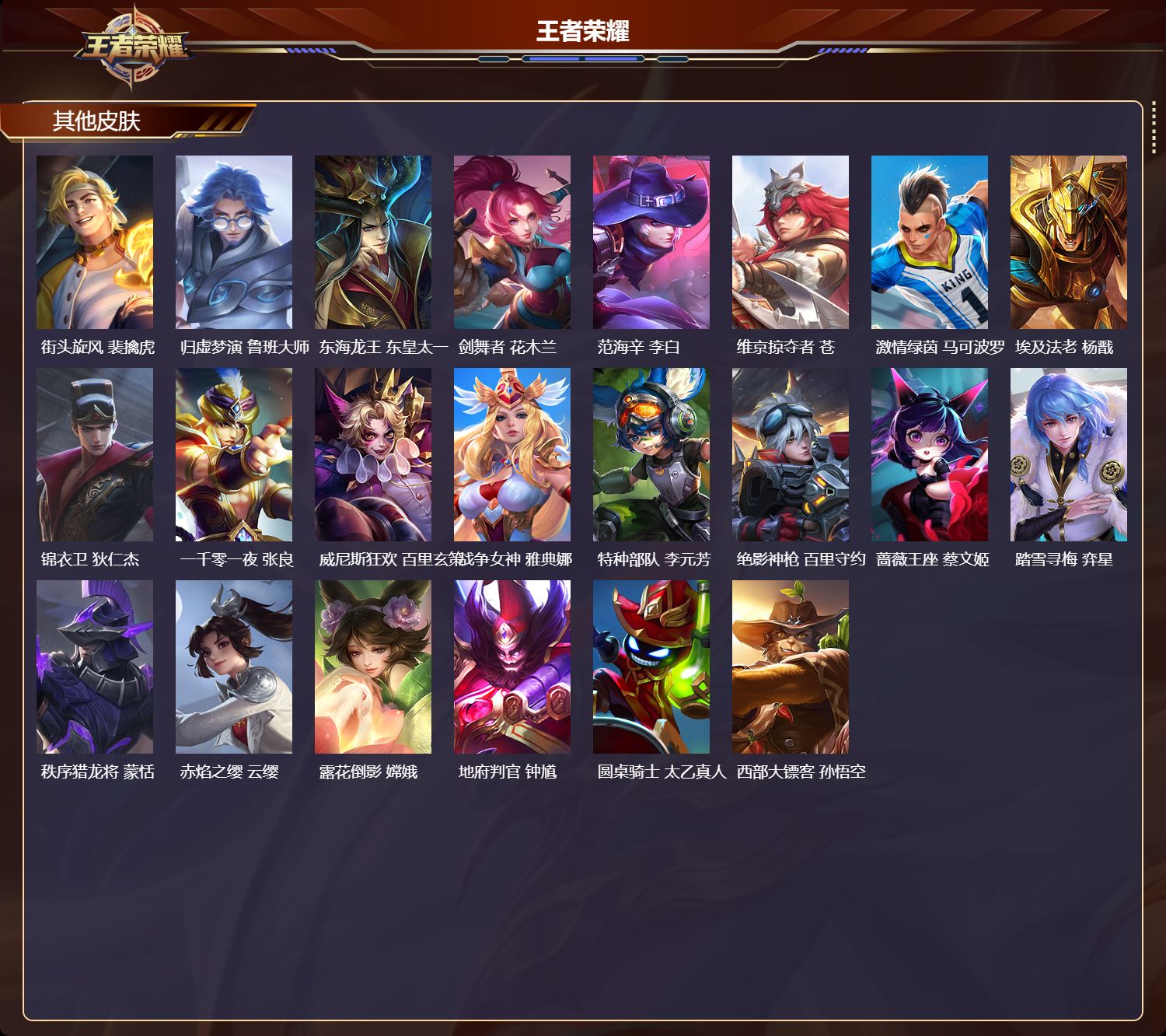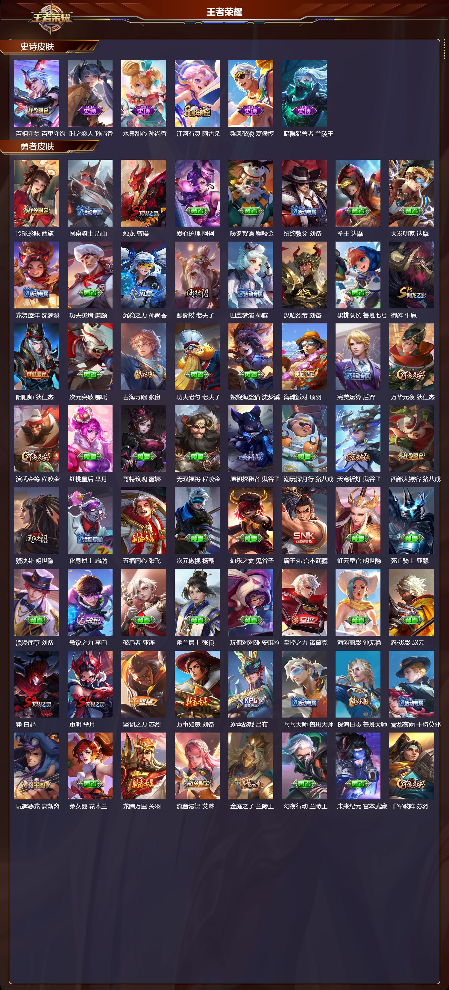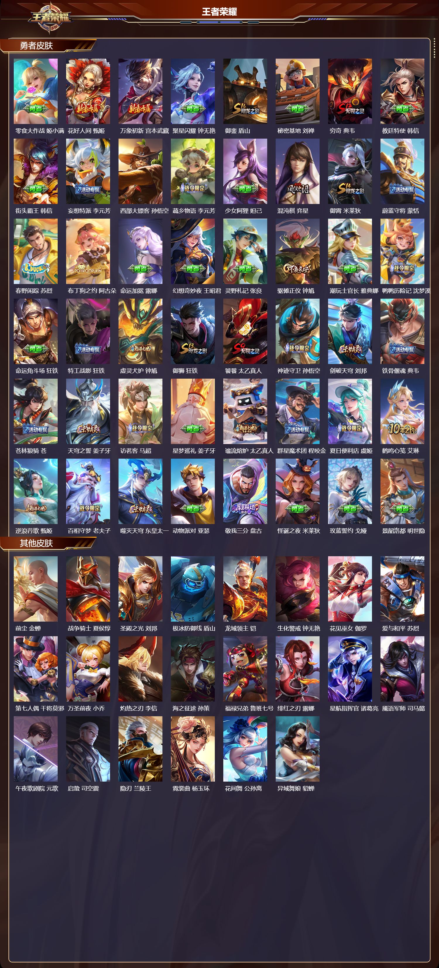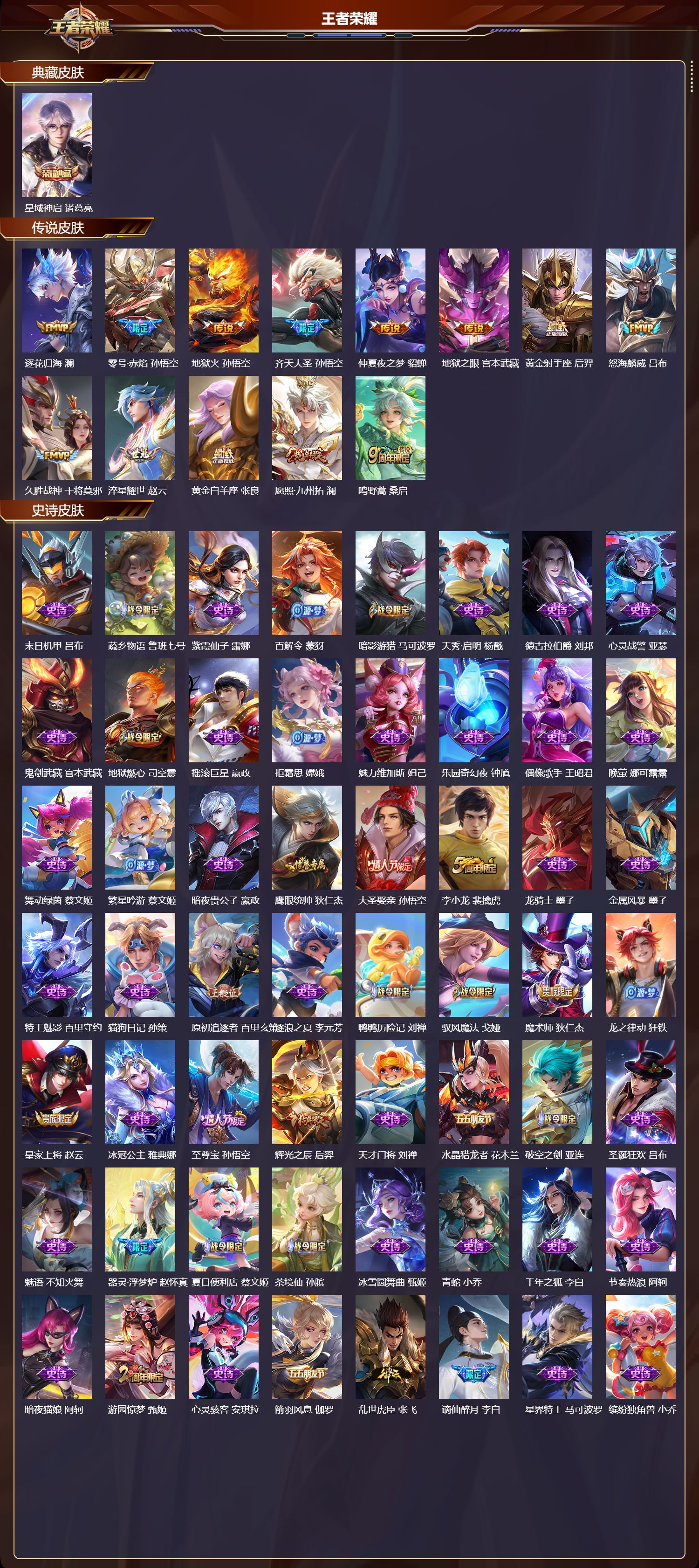 苹果qq/非凡王者/231皮肤/127英雄/1典藏/0珍品无双/0无双/0珍品传说/13传说/62史诗/9稀有英雄【1 典藏皮肤】星域神启 诸葛亮【13 传说皮肤】逐花归海 澜零号·赤焰 孙悟空地狱火 孙悟空齐天大圣 孙悟空仲夏夜之梦 貂蝉地狱之眼 宫本武藏黄金射手座 后羿怒海麟威 吕布久胜战神 干将莫邪淬星耀世 赵云黄金白羊座 张良愿照·九州拓 澜鸣野蒿 桑启【62