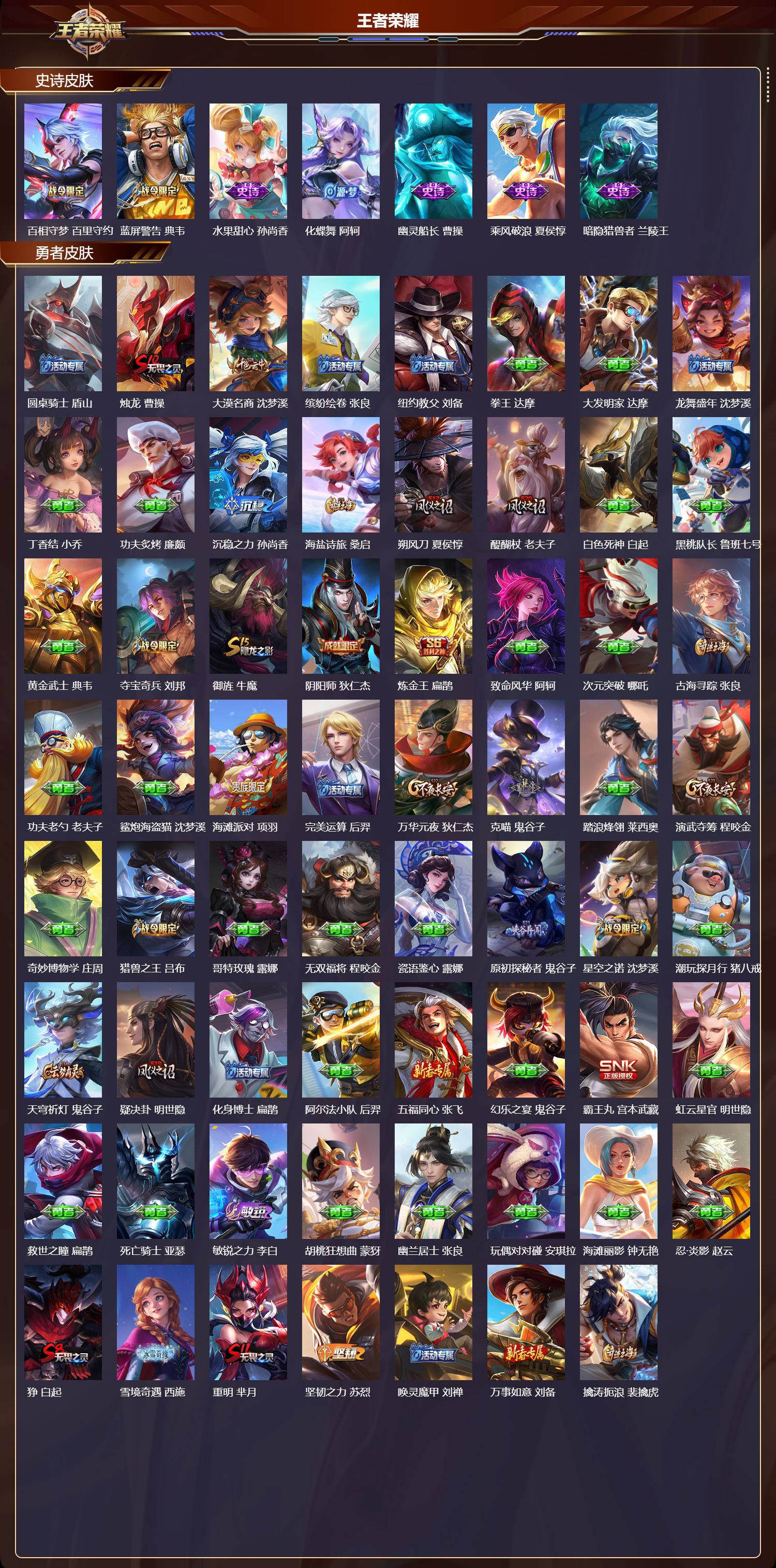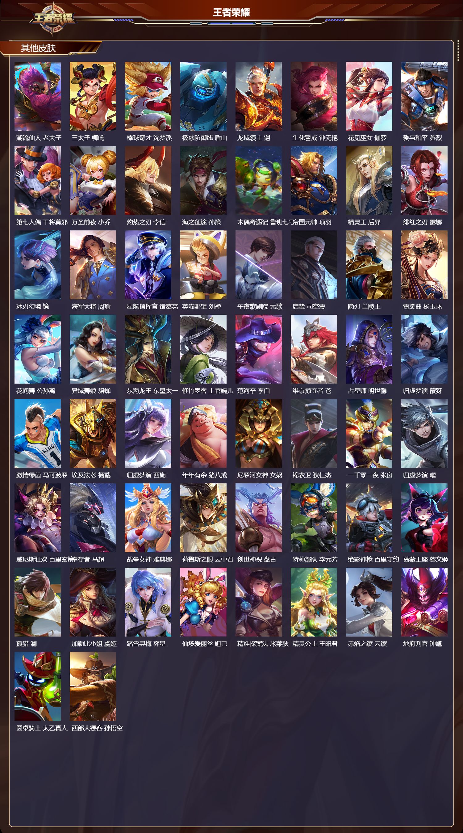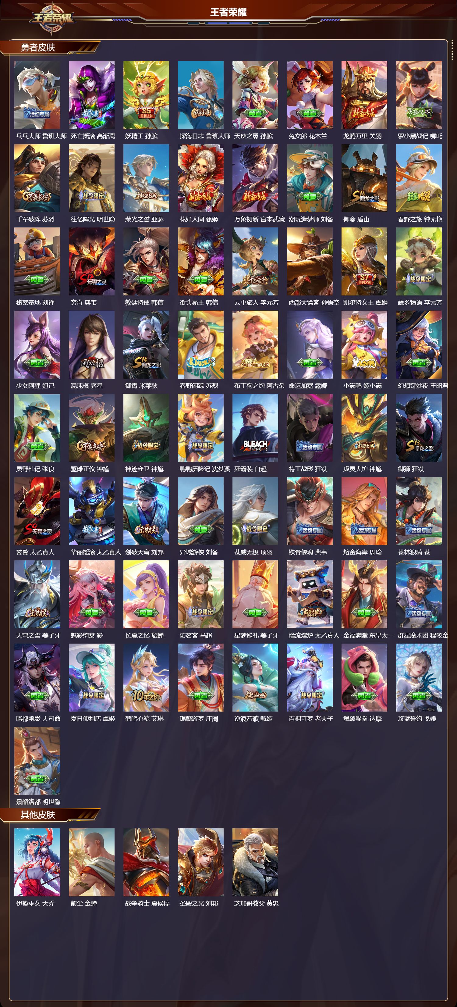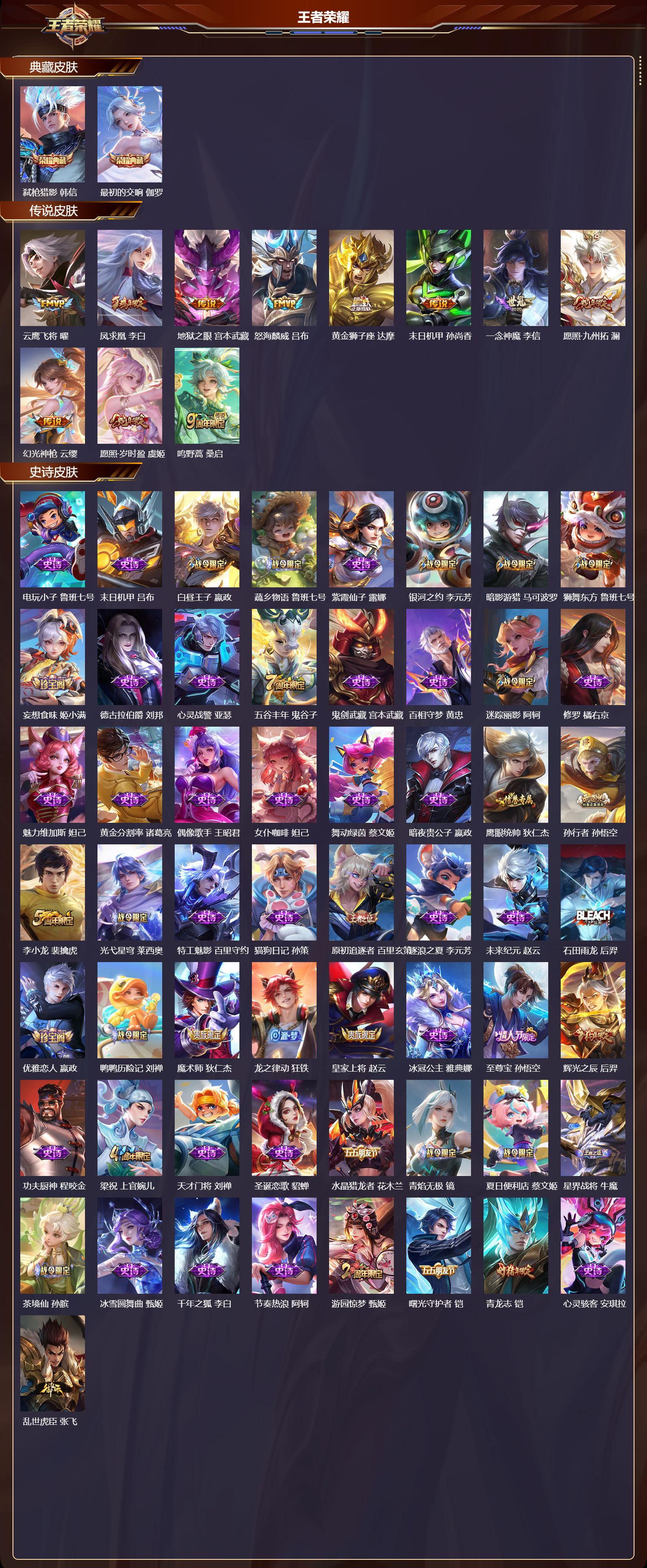 安卓qq/非凡王者/267皮肤/127英雄/2典藏/0珍品无双/0无双/0珍品传说/11传说/64史诗/9稀有英雄【2 典藏皮肤】弑呛猎影 韩信最初的交响 伽罗【11 传说皮肤】云鹰飞将 曜凤求凰 李白地狱之眼 宫本武藏怒海麟威 吕布黄金狮子座 达摩末日机甲 孙尚香一念神魔 李信愿照·九州拓 澜幻光神呛 云缨愿照·岁时盈 虞姬鸣野蒿 桑启【64 史诗皮肤】电玩小子 鲁班七