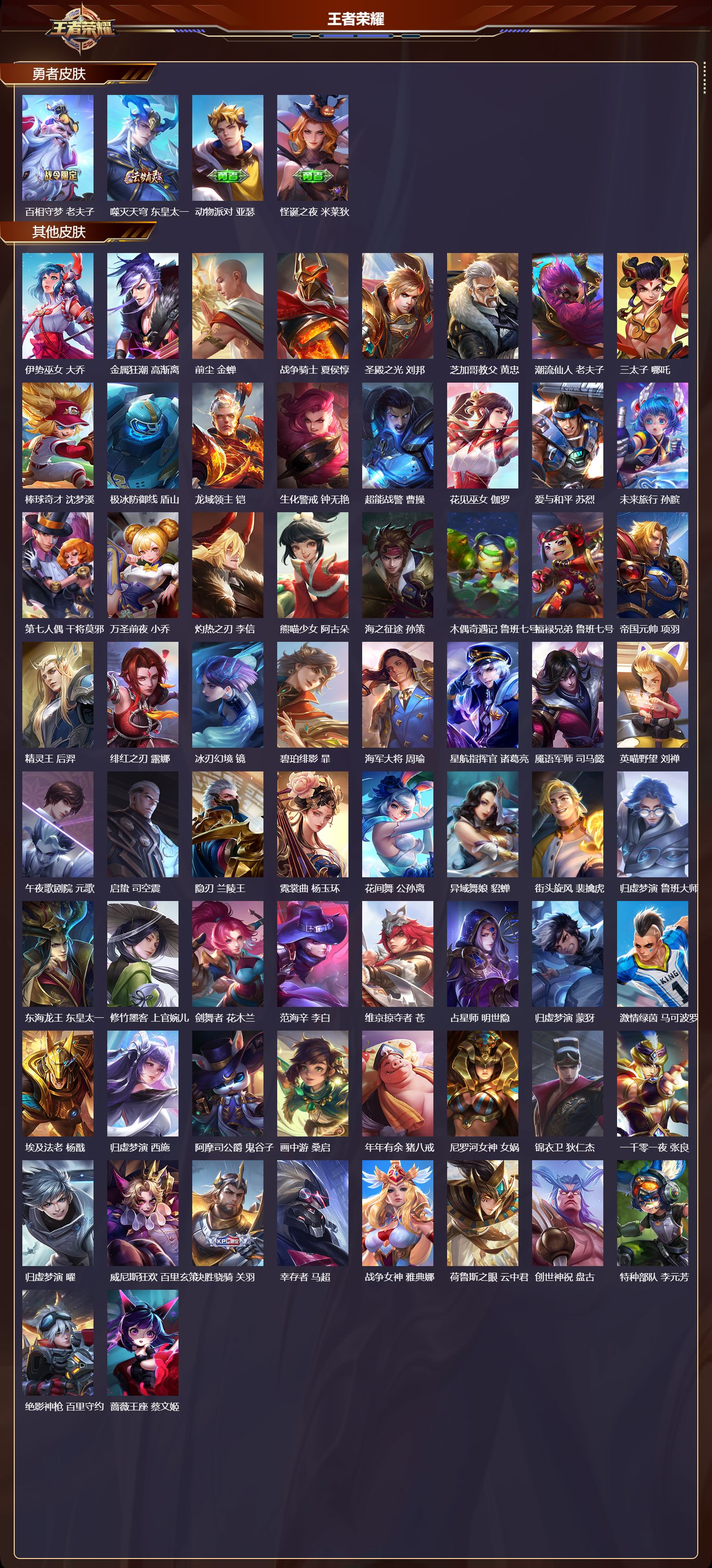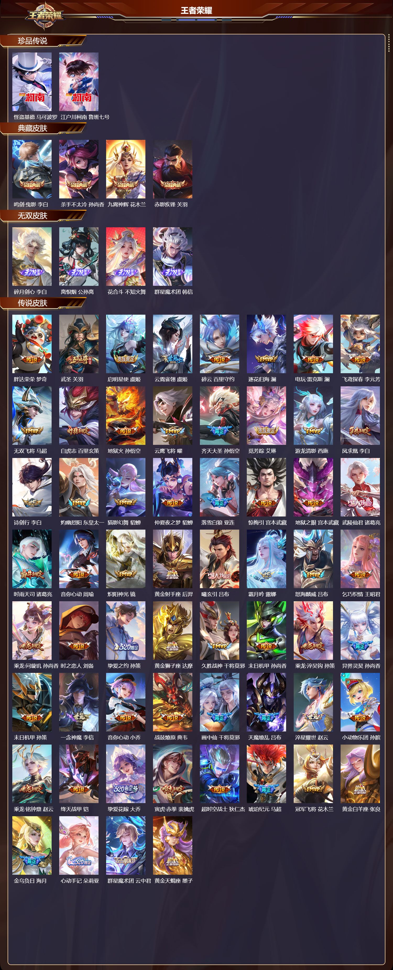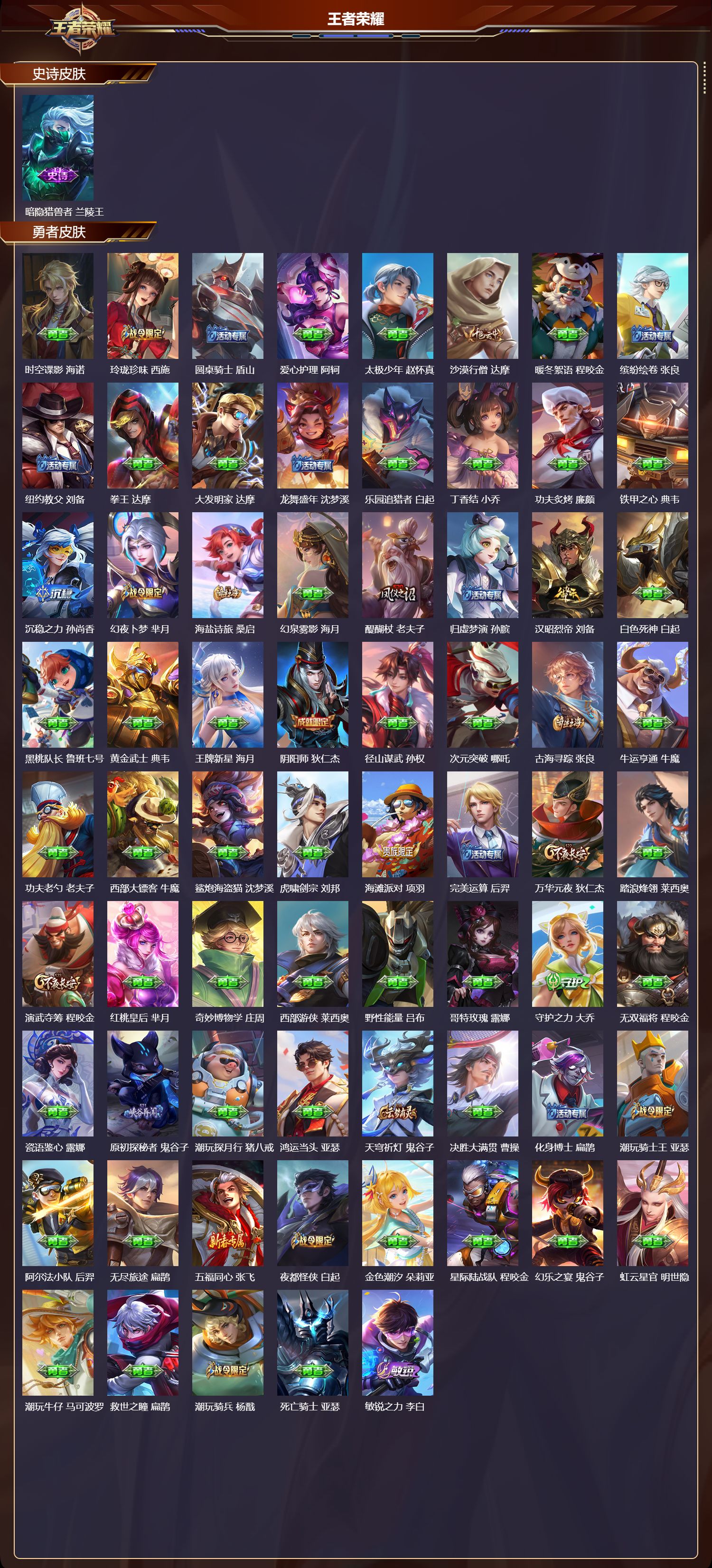 苹果qq/荣耀王者/432皮肤/127英雄/4典藏/0珍品无双/4无双/2珍品传说/62传说/139史诗/9稀有英雄【2 珍品传说】怪盗基德 马可波罗江户川柯南 鲁班七号【4 典藏皮肤】鸣剑·曳影 李白杀手不太冷 孙尚香九霄神辉 花木兰赤影疾锋 关羽【4 无双皮肤】碎月剑心 李白离恨烟 公孙离花合斗 不知火舞群星魔术团 韩信【62 传说皮肤】胖达荣荣 梦奇