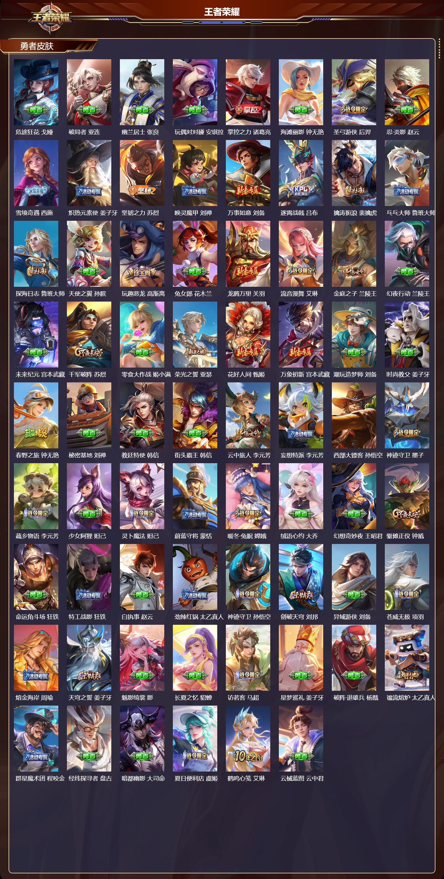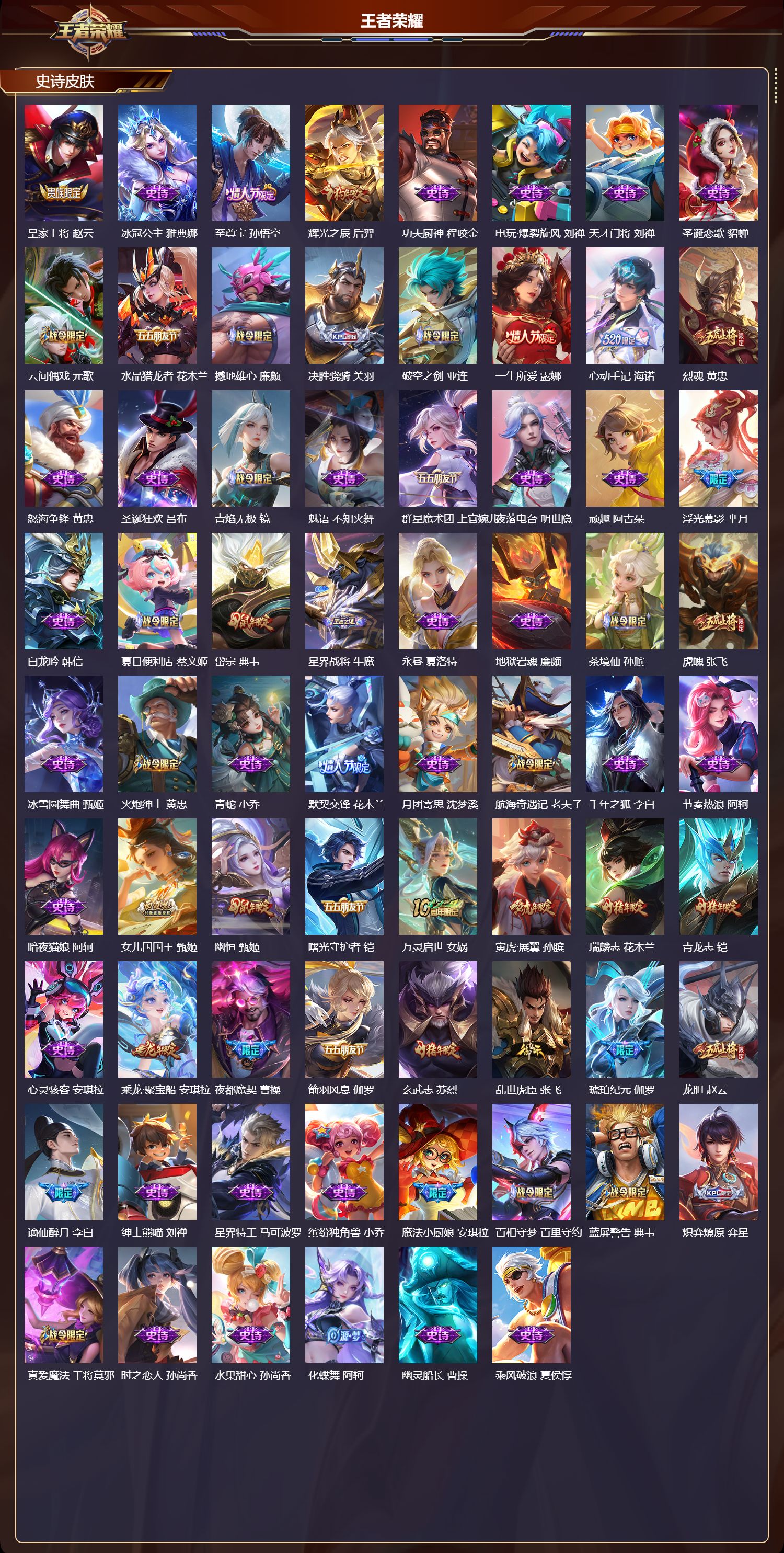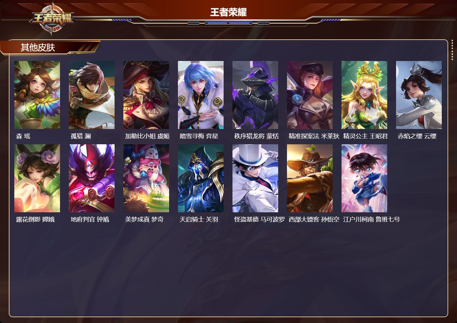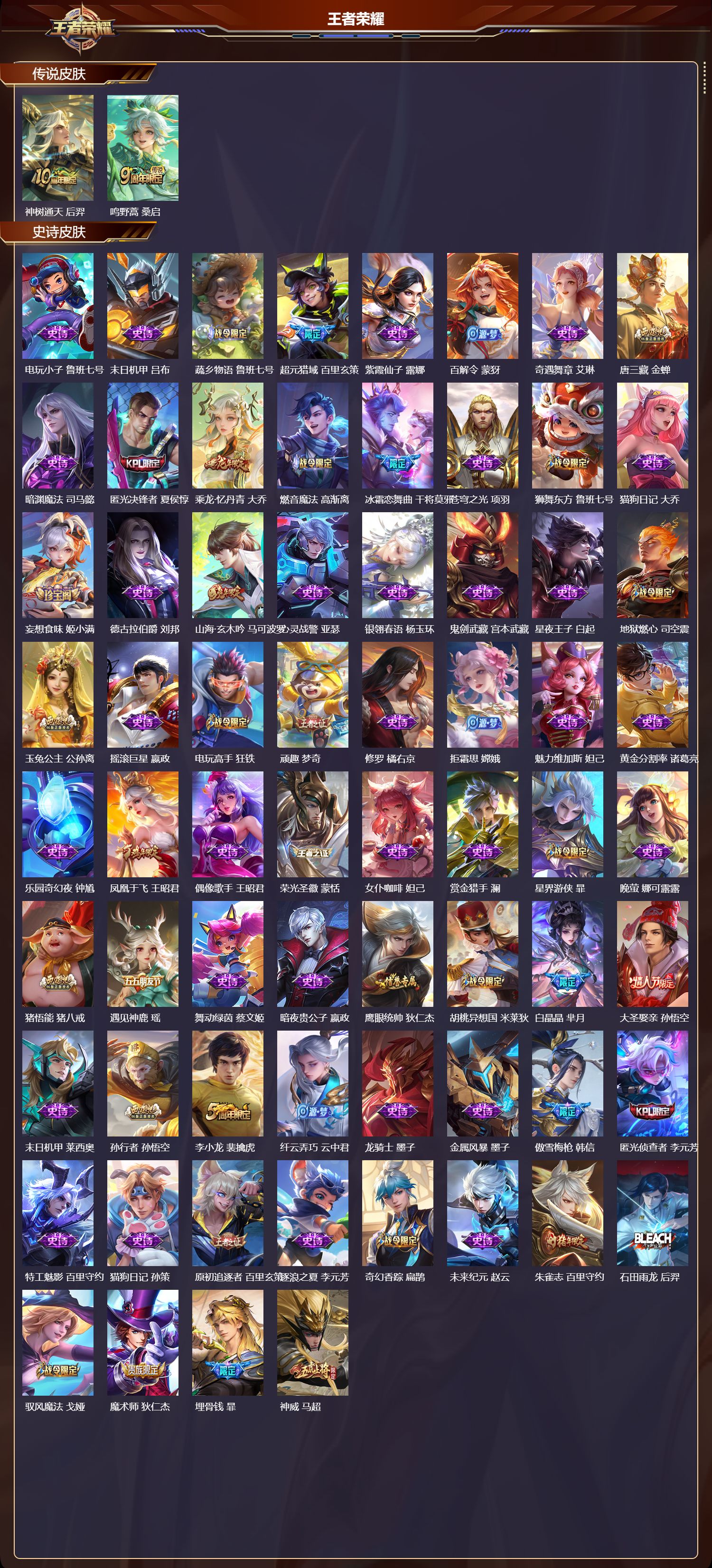 苹果qq/荣耀王者/432皮肤/127英雄/4典藏/0珍品无双/4无双/2珍品传说/62传说/139史诗/9稀有英雄【2 珍品传说】怪盗基德 马可波罗江户川柯南 鲁班七号【4 典藏皮肤】鸣剑·曳影 李白杀手不太冷 孙尚香九霄神辉 花木兰赤影疾锋 关羽【4 无双皮肤】碎月剑心 李白离恨烟 公孙离花合斗 不知火舞群星魔术团 韩信【62 传说皮肤】胖达荣荣 梦奇