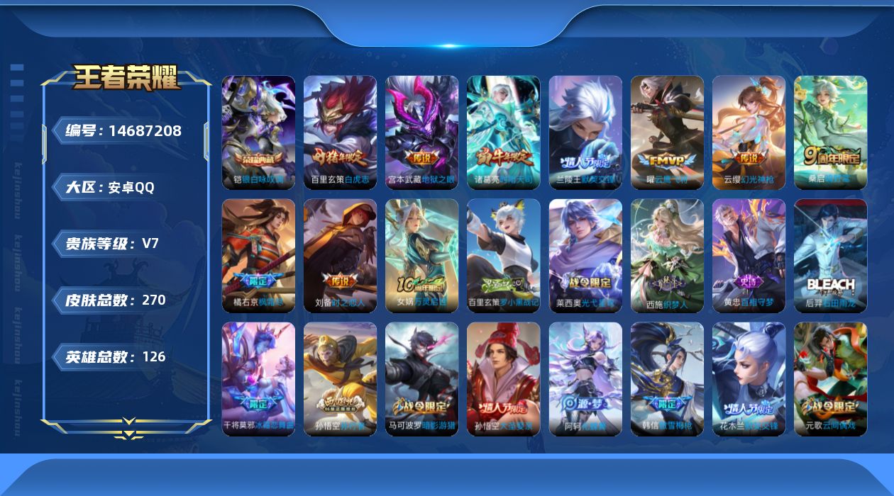 [14687208]安卓q-v7-最强王者段位-126英雄-270皮肤-1典藏-0珍品无双-0无双-0珍品传说-9传说-86史诗 【英雄全皮】:橘右京全皮,鬼谷子全皮,蒙恬全皮,影全皮 【荣耀典藏】:铠银白咏叹调 【传说皮肤】:云缨幻光神呛,桑启鸣野蒿,橘右京枫霜尽,兰陵王默契交锋,诸葛亮时雨天司,曜云鹰飞将,刘备时之恋人,百里玄策白虎志,宫本武藏地狱之眼 【限定皮肤】:大乔绒语心约,姜子牙天穹之誓,狄仁杰阴阳师,赵云皇家上将,赵云百木心呛,墨子神迹守卫,嬴政优雅恋人,孙尚香蔷薇恋人,庄周高山流水,阿轲迷踪丽影,芈月幻夜卜梦,吕布御风骁将,元歌云间偶戏,元歌无心,甄姬游园惊梦,马可波罗暗影游猎,狄仁杰魔术师,狄仁杰万华元夜,达摩沙漠行僧,项羽海滩派对,项羽霸王别姬,老夫子醍醐杖,老夫子航海奇遇记,程咬金演武夺筹,露娜一生所爱,刘邦夺宝奇兵,韩信傲雪梅呛,兰陵王默契交锋,兰陵王金庭之子,花木兰默契交锋,橘右京枫霜尽,亚瑟潮玩骑士王,孙悟空大圣娶亲,孙悟空孙行者,后羿圣弓游侠,李元芳云中旅人,虞姬霸王别姬,钟馗驱傩正仪,干将莫邪冰霜恋舞曲,干将莫邪真爱魔法,雅典娜单词大作战,雅典娜黎明之约,蔡文姬繁星吟游,鬼谷子原初探秘者,鬼谷子五谷丰年,诸葛亮时雨天司,黄忠火炮绅士,苏烈千军破阵,百里玄策白虎志,百里玄策原初追逐者,弈星混沌棋,梦奇顽趣,沈梦溪大漠名商,明世隐疑决卦,裴擒虎李小龙,裴擒虎擒涛扼浪,米莱狄胡桃异想国,云中君纤云弄巧,猪八戒西部大镖客,上官婉儿梁祝,嫦娥拒霜思,蒙犽狂想玩偶喵,鲁班大师探海日志,镜匿光追影者,桑启海盐诗旅,阿古朵江河有灵,张良古海寻踪,蒙恬荣光圣徽,鬼谷子天穹祈灯,姬小满妄想食味,沈梦溪龙舞盛年,刘邦剑破天穹,程咬金群星魔术团,周瑜熔金海岸 【年限皮肤】:百里玄策白虎志,吕布御风骁将,诸葛亮时雨天司 【赛季限定】:狄仁杰万华元夜,达摩沙漠行僧,老夫子醍醐杖,程咬金演武夺筹,兰陵王金庭之子,张良古海寻踪,李元芳云中旅人,钟馗驱傩正仪,雅典娜黎明之约,鬼谷子原初探秘者,苏烈千军破阵,百里玄策原初追逐者,弈星混沌棋,梦奇顽趣,沈梦溪大漠名商,明世隐疑决卦,裴擒虎擒涛扼浪,鲁班大师探海日志,桑启海盐诗旅,鬼谷子天穹祈灯,蒙恬荣光圣徽,刘邦剑破天穹,姜子牙天穹之誓 【战令限定】:墨子神迹守卫,阿轲迷踪丽影,芈月幻夜卜梦,元歌云间偶戏,马可波罗暗影游猎,老夫子航海奇遇记