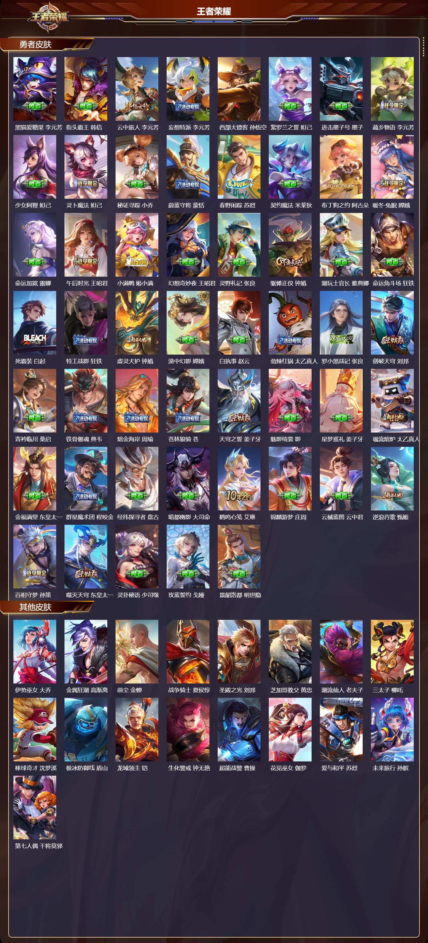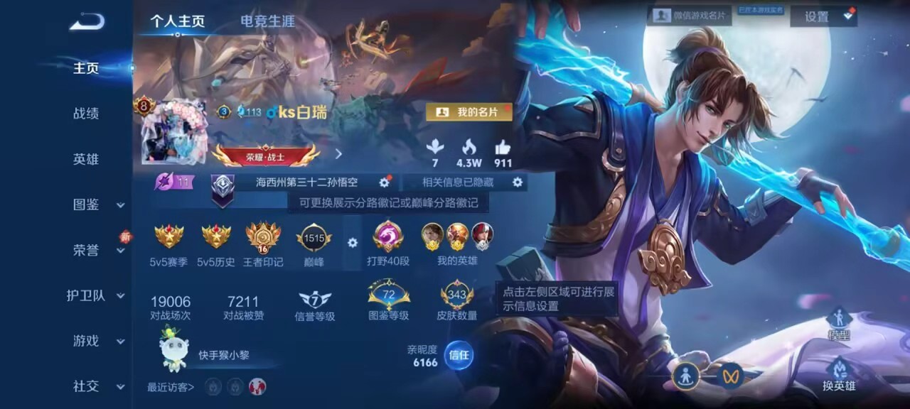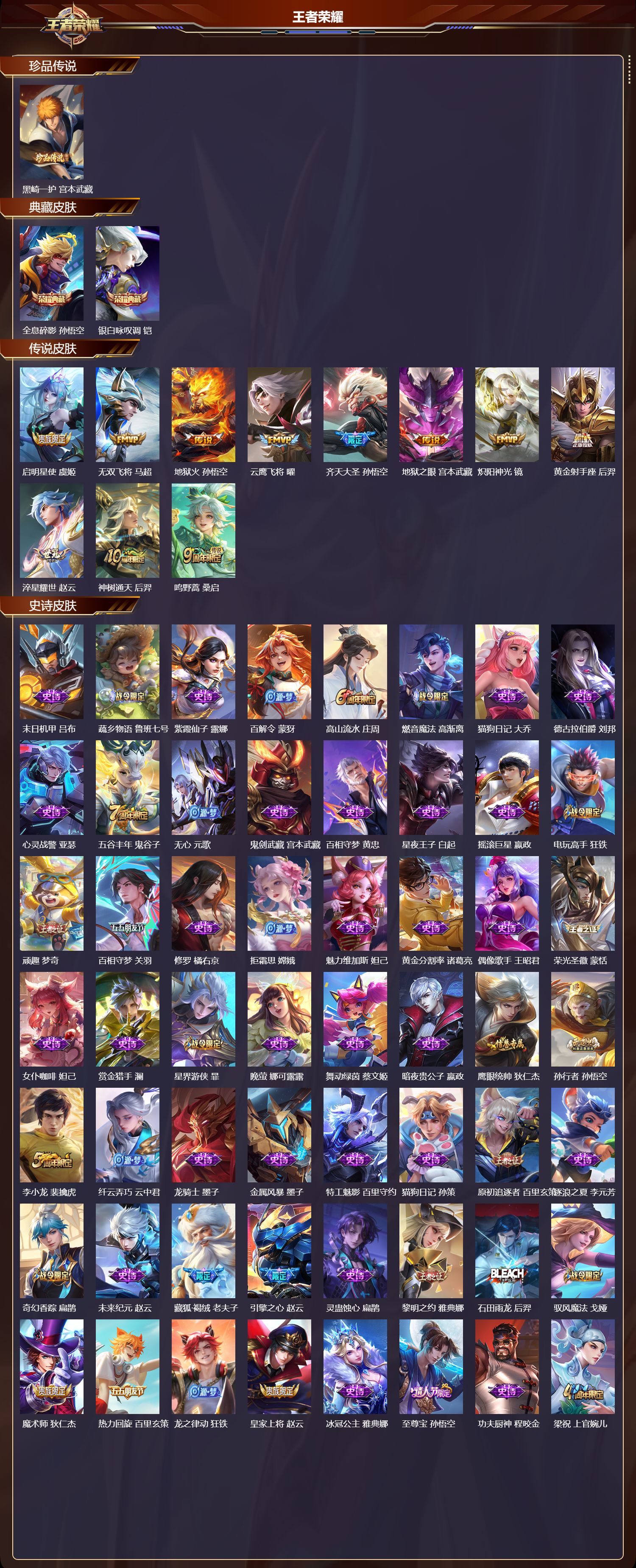 安卓微信/荣耀王者/343皮肤/126英雄/2典藏/0珍品无双/0无双/1珍品传说/11传说/93史诗/8稀有英雄【1 珍品传说】黑崎一护 宫本武藏【2 典藏皮肤】全息碎影 孙悟空银白咏叹调 铠【11 传说皮肤】启明星使 虞姬无双飞将 马超地狱火 孙悟空云鹰飞将 曜齐天大圣 孙悟空地狱之眼 宫本武藏炽阳神光 镜黄金射手座 后羿淬星耀世 赵云神树通天 后羿鸣野蒿 桑启【9